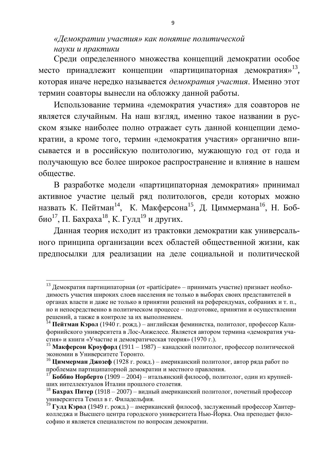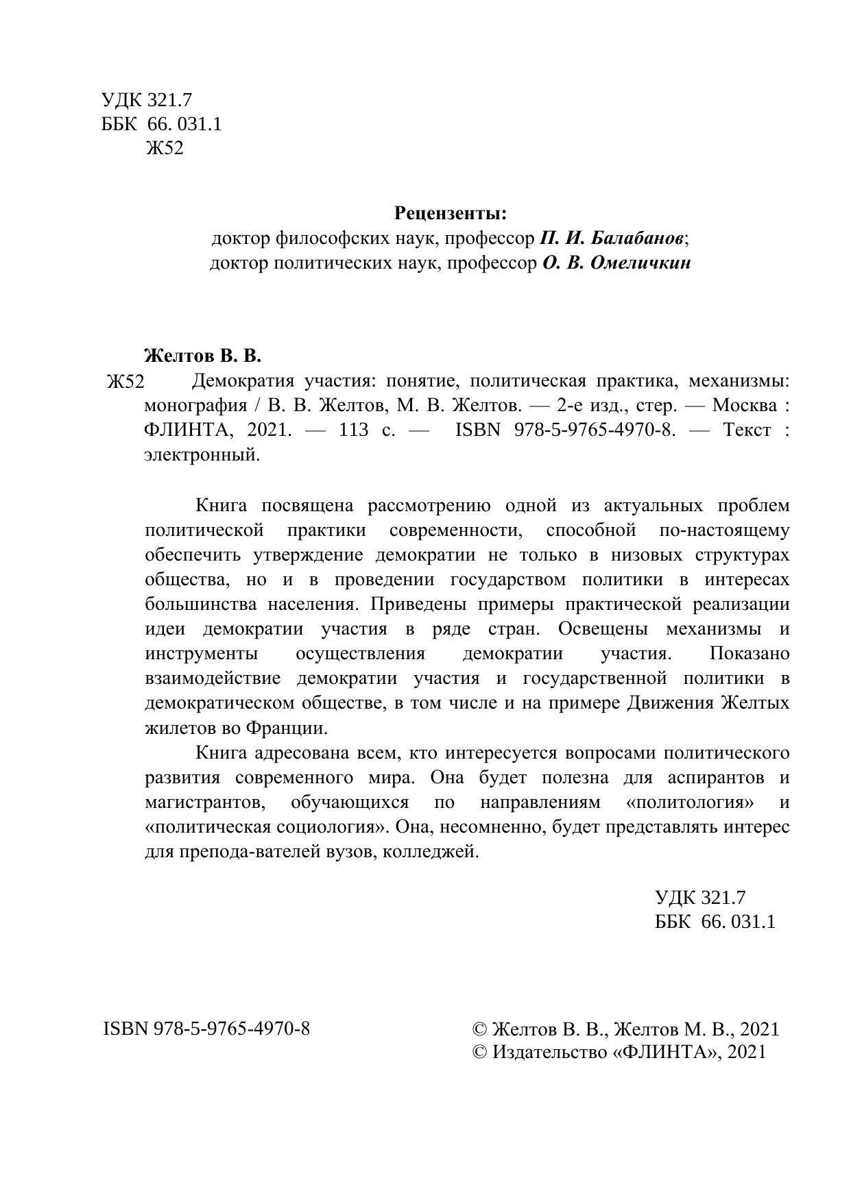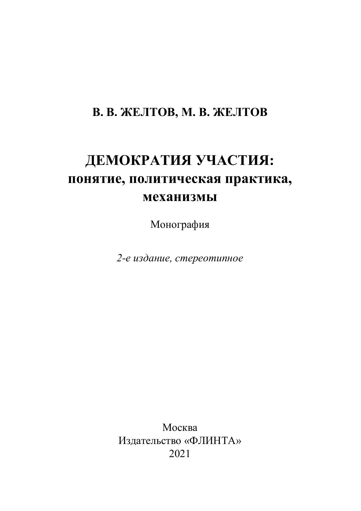 Книга посвящена рассмотрению одной из актуальных проблем политической практики современности, способной по-настоящему обеспечить утверждение демократии не только в низовых структурах общества, но и в проведении государством политики в интересах большинства населения. Приведены примеры практической реализации идеи демократии участия в ряде стран. Освещены механизмы и инструменты осуществления демократии участия. Показано взаимодействие демократии участия и государственной политики в демократическом обществе, в том числе и на примере Движения Желтых жилетов во Франции.