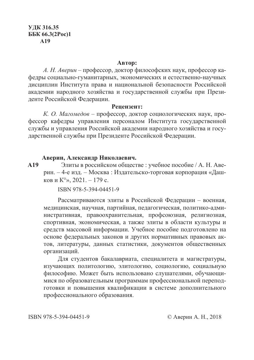 Рассматриваются элиты в Российской Федерации – военная, медицинская, научная, партийная, педагогическая, политико-административная, правоохранительная, профсоюзная, религиозная, спортивная, экономическая, а также элиты в области культуры и средств массовой информации. Учебное пособие подготовлено на основе федеральных законов и других нормативных правовых актов, литературы, данных статистики, документов общественных организаций. Для студентов бакалавриата, специалитета и магистратуры, изучающих политологию, элитологию, социологию, социальную философию. Может быть использовано слушателями, обучающимися по образовательным программам профессиональной переподготовки и повышения квалификации в системе дополнительного профессионального образования.