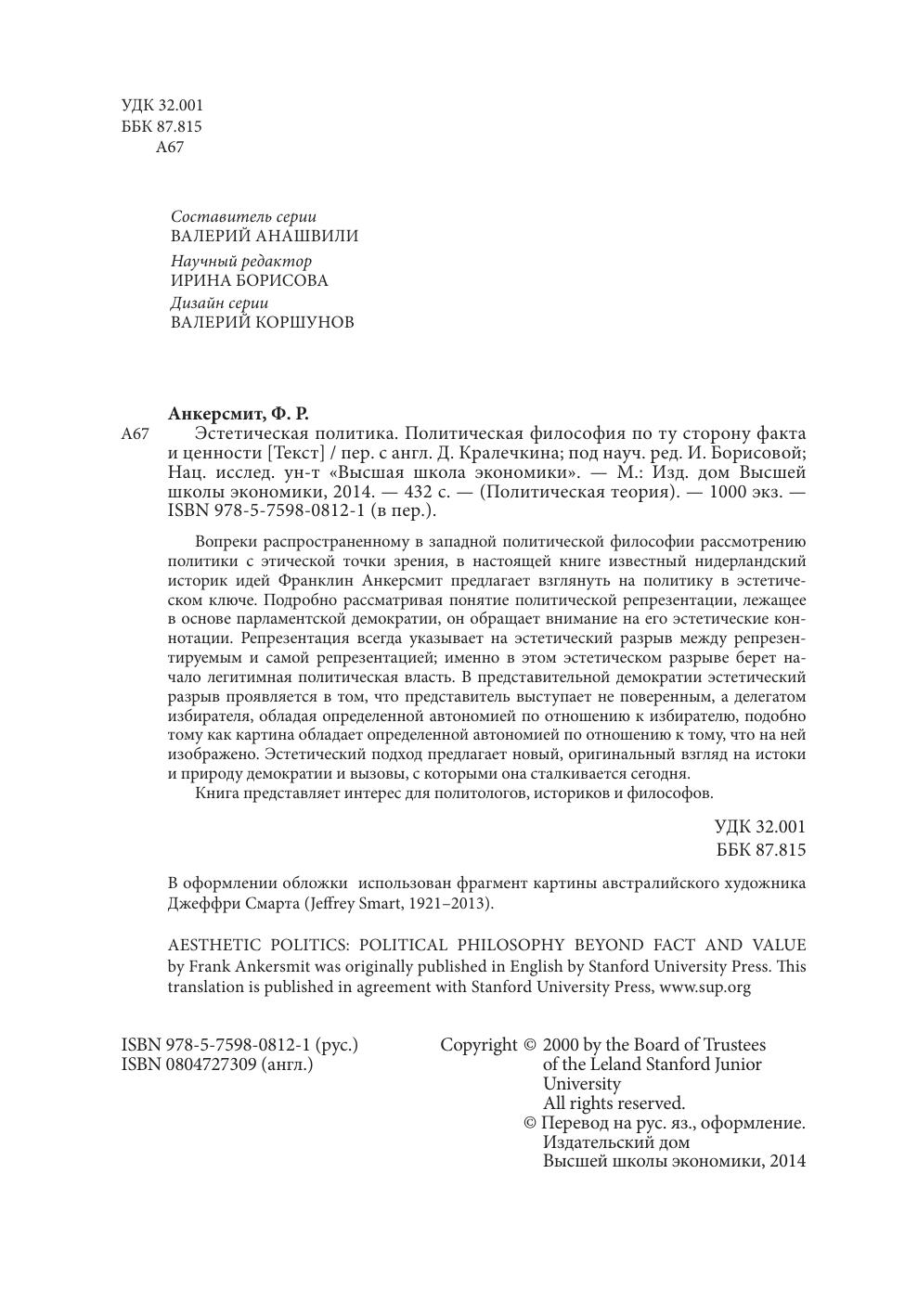 Вопреки распространенному в западной политической философии рассмотрению политики с этической точки зрения, в настоящей книге известный нидерландский историк идей Франклин Анкерсмит предлагает взглянуть на политику в эстетическом ключе. Подробно рассматривая понятие политической репрезентации, лежащее в основе парламентской демократии, он обращает внимание на его эстетические коннотации. Репрезентация всегда указывает на эстетический разрыв между репрезентируемым и самой репрезентацией; именно в этом эстетическом разрыве берет начало легитимная политическая власть. В представительной демократии эстетический разрыв проявляется в том, что представитель выступает не поверенным, а делегатом избирателя, обладая определенной автономией по отношению к избирателю, подобно тому как картина обладает определенной автономией по отношению к тому, что на ней изображено. Эстетический подход предлагает новый, оригинальный взгляд на истоки и природу демократии и вызовы, с которыми она сталкивается сегодня. Книга представляет интерес для политологов, историков и философов.