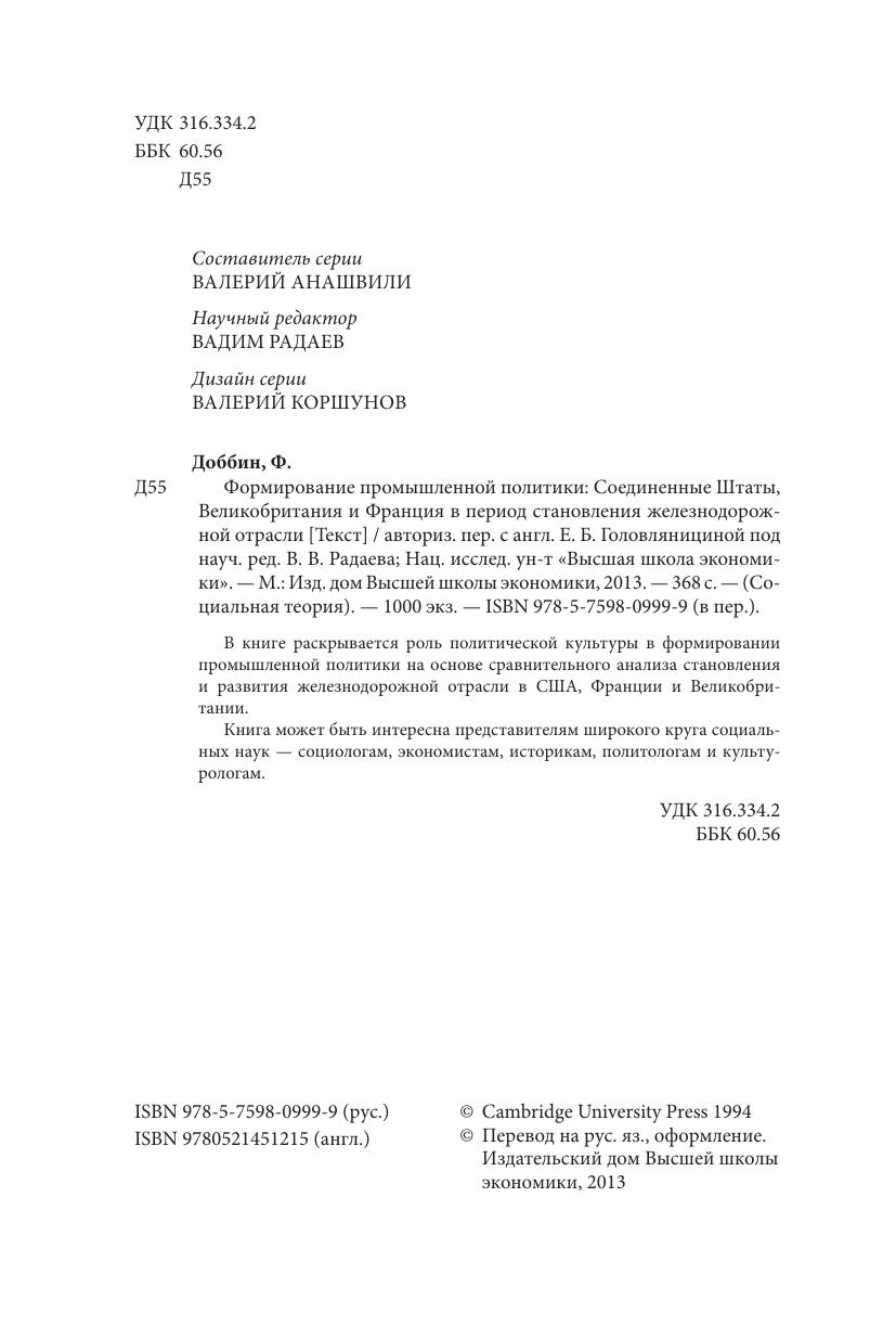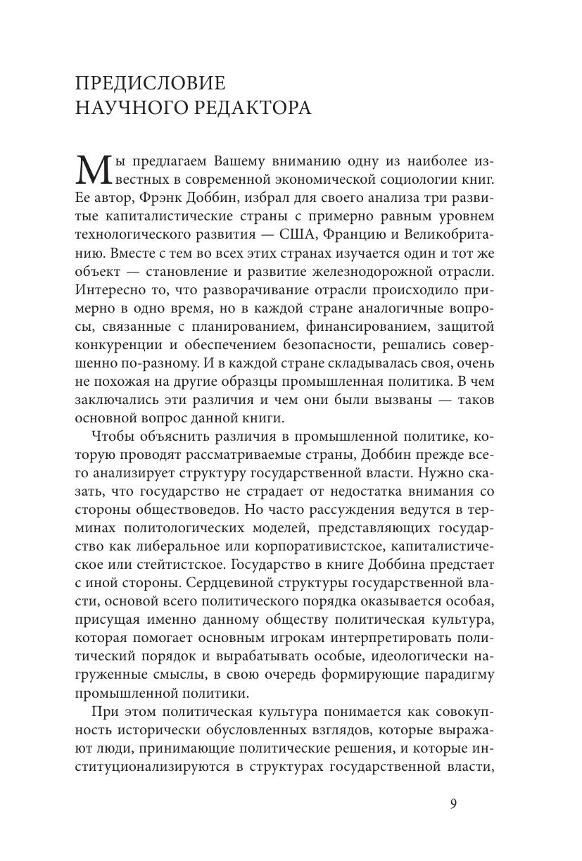 В книге раскрывается роль политической культуры в формировании промышленной политики на основе сравнительного анализа становления и развития железнодорожной отрасли в США, Франции и Великобритании. Книга может быть интересна представителям широкого круга социальных наук — социологам, экономистам, историкам, политологам и культурологам.