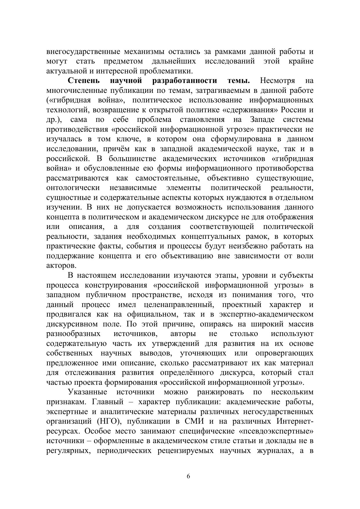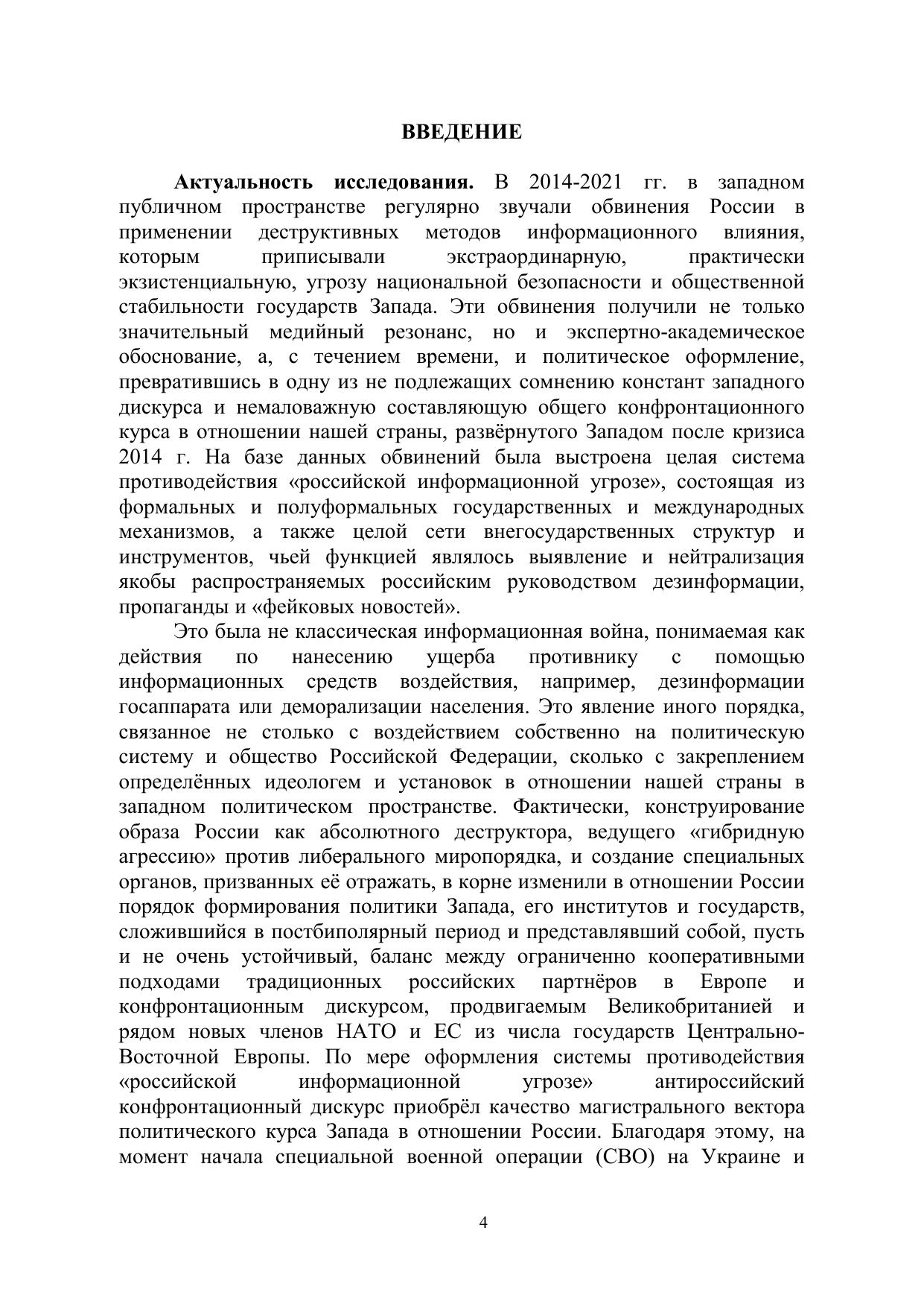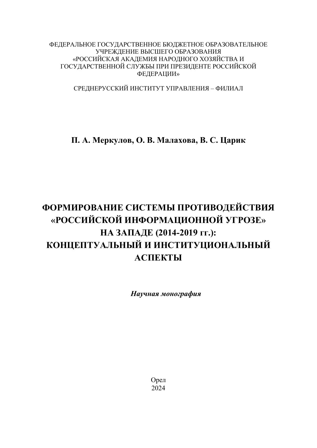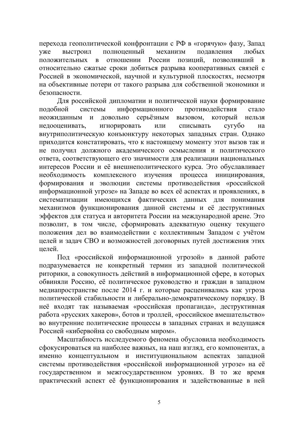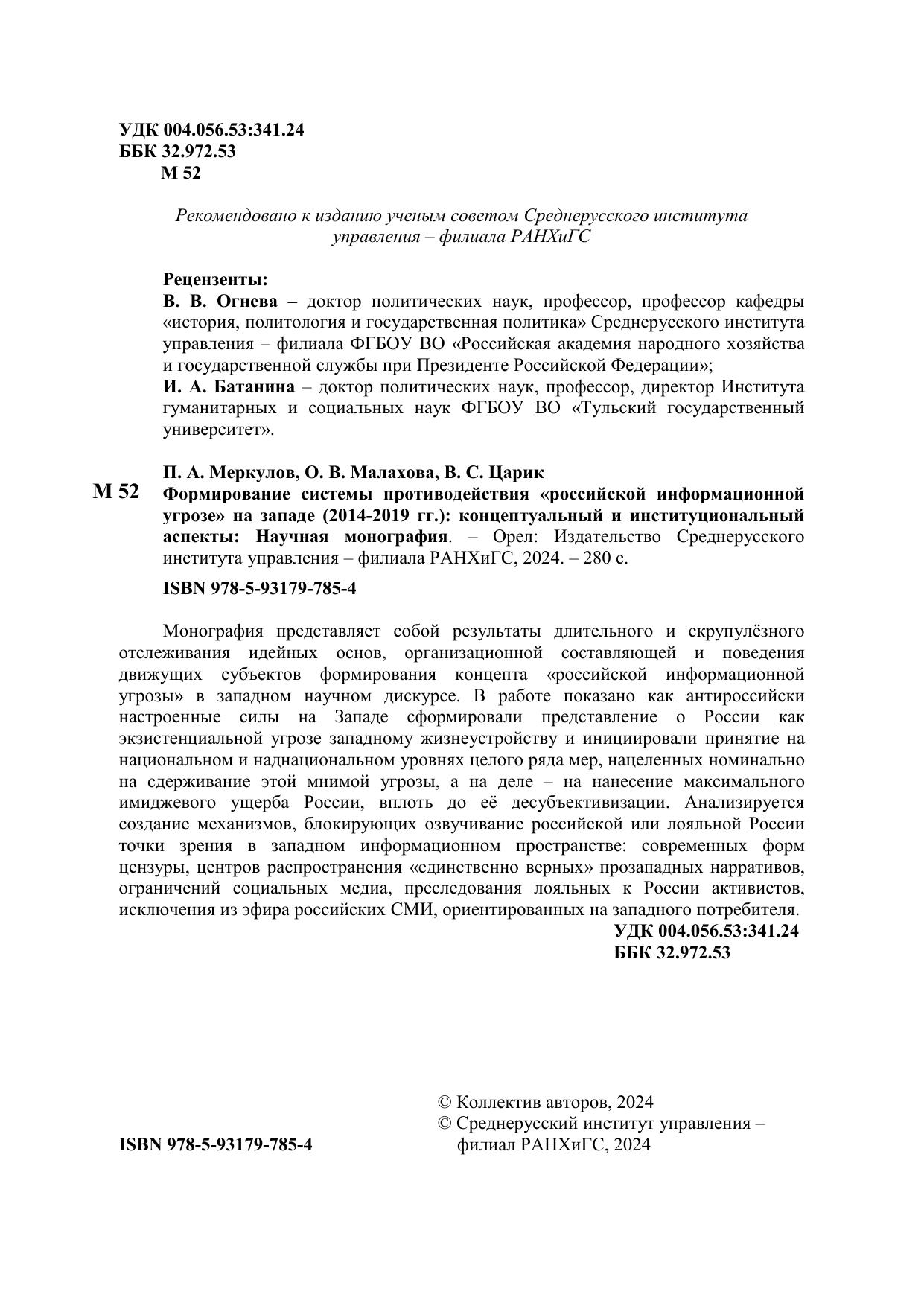 Монография представляет собой результаты длительного и скрупулёзного отслеживания идейных основ, организационной составляющей и поведения движущих субъектов формирования концепта «российской информационной угрозы» в западном научном дискурсе. В работе показано как антироссийски настроенные силы на Западе сформировали представление о России как экзистенциальной угрозе западному жизнеустройству и инициировали принятие на национальном и наднациональном уровнях целого ряда мер, нацеленных номинально на сдерживание этой мнимой угрозы, а на деле – на нанесение максимального имиджевого ущерба России, вплоть до её десубъективизации. Анализируется создание механизмов, блокирующих озвучивание российской или лояльной России точки зрения в западном информационном пространстве: современных форм цензуры, центров распространения «единственно верных» прозападных нарративов, ограничений социальных медиа, преследования лояльных к России активистов, исключения из эфира российских СМИ, ориентированных на западного потребителя.