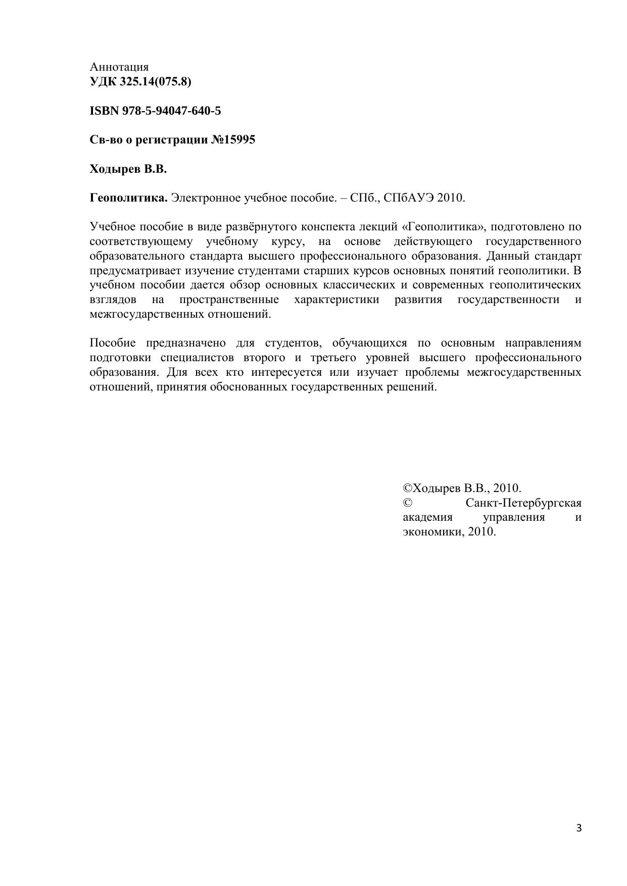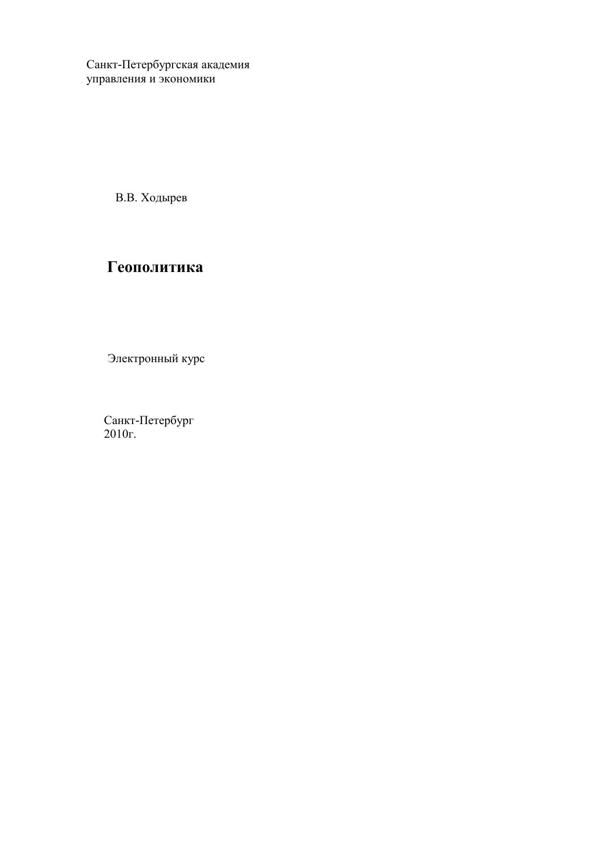 Учебное пособие в виде развёрнутого конспекта лекций «Геополитика», подготовлено по соответствующему учебному курсу, на основе действующего государственного образовательного стандарта высшего профессионального образования. Данный стандарт предусматривает изучение студентами старших курсов основных понятий геополитики. В учебном пособии дается обзор основных классических и современных геополитических взглядов на пространственные характеристики развития государственности и межгосударственных отношений. Пособие предназначено для студентов, обучающихся по основным направлениям подготовки специалистов второго и третьего уровней высшего профессионального образования. Для всех кто интересуется или изучает проблемы межгосударственных отношений, принятия обоснованных государственных решений. Электронное учебное пособие для дистанционного обучения
