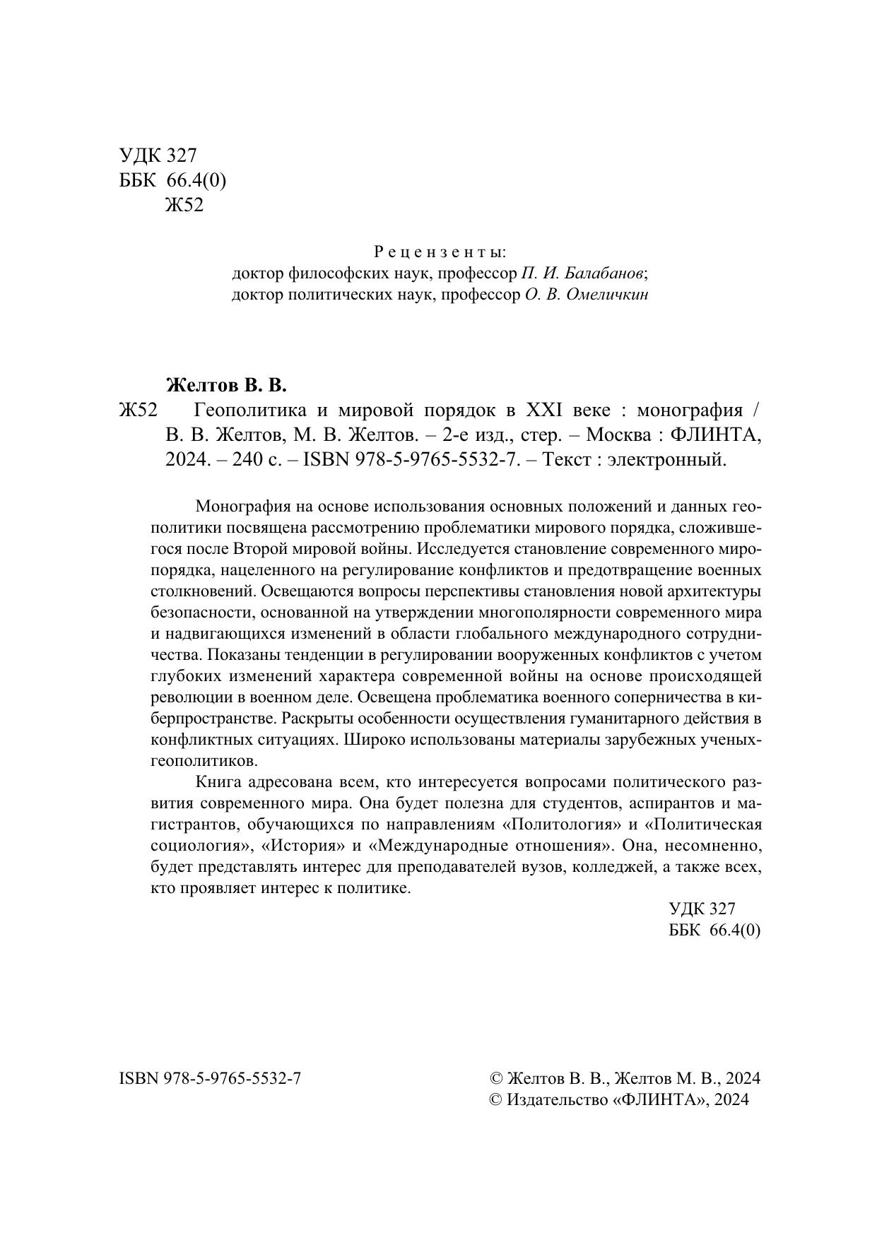 Монография на основе использования основных положений и данных геополитики посвящена рассмотрению проблематики мирового порядка, сложившегося после Второй мировой войны. Исследуется становление современного миропорядка, нацеленного на регулирование конфликтов и предотвращение военных столкновений. Освещаются вопросы перспективы становления новой архитектуры безопасности, основанной на утверждении многополярности современного мира и надвигающихся изменений в области глобального международного сотрудничества. Показаны тенденции в регулировании вооруженных конфликтов с учетом глубоких изменений характера современной войны на основе происходящей революции в военном деле. Освещена проблематика военного соперничества в киберпространстве. Раскрыты особенности осуществления гуманитарного действия в конфликтных ситуациях. Широко использованы материалы зарубежных ученых-геополитиков.