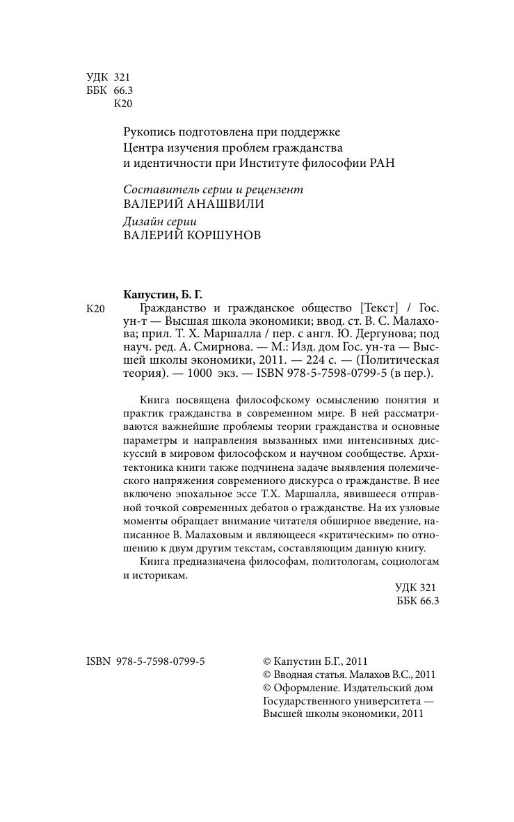 Книга посвящена философскому осмыслению понятия и практик гражданства в современном мире. В ней рассматриваются важнейшие проблемы теории гражданства и основные параметры и направления вызванных ими интенсивных дискуссий в мировом философском и научном сообществе. Архитектоника книги также подчинена задаче выявления полемического напряжения современного дискурса о гражданстве. В нее включено эпохальное эссе Т.Х. Маршалла, явившееся отправной точкой современных дебатов о гражданстве. На их узловые моменты обращает внимание читателя обширное введение, написанное В. Малаховым и являющееся «критическим» по отношению к двум другим текстам, составляющим данную книгу. Книга предназначена философам, политологам, социологам и историкам.