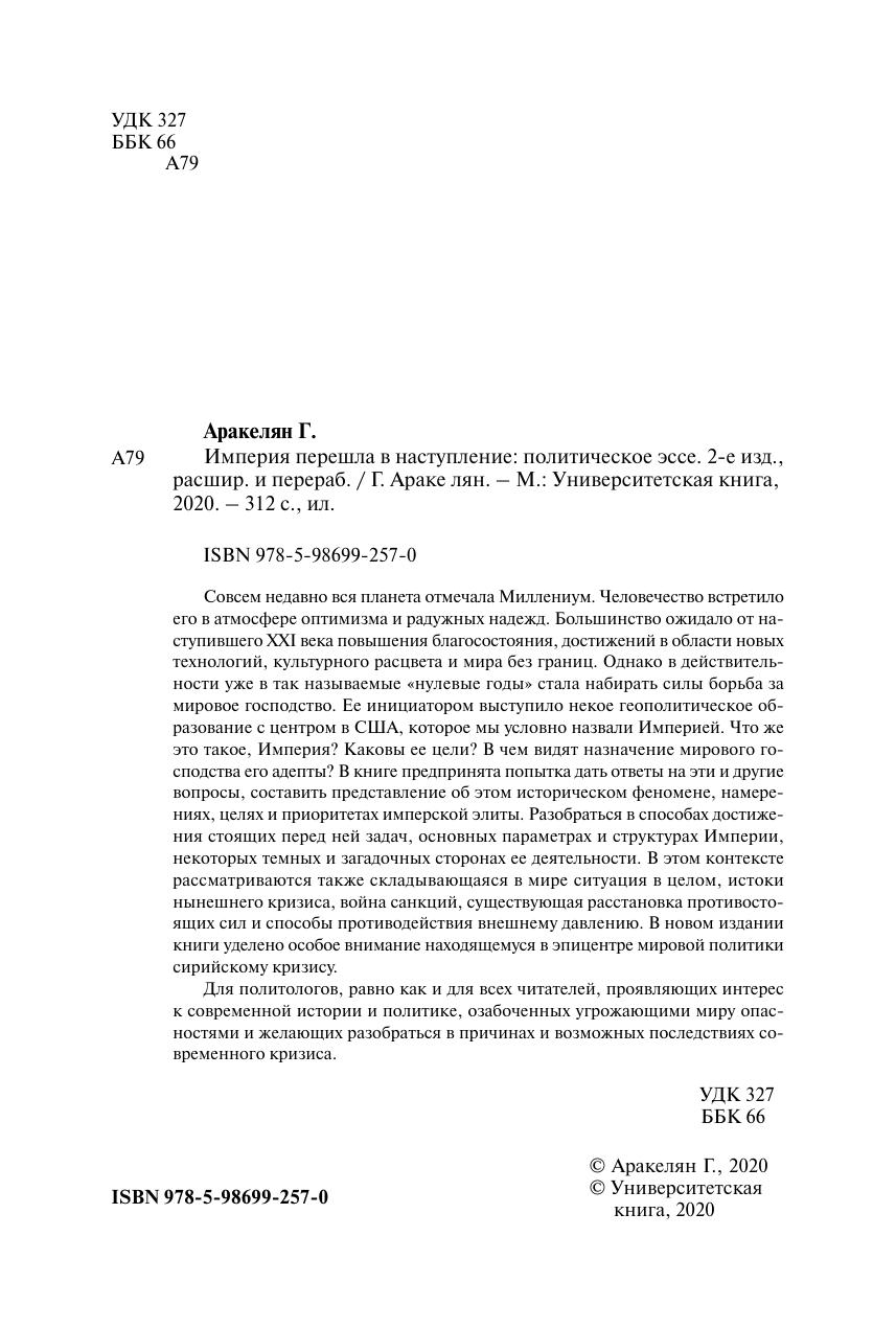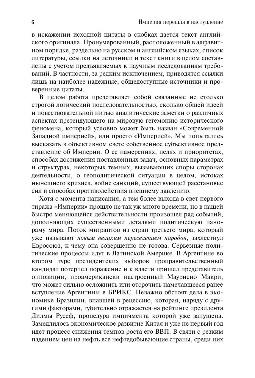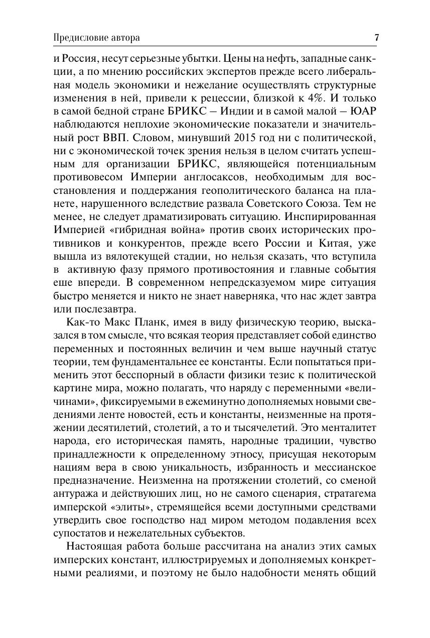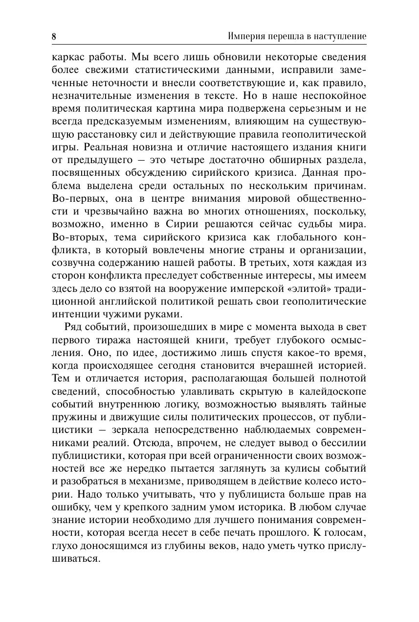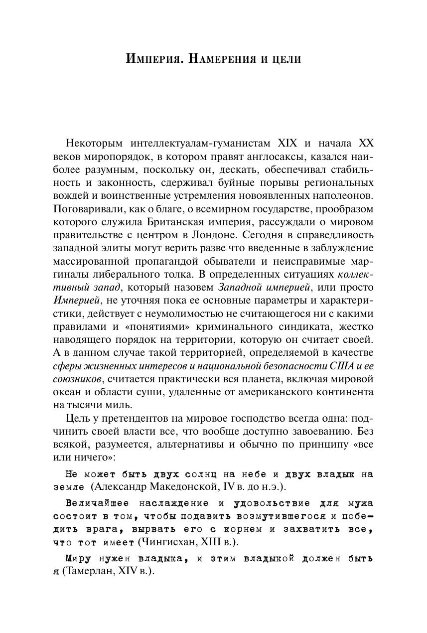 Совсем недавно вся планета отмечала Миллениум. Человечество встретило его в атмосфере оптимизма и радужных надежд. Большинство ожидало от наступившего XXI века повышения благосостояния, достижений в области новых технологий, культурного расцвета и мира без границ. Однако в действительности уже в так называемые «нулевые годы» стала набирать силы борьба за мировое господство. Ее инициатором выступило некое геополитическое образование с центром в США, которое мы условно назвали Империей. Что же это такое, Империя? Каковы ее цели? В чем видят назначение мирового господства его адепты? В книге предпринята попытка дать ответы на эти и другие вопросы, составить представление об этом историческом феномене, намерениях, целях и приоритетах имперской элиты. Разобраться в способах достижения стоящих перед ней задач, основных параметрах и структурах Империи, некоторых темных и загадочных сторонах ее деятельности. В этом контексте рассматриваются также складывающаяся в мире ситуация в целом, истоки нынешнего кризиса, война санкций, существующая расстановка противостоящих сил и способы противодействия внешнему давлению. В новом издании книги уделено особое внимание находящемуся в эпицентре мировой политики сирийскому кризису. Для политологов, равно как и для всех читателей, проявляющих интерес к современной истории и политике, озабоченных угрожающими миру опасностями и желающих разобраться в причинах и возможных последствиях современного кризиса.