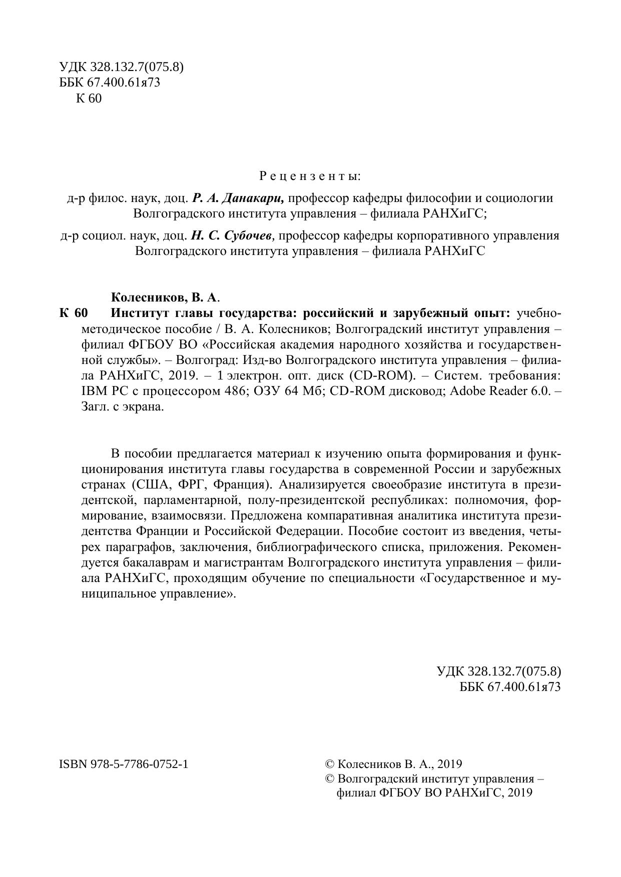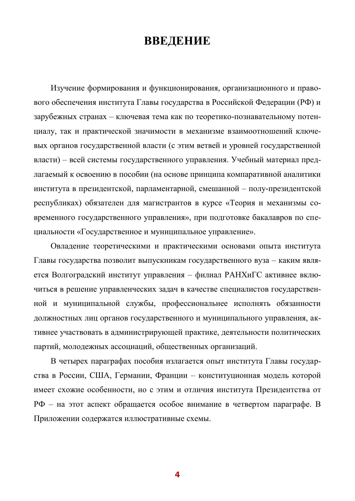 В пособии предлагается материал к изучению опыта формирования и функ-ционирования института главы государства в современной России и зарубежных странах (США, ФРГ, Франция). Анализируется своеобразие института в прези-дентской, парламентарной, полу-президентской республиках: полномочия, фор-мирование, взаимосвязи. Предложена компаративная аналитика института прези-дентства Франции и Российской Федерации. Пособие состоит из введения, четы-рех параграфов, заключения, библиографического списка, приложения. Рекомен-дуется бакалаврам и магистрантам Волгоградского института управления – фили-ала РАНХиГС, проходящим обучение по специальности «Государственное и му-ниципальное управление».