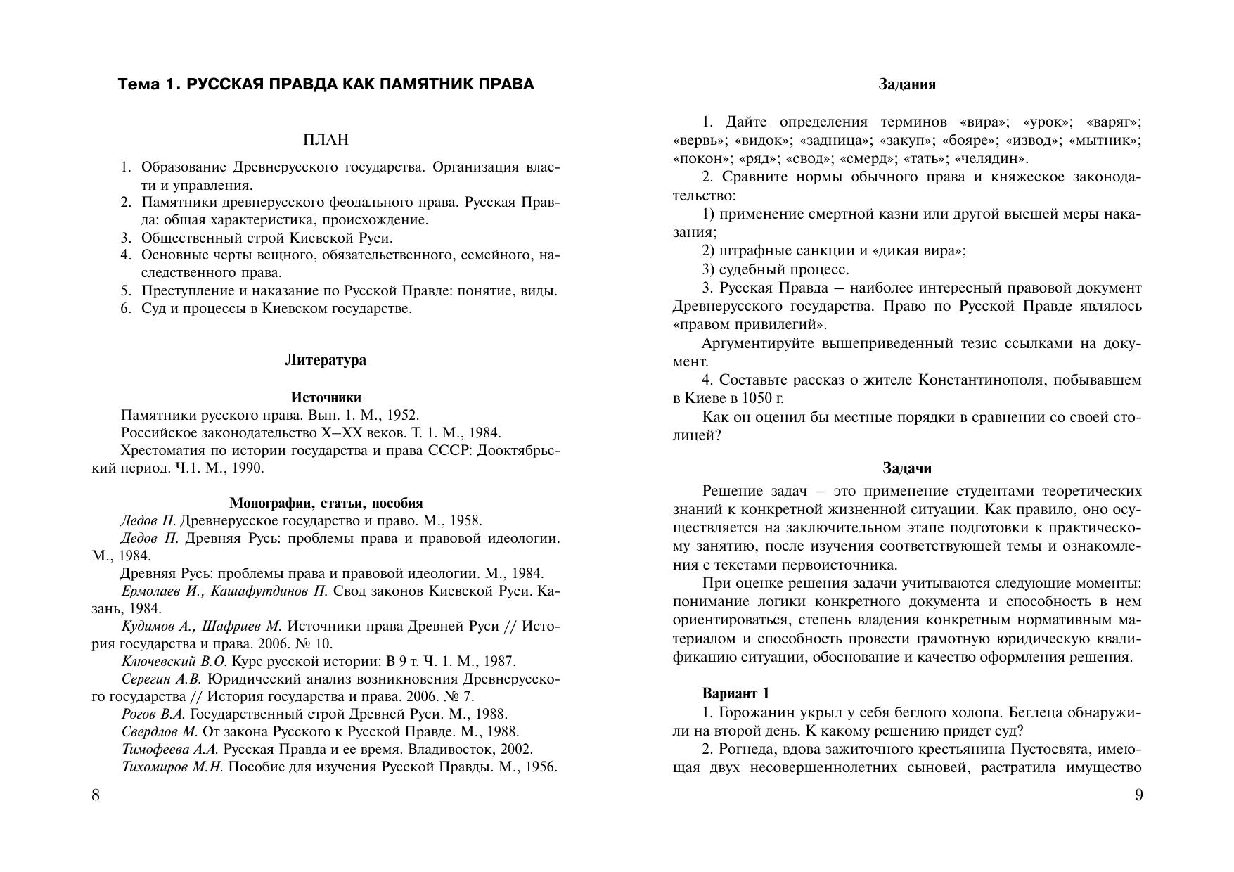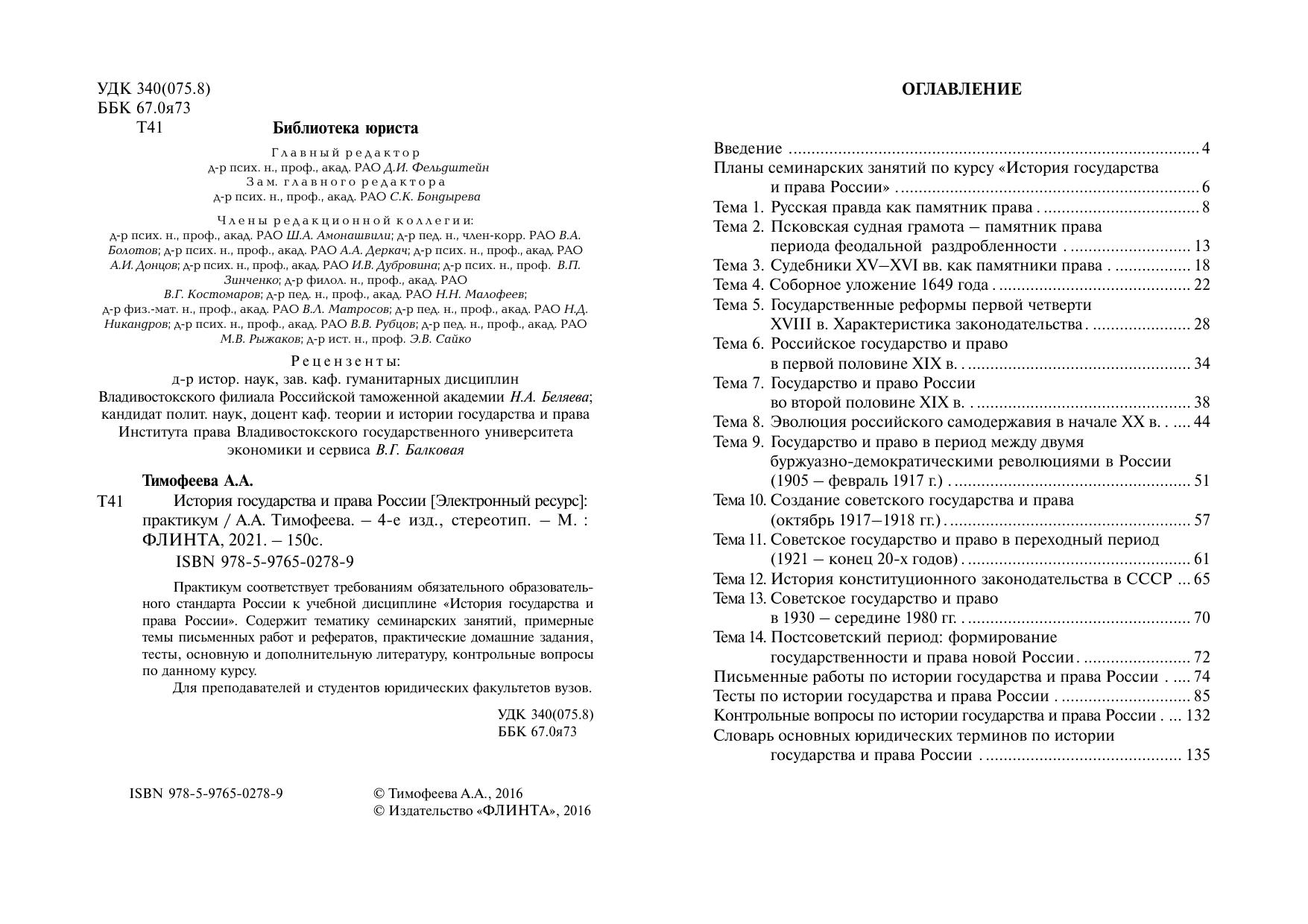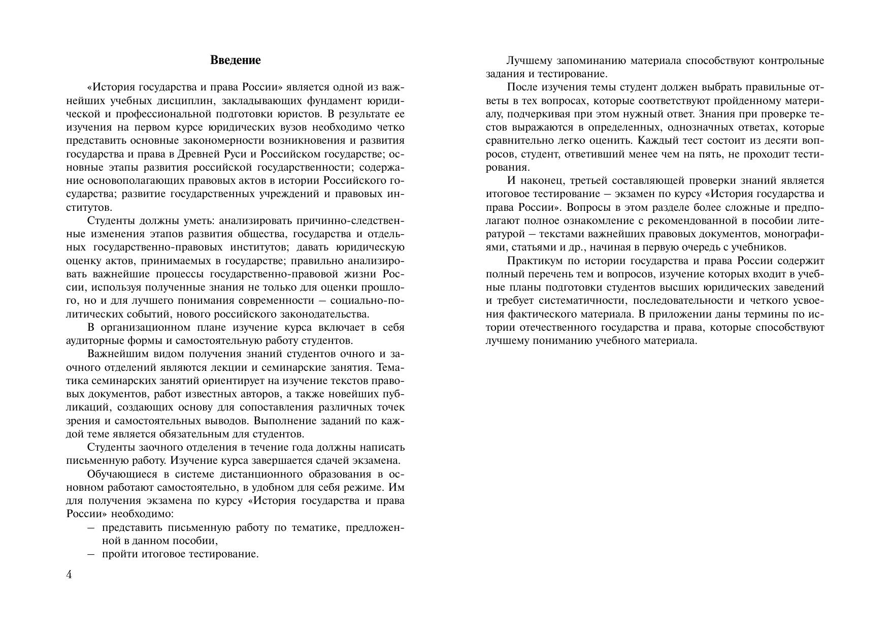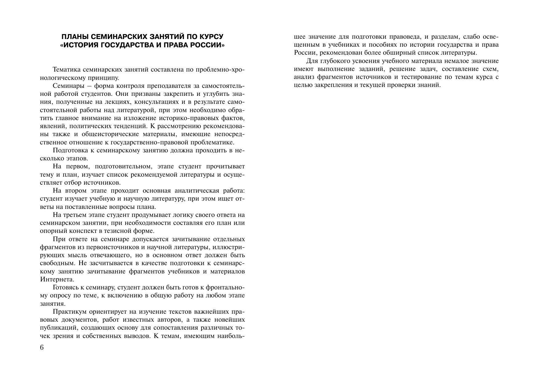 Практикум соответствует требованиям обязательного образовательного стандарта России к учебной дисциплине «История государства и права России». Содержит тематику семинарских занятий, примерные темы письменных работ и рефератов, практические домашние задания, тесты, основную и дополнительную литературу, контрольные вопросы по данному курсу. Для преподавателей и студентов юридических факультетов вузов.