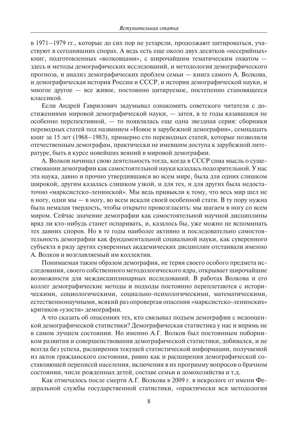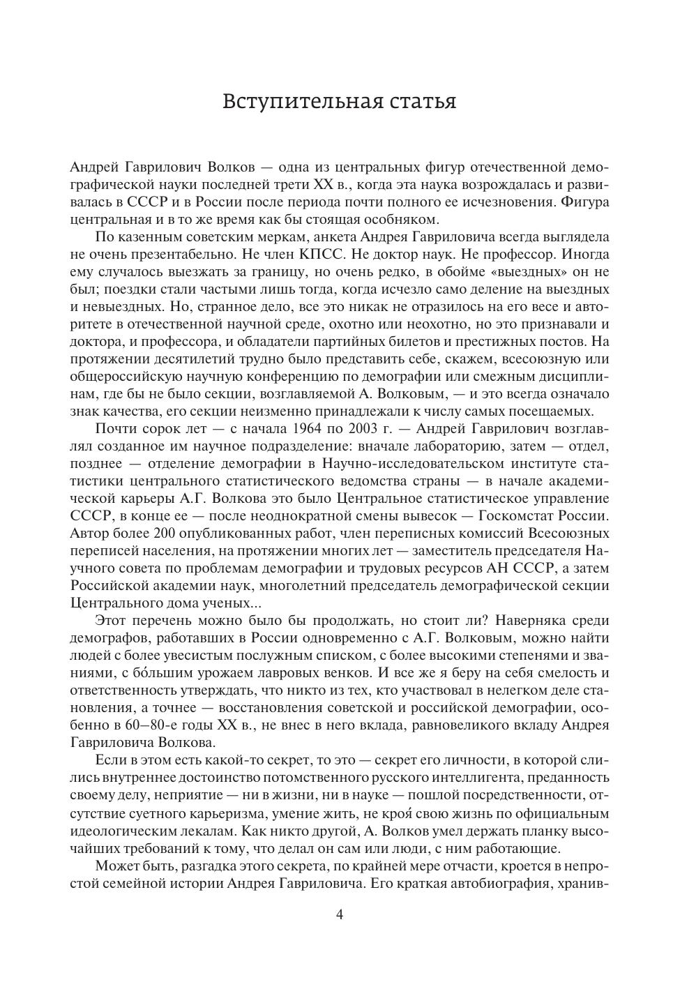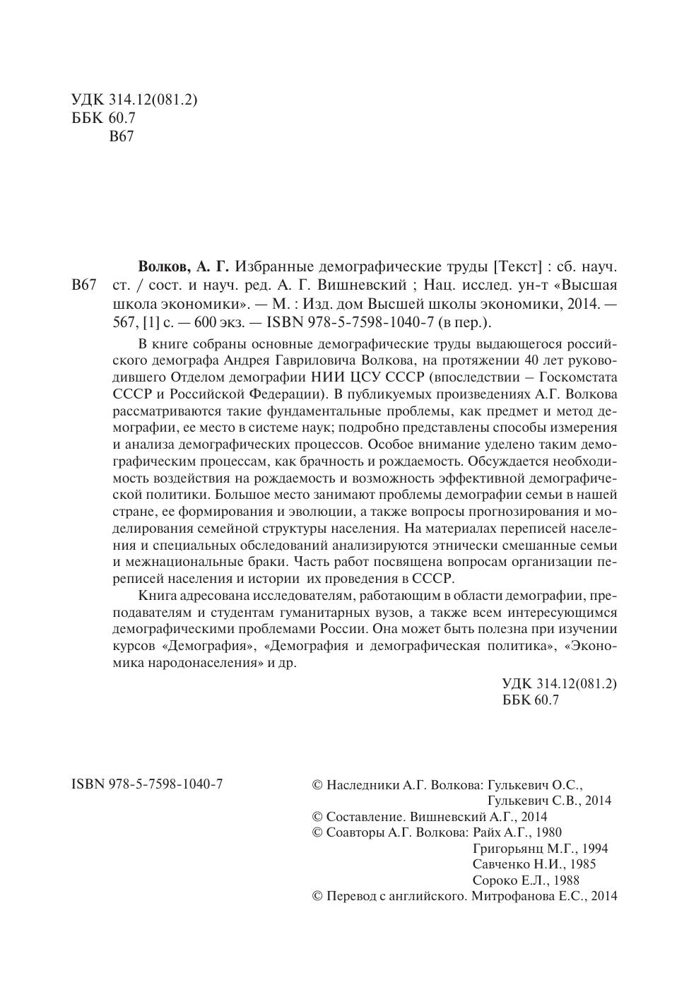 В книге собраны основные демографические труды выдающегося российского демографа Андрея Гавриловича Волкова, на протяжении 40 лет руководившего Отделом демографии НИИ ЦСУ СССР (впоследствии – Госкомстата СССР и Российской Федерации). В публикуемых произведениях А.Г. Волкова рассматриваются такие фундаментальные проблемы, как предмет и метод демографии, ее место в системе наук; подробно представлены способы измерения и анализа демографических процессов. Особое внимание уделено таким демографическим процессам, как брачность и рождаемость. Обсуждается необходимость воздействия на рождаемость и возможность эффективной демографической политики. Большое место занимают проблемы демографии семьи в нашей стране, ее формирования и эволюции, а также вопросы прогнозирования и моделирования семейной структуры населения. На материалах переписей населения и специальных обследований анализируются этнически смешанные с емьи и межнациональные браки. Часть работ посвящена вопросам организации переписей населения и истории их проведения в СССР. Книга адресована исследователям, работающим в области демографии, преподавателям и студентам гуманитарных вузов, а также всем интересующимся демографическими проблемами России. Она может быть полезна при изучении курсов «Демография», «Демография и демографическая политика», «Экономика народонаселения» и др.