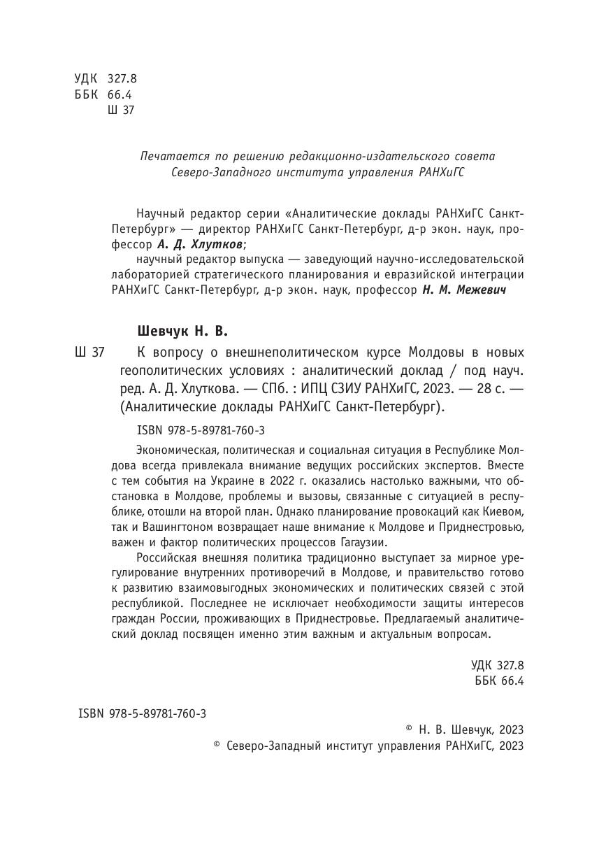 Экономическая, политическая и социальная ситуация в Республике Молдова всегда привлекала внимание ведущих российских экспертов. Вместе с тем события на Украине в 2022 г. оказались настолько важными, что обстановка в Молдове, проблемы и вызовы, связанные с ситуацией в республике, отошли на второй план. Однако планирование провокаций как Киевом, так и Вашингтоном возвращает наше внимание к Молдове и Приднестровью, важен и фактор политических процессов Гагаузии. Российская внешняя политика традиционно выступает за мирное урегулирование внутренних противоречий в Молдове, и правительство готово к развитию взаимовыгодных экономических и политических связей с этой республикой. Последнее не исключает необходимости защиты интересов граждан России, проживающих в Приднестровье. Предлагаемый аналитический доклад посвящен именно этим важным и актуальным вопросам.