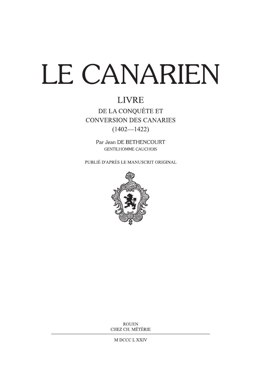 Канарец, или Книга о завоевании Канарских островов и обращении их жителей в христианскую веру Жаном де Бетанкуром, дворянином из Ко, составленная монахом Пьером Бонтье и священником Жаном Ле Веррье