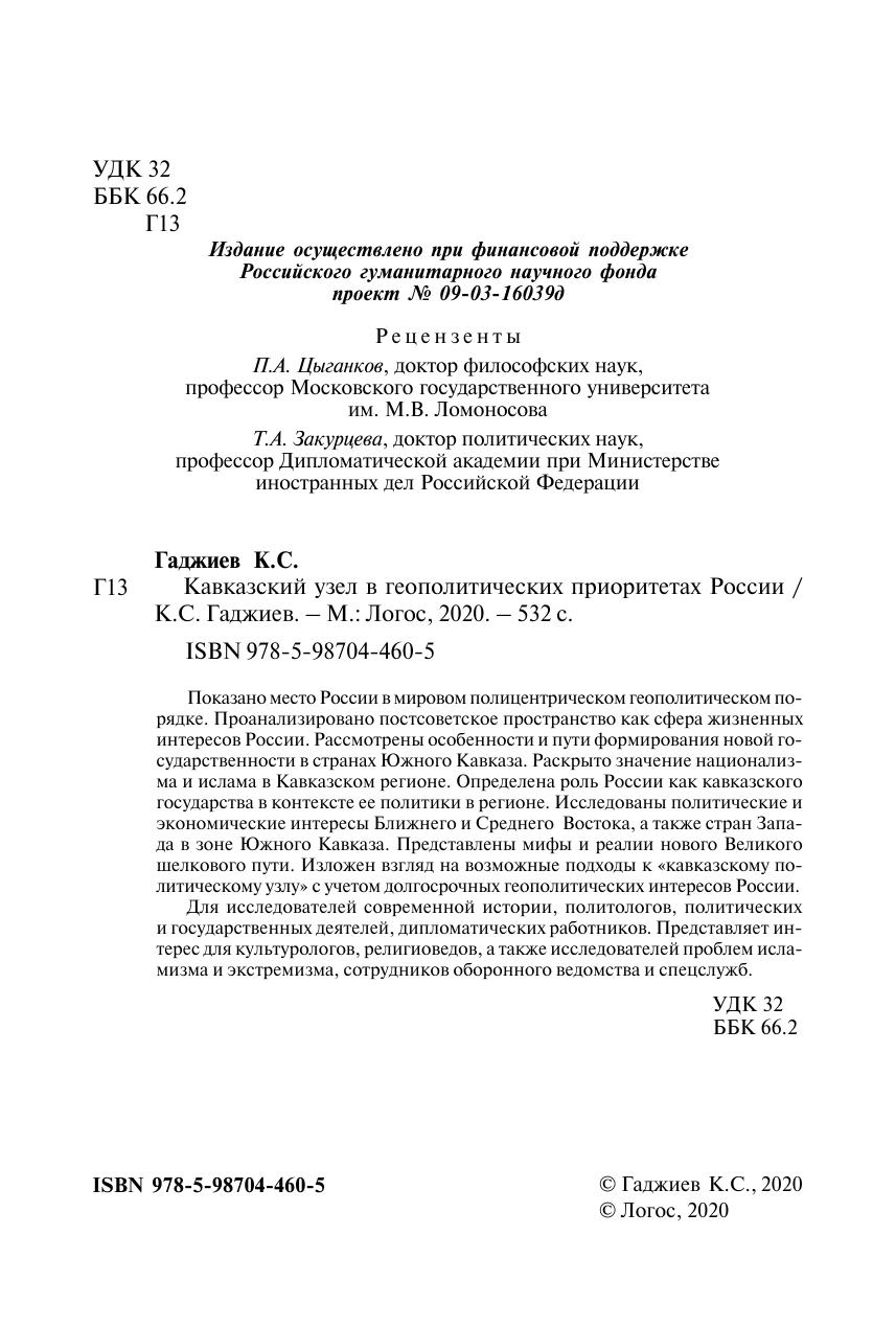 Показано место России в мировом полицентрическом геополитическом порядке. Проанализировано постсоветское пространство как сфера жизненных интересов России. Рассмотрены особенности и пути формирования новой государственности в странах Южного Кавказа. Раскрыто значение национализма и ислама в Кавказском регионе. Определена роль России как кавказского государства в контексте ее политики в регионе. Исследованы политические и экономические интересы Ближнего и Среднего Востока, а также стран Запада в зоне Южного Кавказа. Представлены мифы и реалии нового Великого шелкового пути. Изложен взгляд на возможные подходы к «кавказскому политическому узлу» с учетом долгосрочных геополитических интересов России. Для исследователей современной истории, политологов, политических и государственных деятелей, дипломатических работников. Представляет интерес для культурологов, религиоведов, а также исследователей проблем исламизма и экстремизма, сотрудников оборонного ведомства и спецслужб.
