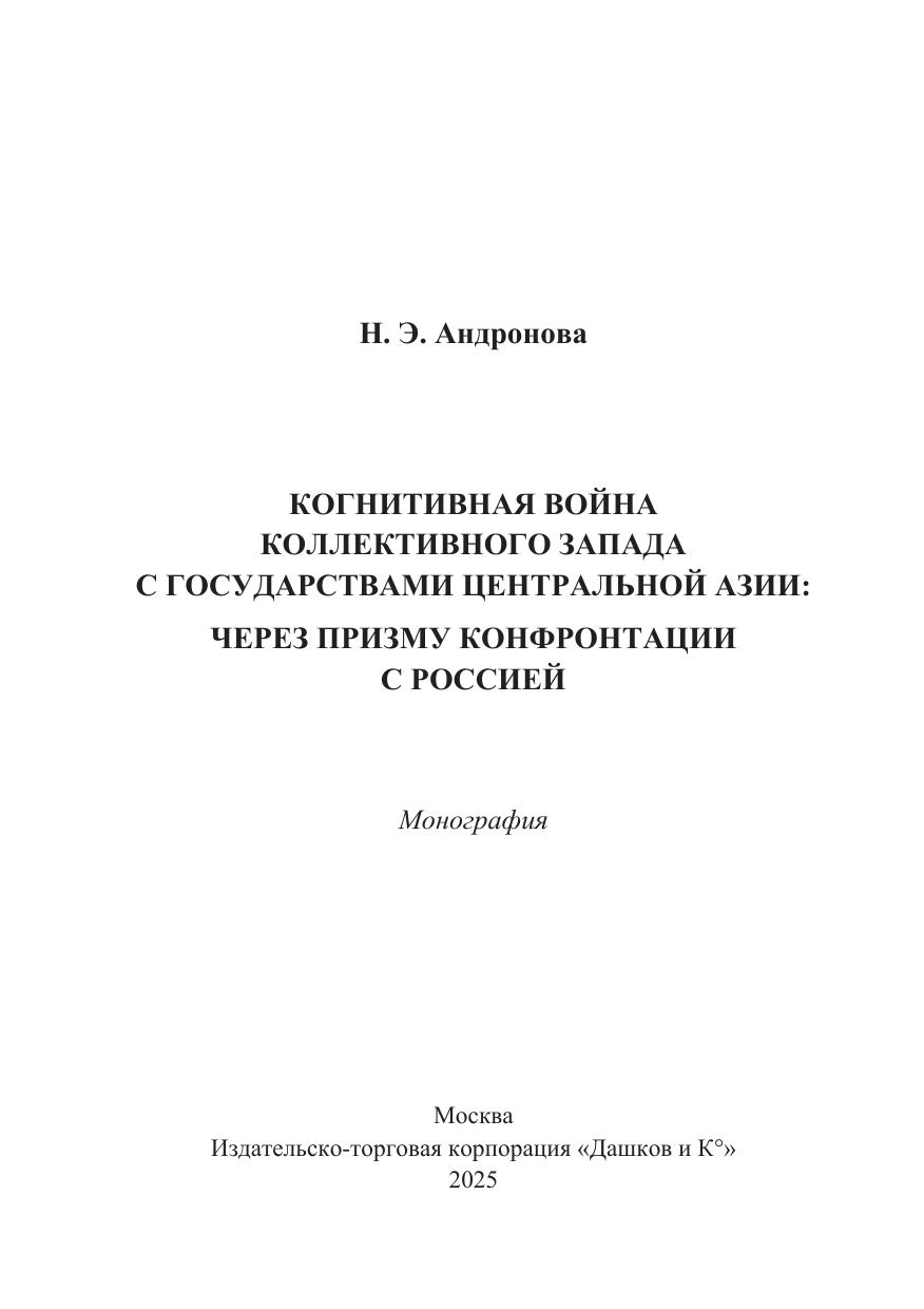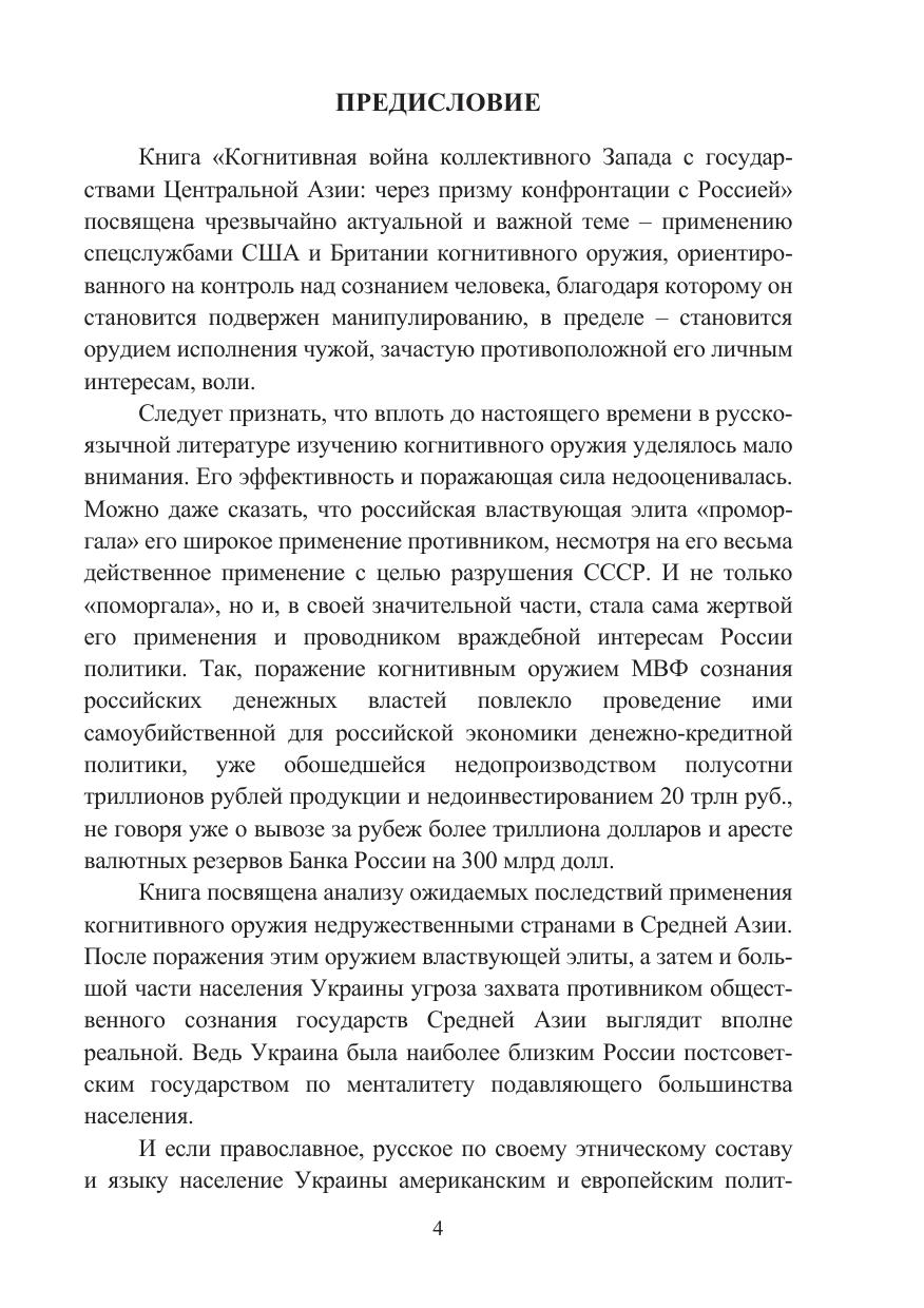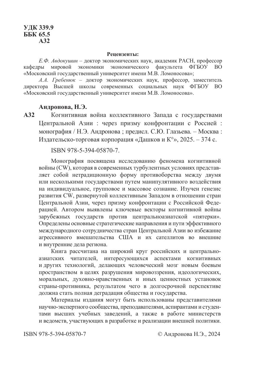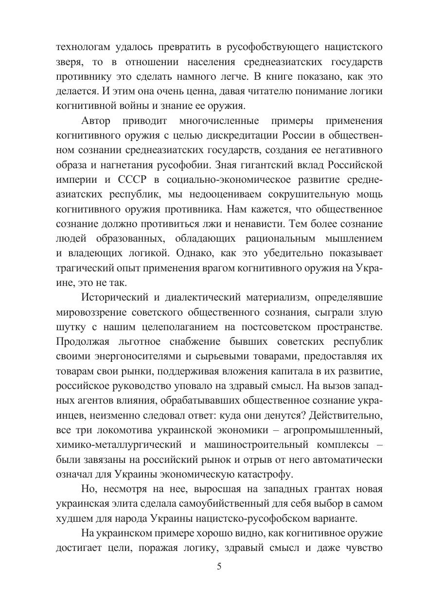 Монография посвящена исследованию феномена когнитивной войны (CW), которая в современных турбулентных условиях представляет собой нетрадиционную форму противоборства между двумя или несколькими государствами путем манипулятивного воздействия на индивидуальное, групповое и массовое сознание. Изучен генезис развития CW, развернутой коллективным Западом в отношении стран Центральной Азии, через призму конфронтации с Российской Федерацией. Автором выявлены ключевые векторы когнитивной войны зарубежных государств против центральноазиатской «пятерки». Определены основные стратегические направления и пути эффективного международного сотрудничества стран Центральной Азии во избежание агрессивного вмешательства США и их сателлитов во внешние и внутренние дела региона. Книга рассчитана на широкий круг российских и центрально-азиатских читателей, интересующихся аспектами когнитивных и других технологий, делающих человеческий мозг новым боевым пространством в целях разрушения мировоззрения, идеологических, моральных, духовно-нравственных и иных ценностных установок страны-противника, результатом чего в долгосрочной перспективе должна стать полная деградация общества и государства. Материалы издания могут быть использованы представителями научно-экспертного сообщества, преподавателями, аспирантами и студентами высших учебных заведений, а также в работе министерств и ведомств, участвующих в разработке и реализации внешней политики.
