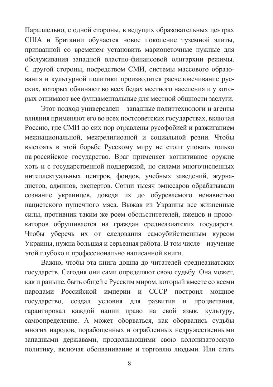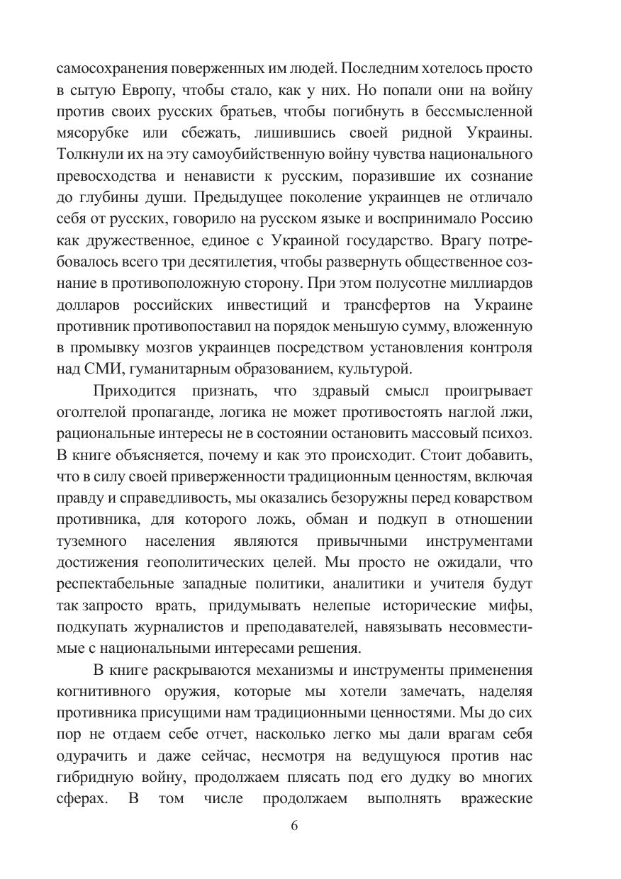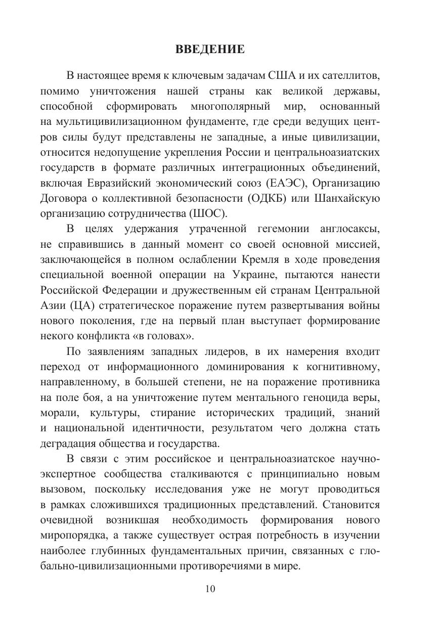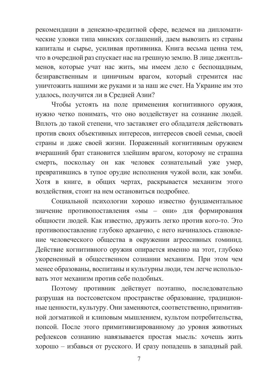 Монография посвящена исследованию феномена когнитивной войны (CW), которая в современных турбулентных условиях представляет собой нетрадиционную форму противоборства между двумя или несколькими государствами путем манипулятивного воздействия на индивидуальное, групповое и массовое сознание. Изучен генезис развития CW, развернутой коллективным Западом в отношении стран Центральной Азии, через призму конфронтации с Российской Федерацией. Автором выявлены ключевые векторы когнитивной войны зарубежных государств против центральноазиатской «пятерки». Определены основные стратегические направления и пути эффективного международного сотрудничества стран Центральной Азии во избежание агрессивного вмешательства США и их сателлитов во внешние и внутренние дела региона. Книга рассчитана на широкий круг российских и центрально-азиатских читателей, интересующихся аспектами когнитивных и других технологий, делающих человеческий мозг новым боевым пространством в целях разрушения мировоззрения, идеологических, моральных, духовно-нравственных и иных ценностных установок страны-противника, результатом чего в долгосрочной перспективе должна стать полная деградация общества и государства. Материалы издания могут быть использованы представителями научно-экспертного сообщества, преподавателями, аспирантами и студентами высших учебных заведений, а также в работе министерств и ведомств, участвующих в разработке и реализации внешней политики.