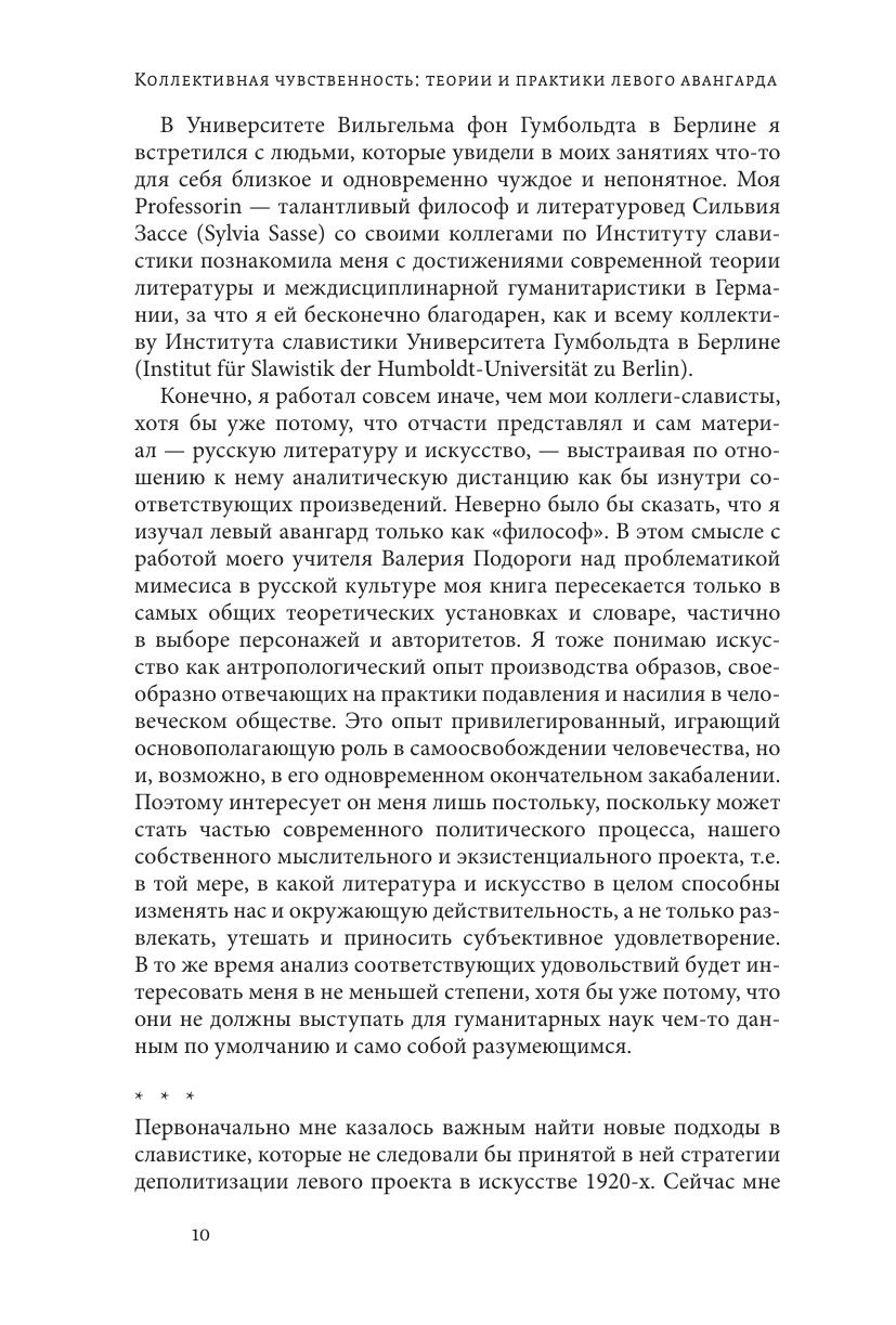 Эта книга посвящена антропологическому анализу феномена русского левого авангарда, представленного прежде всего произведениями конструктивистов, производственников и фактографов, сосредоточившихся в 1920-х годах вокруг журналов «ЛЕФ» и «Новый ЛЕФ» и таких институтов, как ИНХУК, ВХУТЕМАС и ГАХН. Левый авангард понимается нами как саморефлектирующая социально-антропологическая практика, нимало не теряющая в своих художественных достоинствах из-за сознательного обращения своих протагонистов к решению политических и бытовых проблем народа, получившего в начале прошлого века возможность социального освобождения. Мы обращаемся с соответствующими интердисциплинарными инструментами анализа к таким разным фигурам, как Андрей Белый и Андрей Платонов, Николай Евреинов и Дзига Вертов, Густав Шпет, Борис Арватов и др. Объединяет столь различных авторов открытие в их произведениях особого слоя чувственности и альтернативной буржуазно-индивидуалистической структуры бессознательного, которые описываются нами провокативным понятием «коллективная чувственность». Коллективность означает здесь не внешнюю социальную организацию, а имманентный строй образов соответствующих художественных произведений-вещей, позволяющий им одновременно выступать полезными и целесообразными, удобными и эстетически безупречными. Книга адресована широкому кругу гуманитариев — специалистам по философии литературы и искусства, компаративистам, художникам.