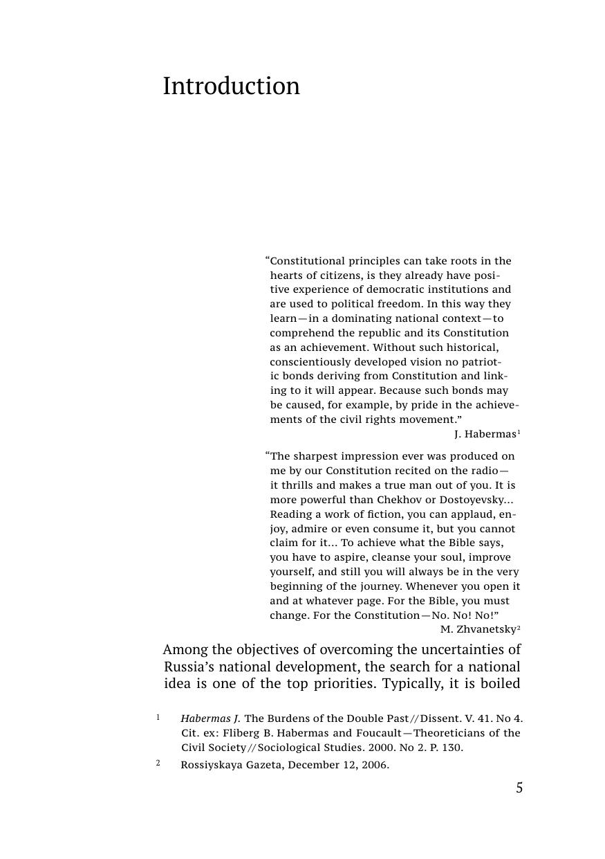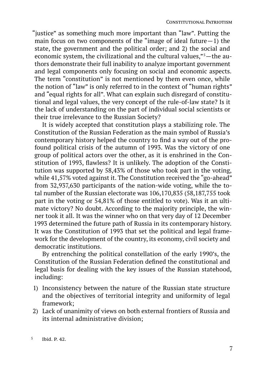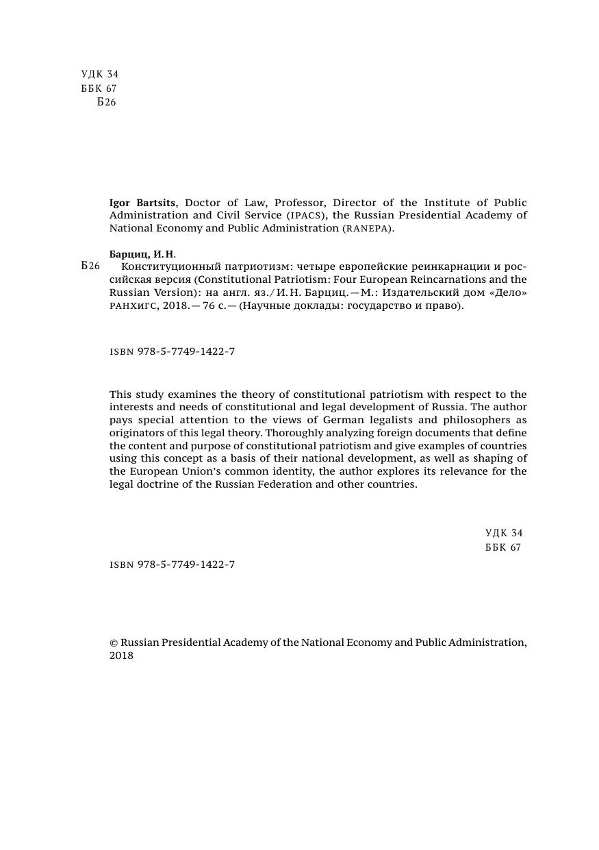 This study examines the theory of constitutional patriotism with respect to the interests and needs of constitutional and legal development of Russia. The author pays special attention to the views of German legalists and philosophers as originators of this legal theory. Thoroughly analyzing foreign documents that defi ne the content and purpose of constitutional patriotism and give examples of countries using this concept as a basis of their national development, as well as shaping of the European Union’s common identity, the author explores its relevance for the legal doctrine of the Russian Federation and other countries.