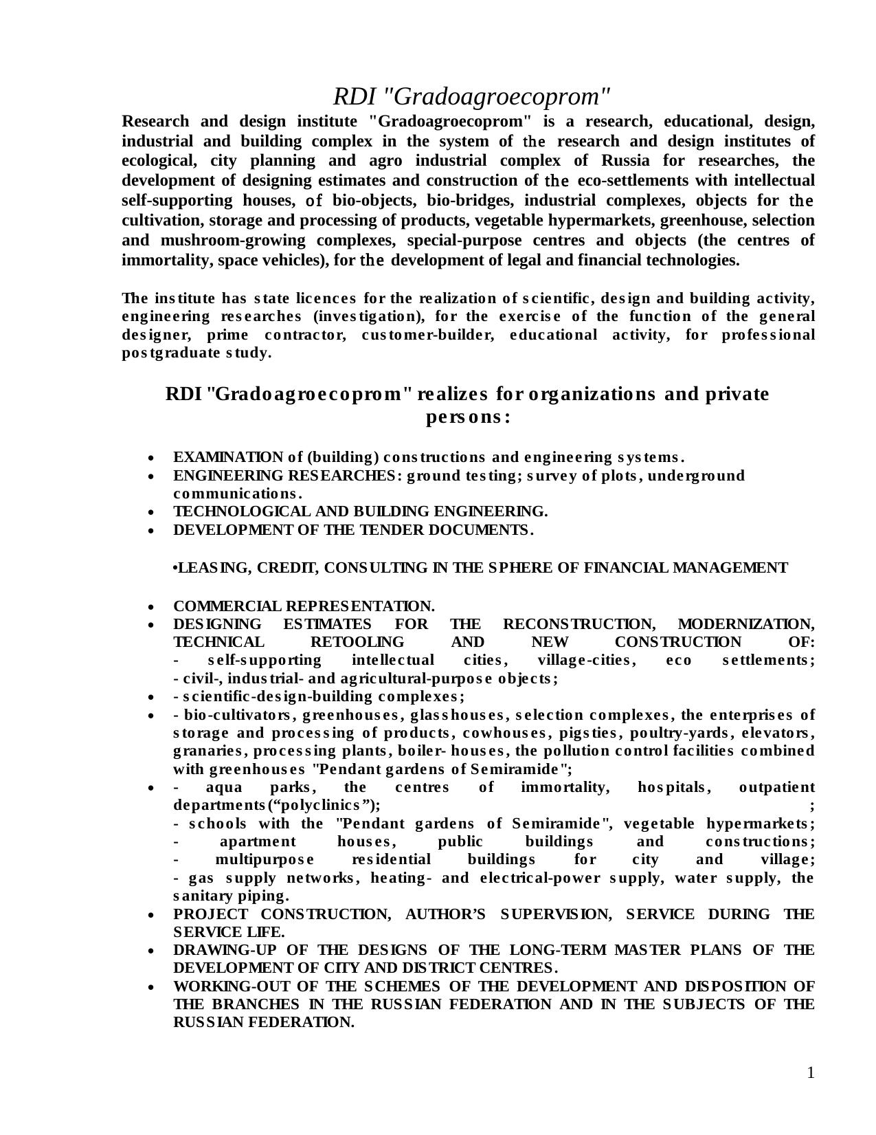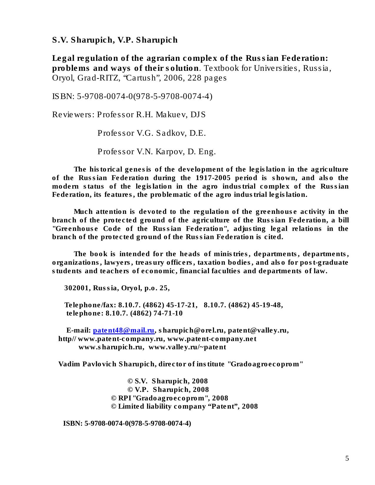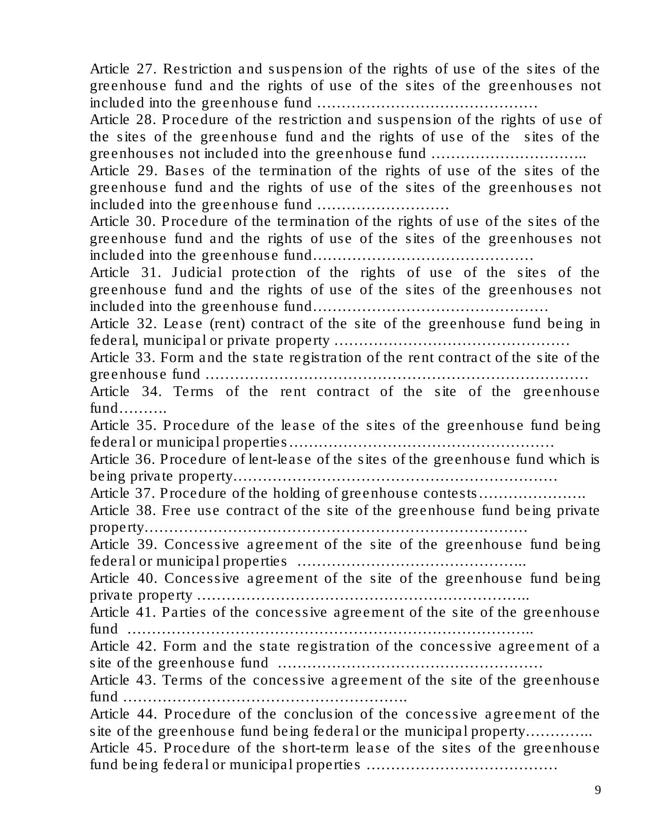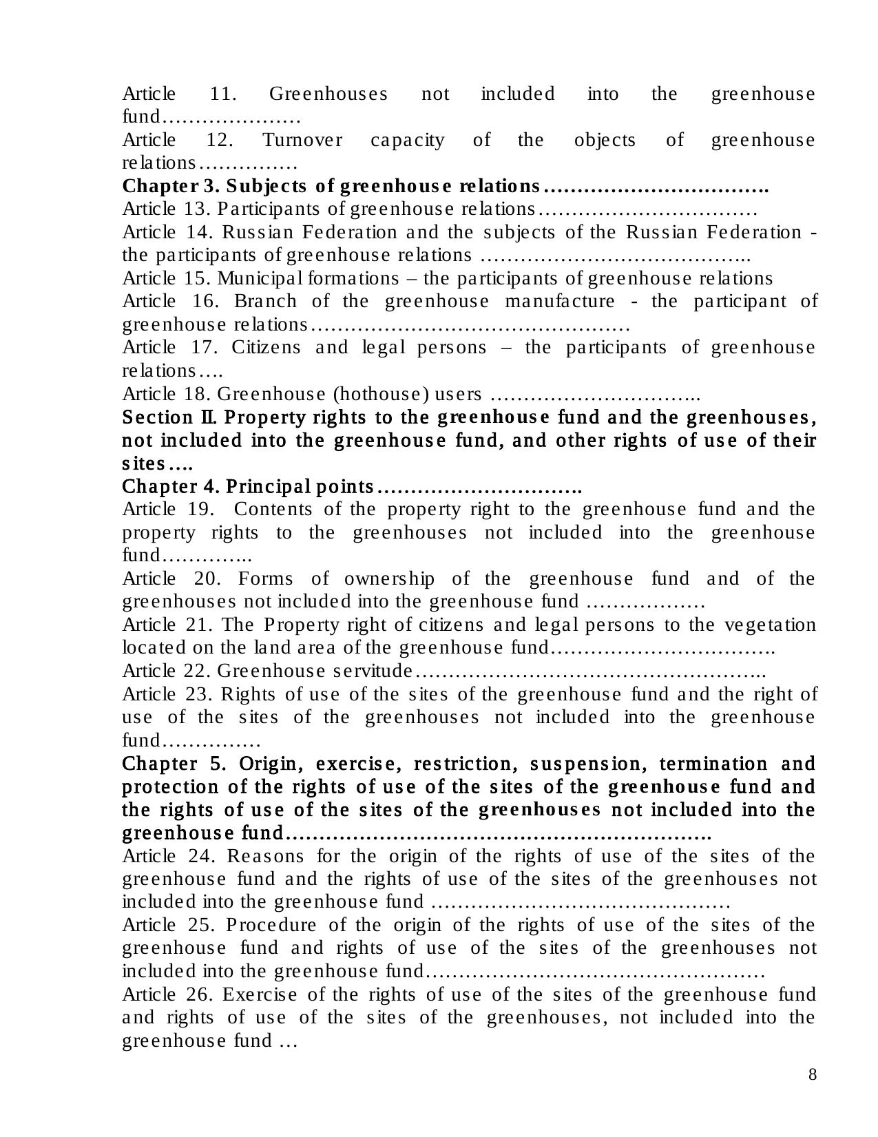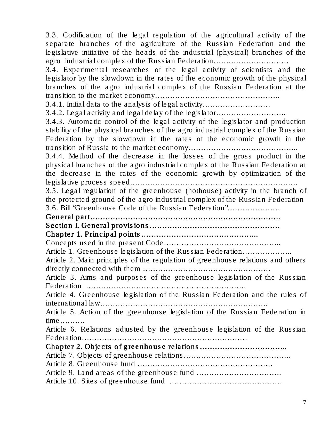 Much attention is devoted to the regulation of the greenhouse activity in the branch of the protected ground of the agriculture of the Russian Federation, a bill "Greenhouse Code of the Russian Federation", adjusting legal relations in the branch of the protected ground of the Russian Federation is cited.