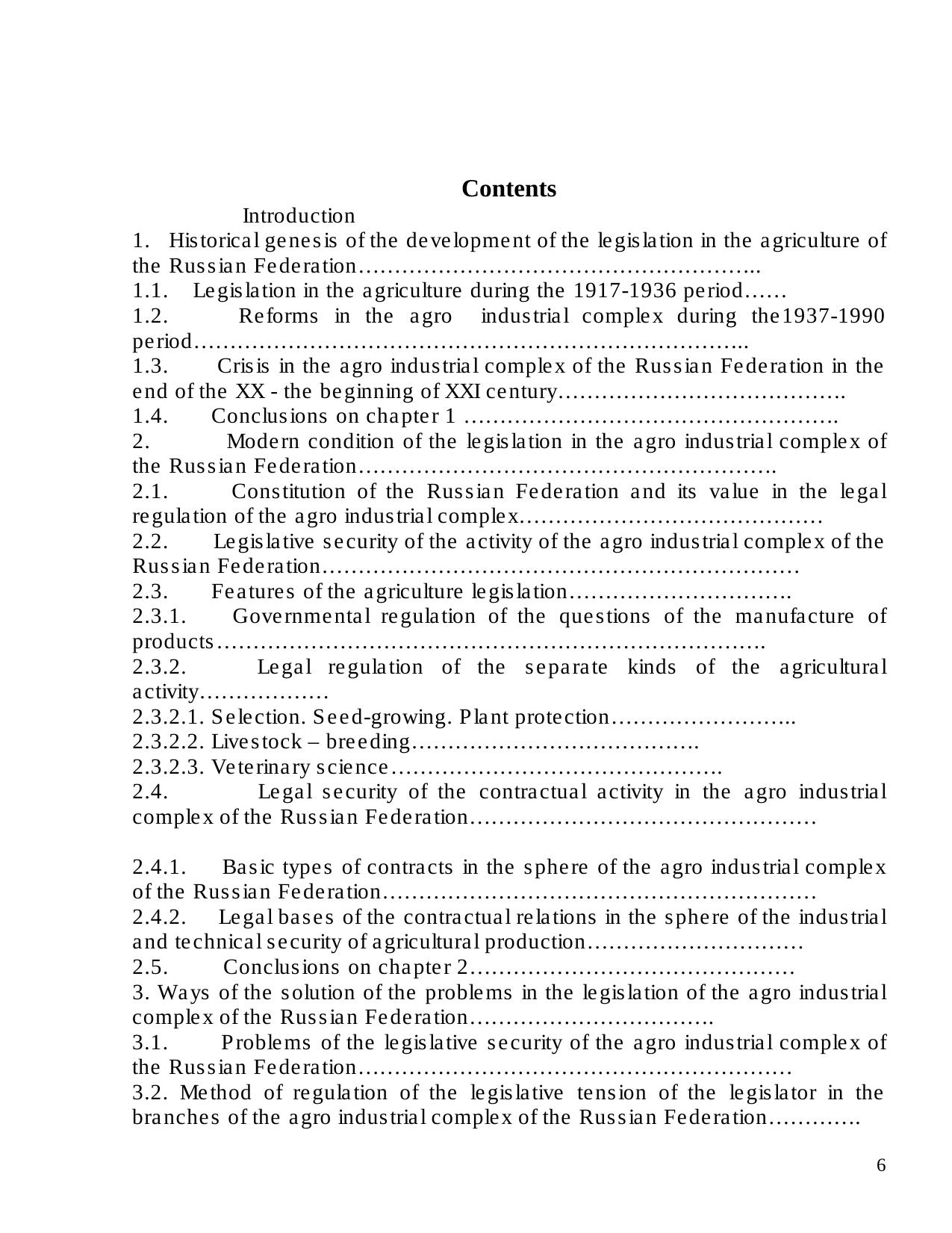 The historical genesis of the development of the legislation in the agriculture of the Russian Federation during the 1917-2005 period is shown, and also the modern status of the legislation in the agro industrial complex of the Russian Federation, its features, the problematic of the agro industrial legislation.