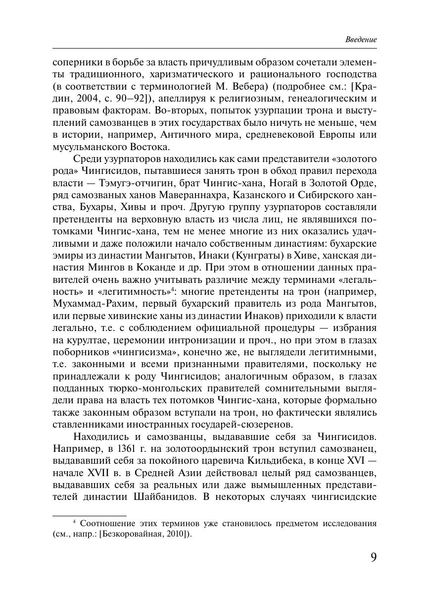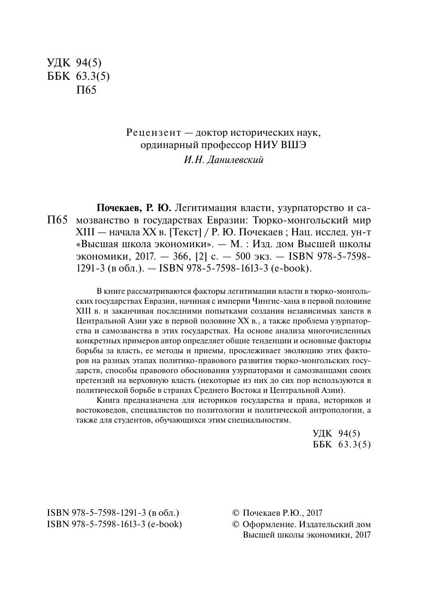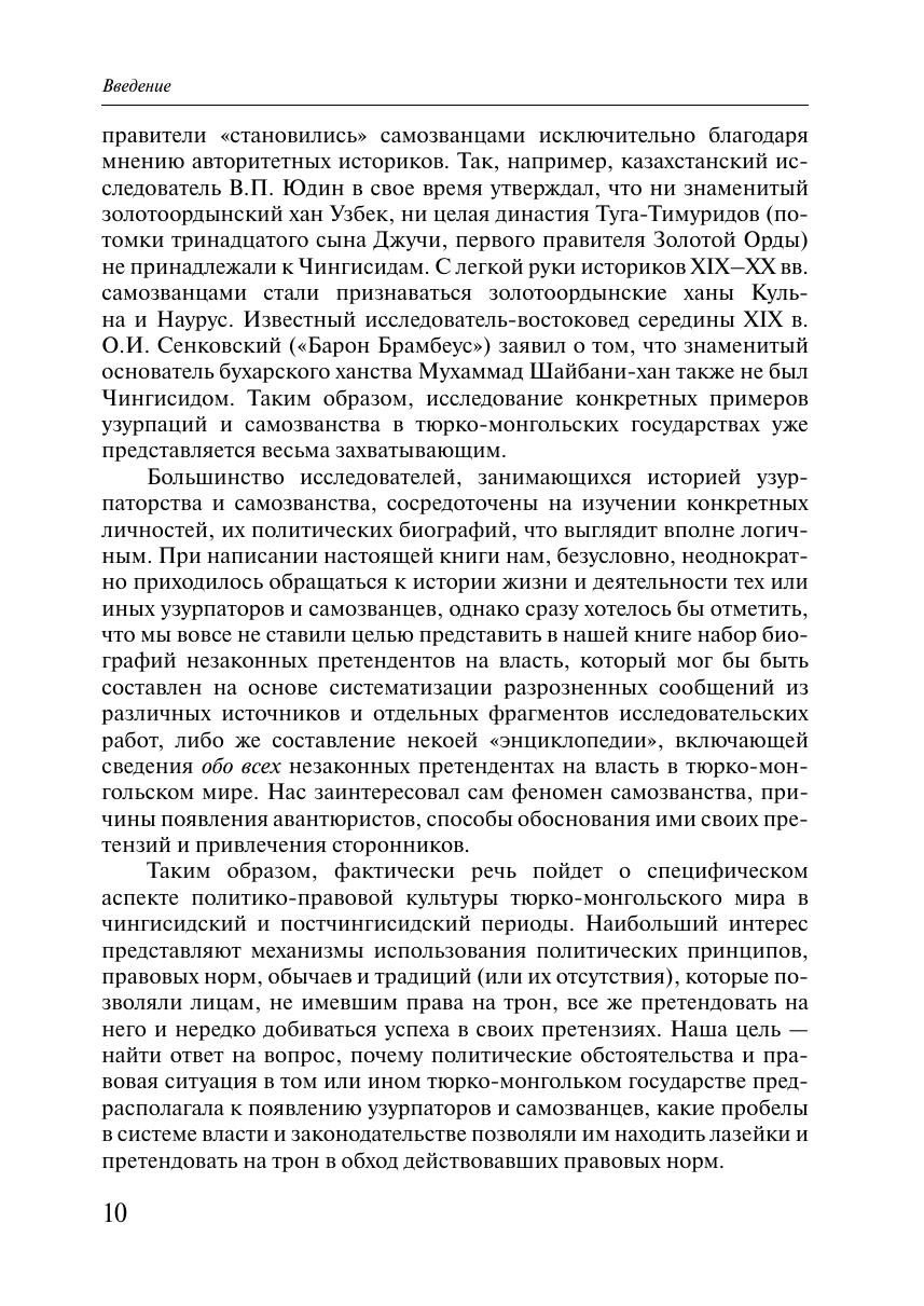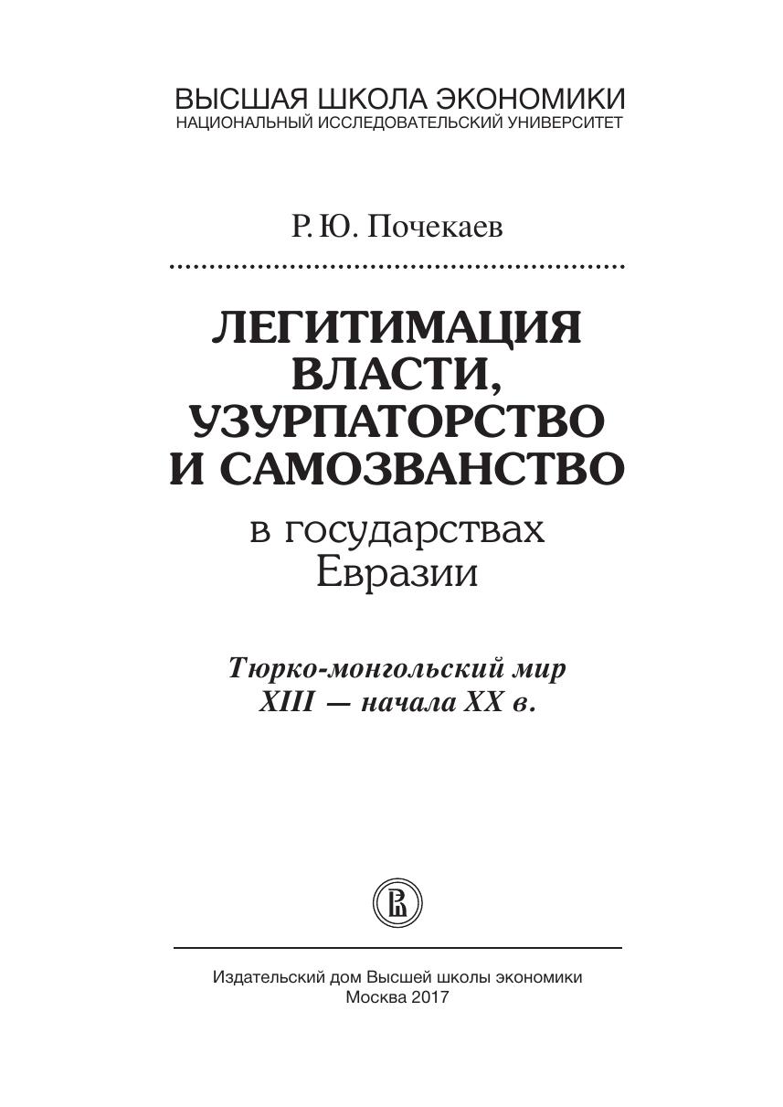 В книге рассматриваются факторы легитимации власти в тюрко-монгольских государствах Евразии, начиная с империи Чингис-хана в первой половине XIII в. и заканчивая последними попытками создания независимых ханств в Центральной Азии уже в первой половине ХХ в., а также проблема узурпаторства и самозванства в этих государствах. На основе анализа многочисленных конкретных примеров автор определяет общие тенденции и основные факторы борьбы за власть, ее методы и приемы, прослеживает эволюцию этих факторов на разных этапах политико-правового развития тюрко-монгольских государств, способы правового обоснования узурпаторами и самозванцами своих претензий на верховную власть (некоторые из них до сих пор используются в политической борьбе в странах Среднего Востока и Центральной Азии). Книга предназначена для историков государства и права, историков и востоковедов, специалистов по политологии и политической антропологии, а также для студентов, обучающихся этим специальностям.