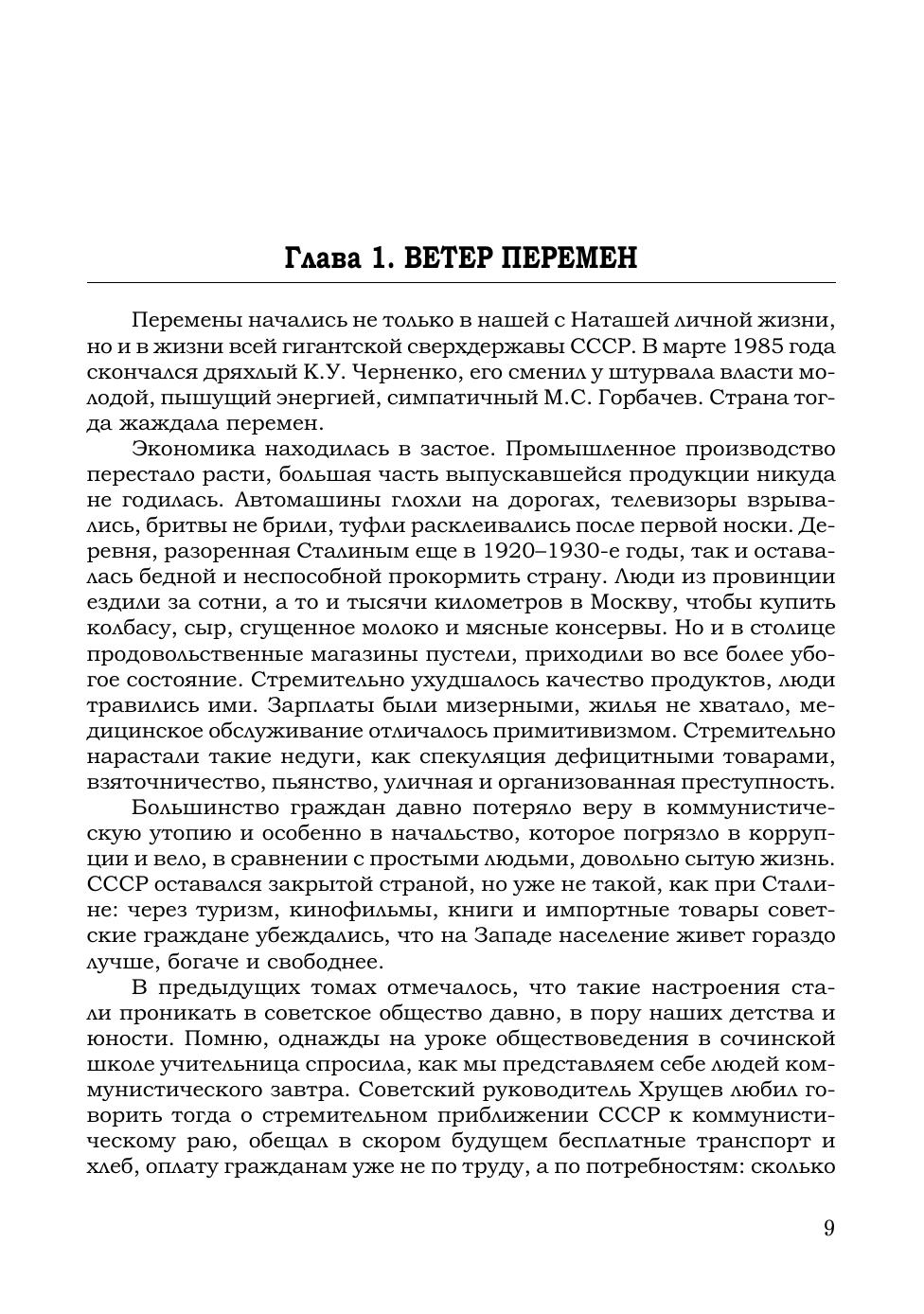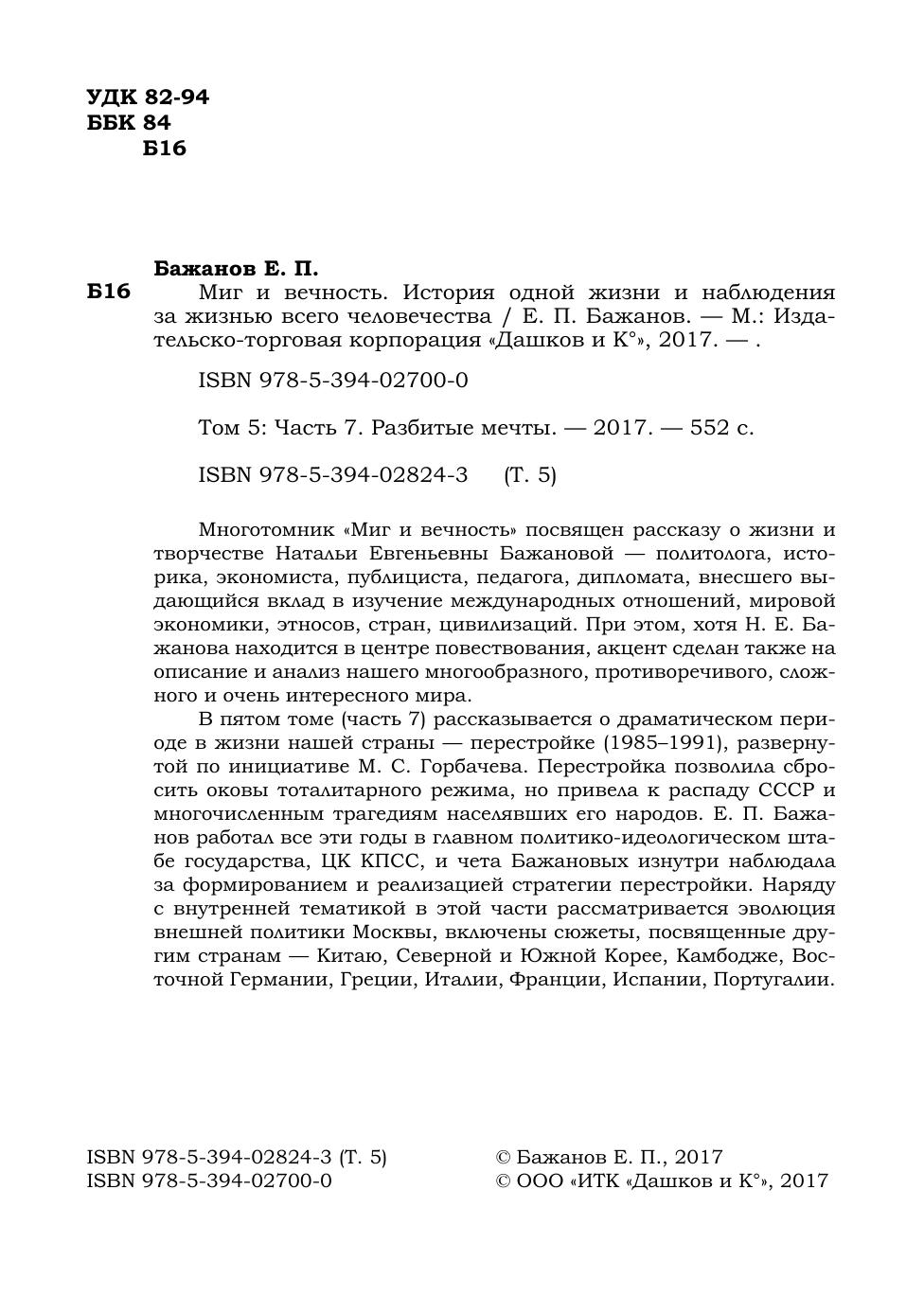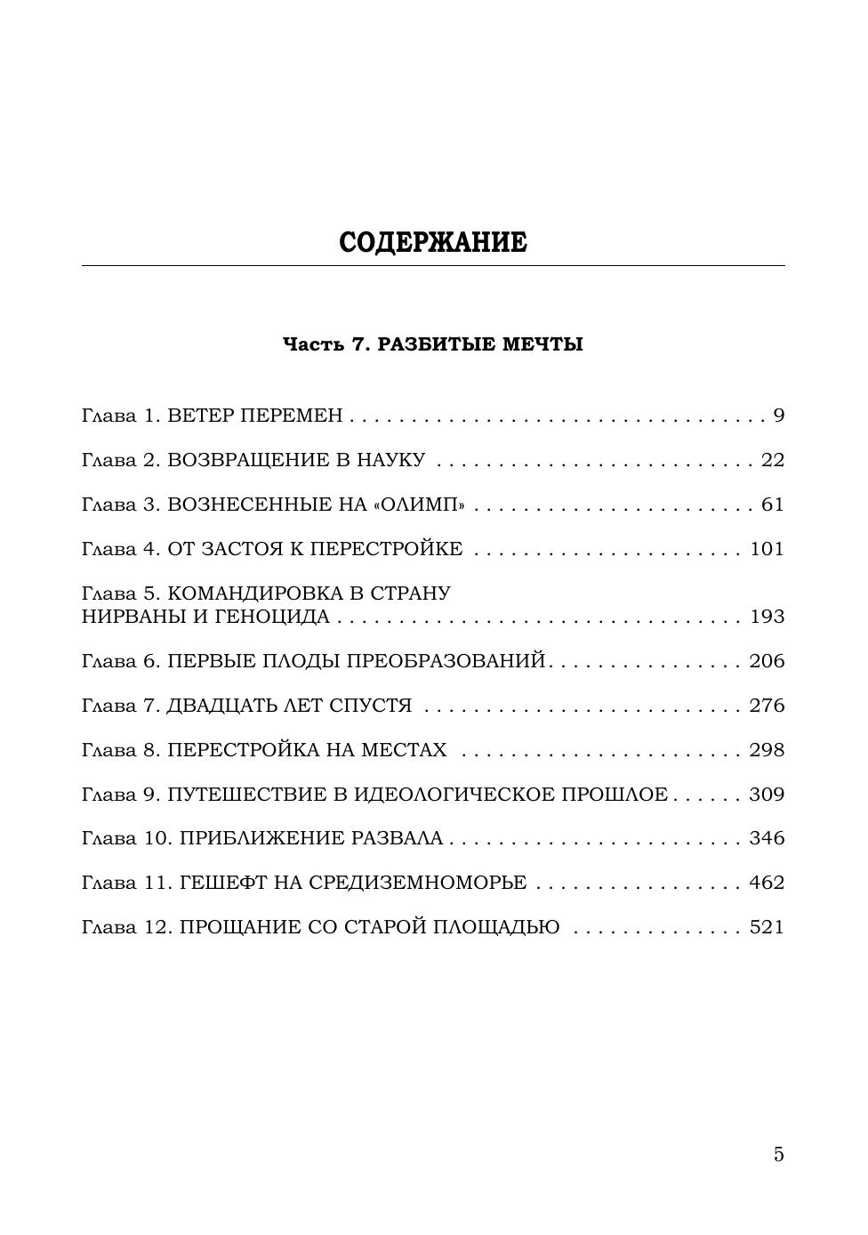 В пятом томе (часть 7) рассказывается о драматическом периоде в жизни нашей страны- перестройке (1985-1991), развернутой по инициативе М.С.Горбачева. Перестройка позволила сбросить оковы тоталитарного режима, но привела к распаду СССР и многочисленным трагедиям населявших его народов. Е.П.Бажанов работал все эти годы в главном политико-идеологическом штабе государства, ЦК КПСС, и чета Бажановых изнутри наблюдала за формированием и реализацией стратегии перестройки. Наряду с внутренней тематикой в этой части рассматриваются эволюции внешней политики Москвы, включены сюжеты, посвященные другим странам - Китаю, Северной и Южной Корее, Камбодже, Восточной Германии, Греции, Италии, Франции, Испании, Португалии.