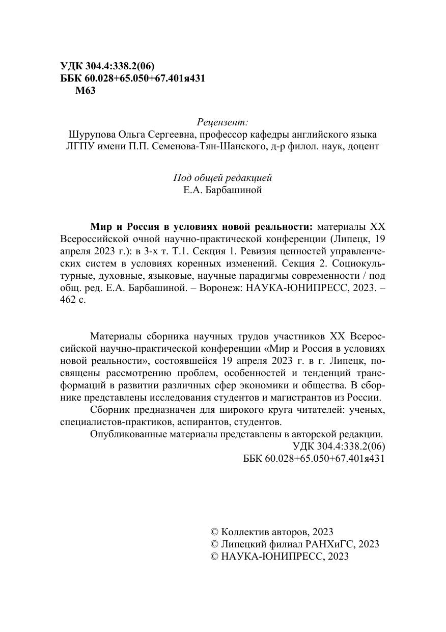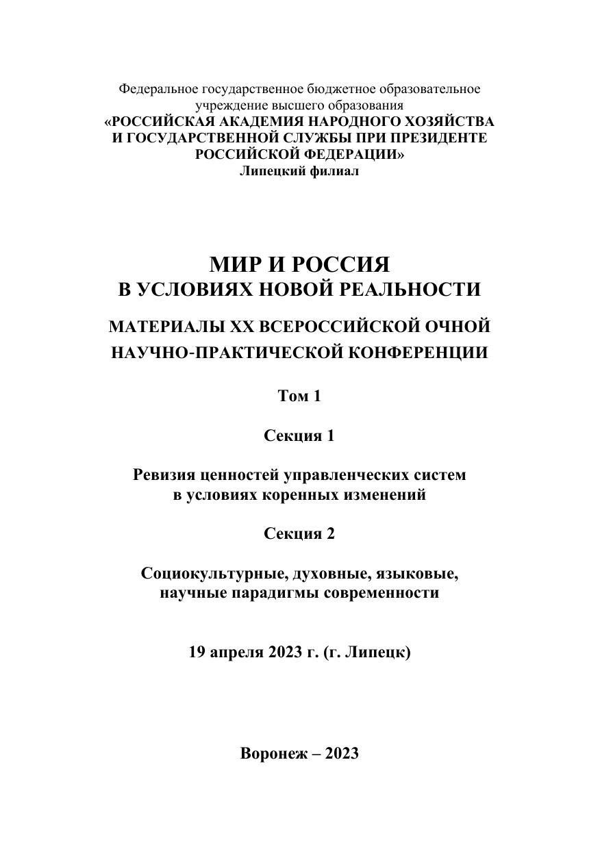 Мир и Россия в условиях новой реальности: материалы ХX Всероссийской очной научно-практической конференции (Липецк, 19 апреля 2023 г.): в 3-х т. Т.1. Секция 1. Ревизия ценностей управленческих систем в условиях коренных изменений. Секция 2. Социокультурные, духовные, языковые, научные парадигмы современности