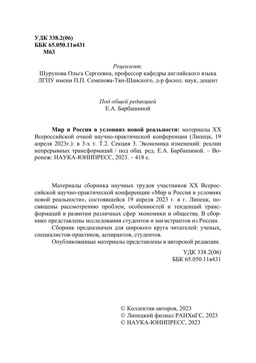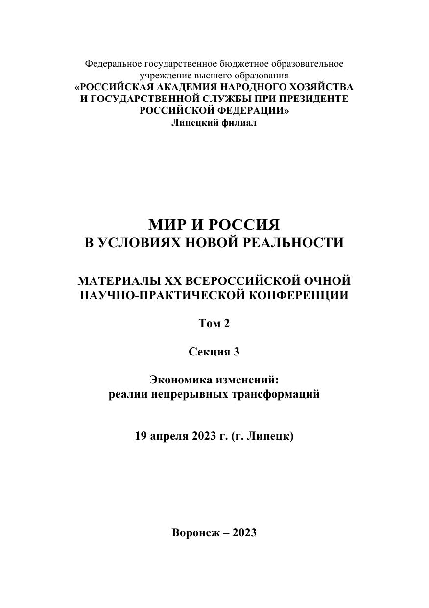 Мир и Россия в условиях новой реальности: материалы ХXВсероссийской очной научно‐практической конференции (Липецк, 19 апреля 2023г.): в 3-х т. Т.2. Секция 3. Экономика изменений: реалии непрерывных трансформаций