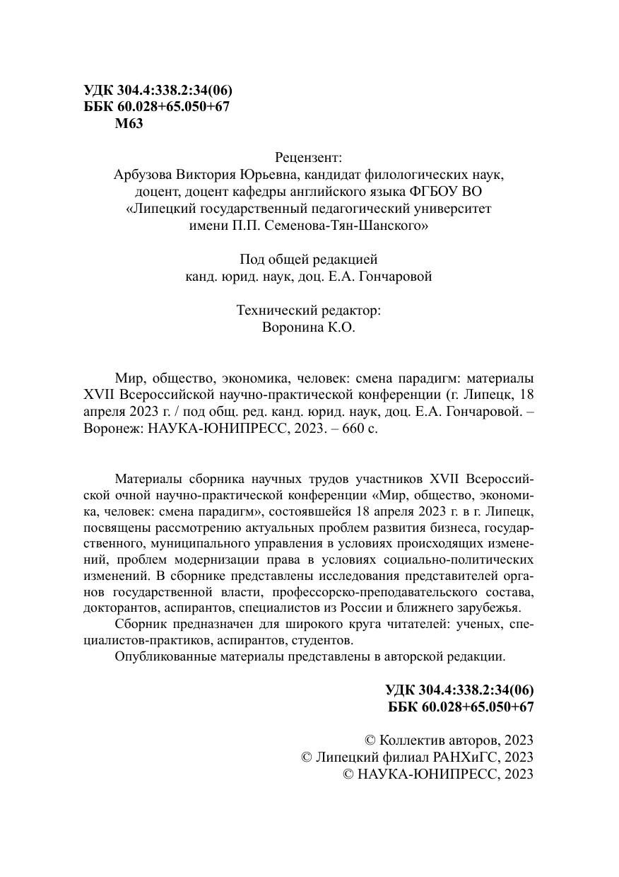 Материалы сборника научных трудов участников XVII Всероссийской очной научно-практической конференции «Мир, общество, экономика, человек: смена парадигм», состоявшейся 18 апреля 2023 г. в г. Липецк, посвящены рассмотрению актуальных проблем развития бизнеса, государственного, муниципального управления в условиях происходящих изменений, проблем модернизации права в условиях социально-политических изменений. В сборнике представлены исследования представителей органов государственной власти, профессорско-преподавательского состава, докторантов, аспирантов, специалистов из России и ближнего зарубежья. Сборник предназначен для широкого круга читателей: ученых, специалистов-практиков, аспирантов, студентов. Опубликованные материалы представлены в авторской редакции.