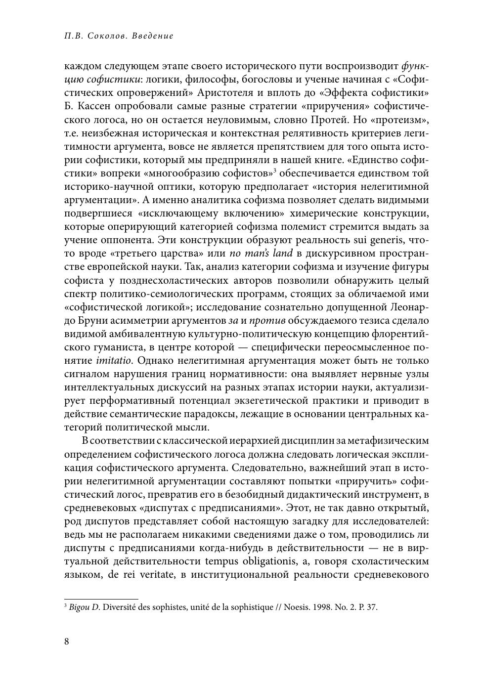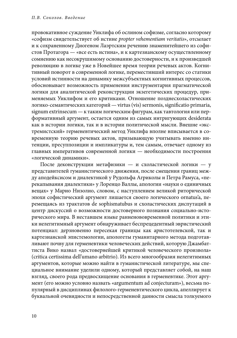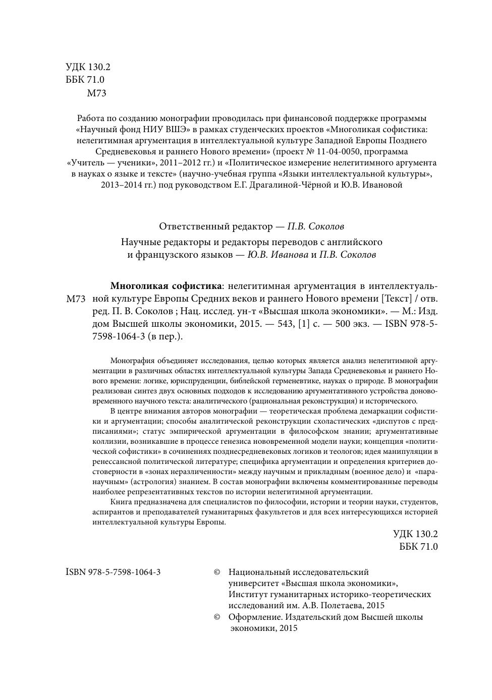 Монография объединяет исследования, целью которых является анализ нелегитимной аргументации в различных областях интеллектуальной культуры Запада Средневековья и раннего Нового времени: логике, юриспруденции, библейской герменевтике, науках о природе. В монографии реализован синтез двух основных подходов к исследованию аргументативного устройства донововременного научного текста: аналитического (рациональная реконструкция) и исторического. В центре внимания авторов монографии — теоретическая проблема демаркации софистики и аргументации; способы аналитической реконструкции схоластических «диспутов с предписаниями»; статус эмпирической аргументации в философском знании; аргументативные коллизии, возникавшие в процессе генезиса нововременной модели науки; концепция «политической софистики» в сочинениях позднесредневековых логиков и теологов; идея манипуляции в ренессансной политической литературе; специфика аргументации и определения критериев достоверности в «зонах неразличенности» между научным и прикладным (военное дело) и «паранаучным» (астрология) знанием. В состав монографии включены комментированные переводы