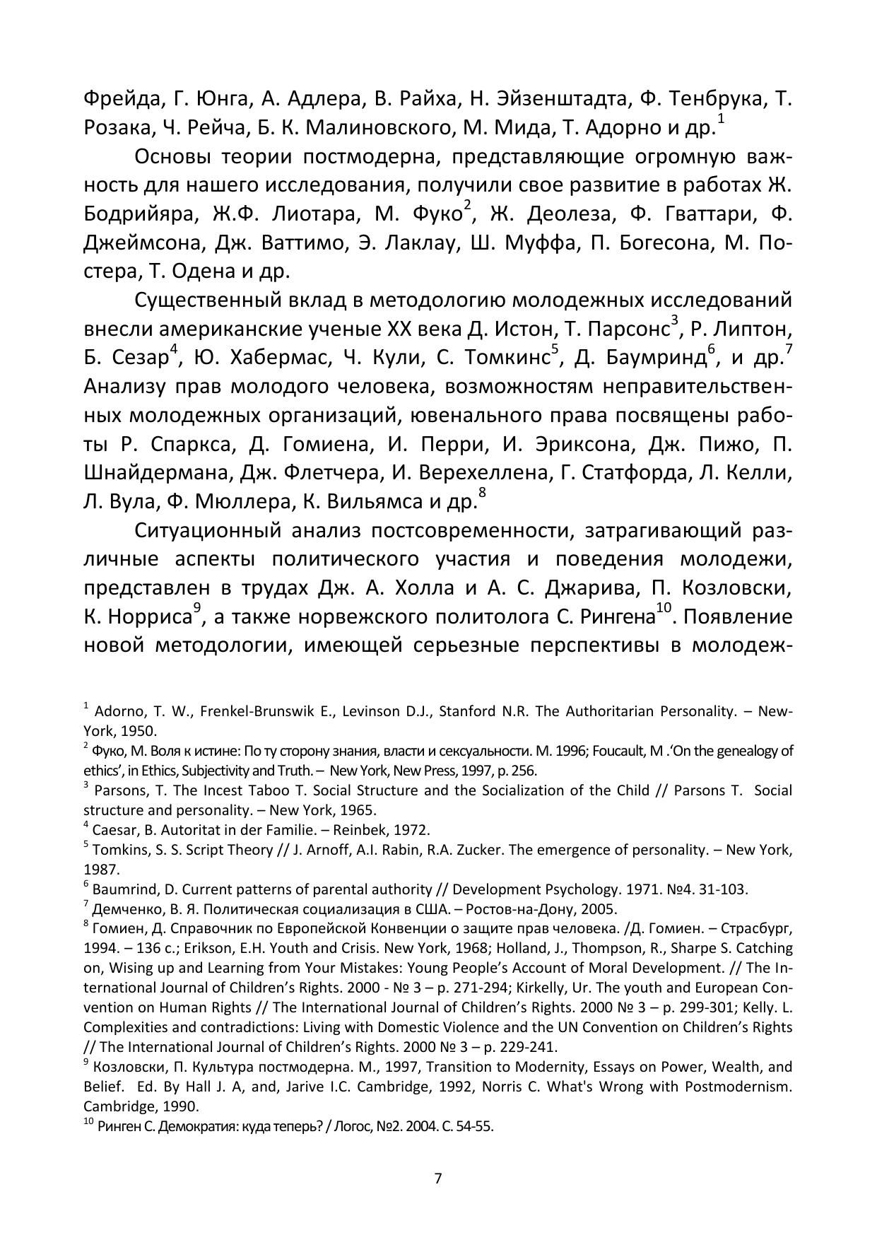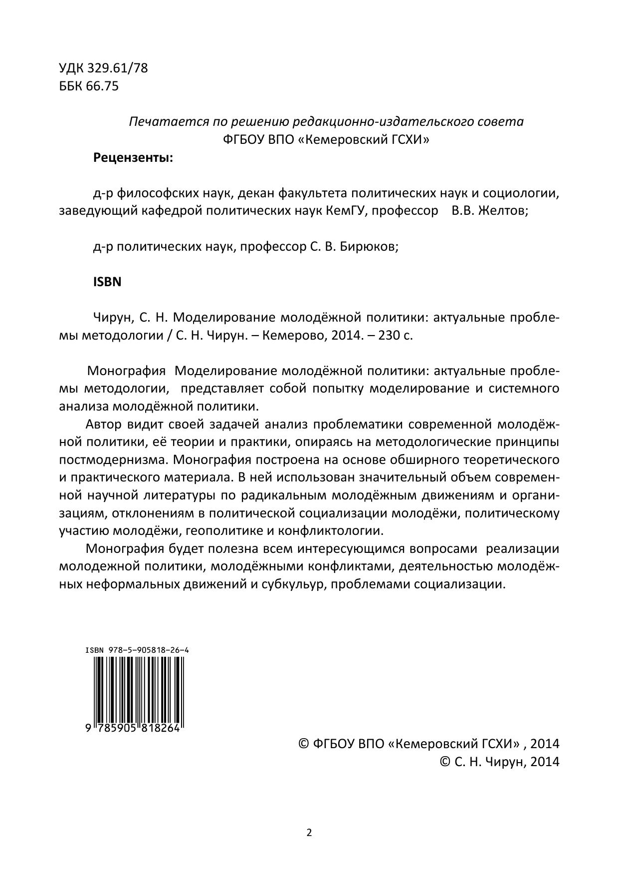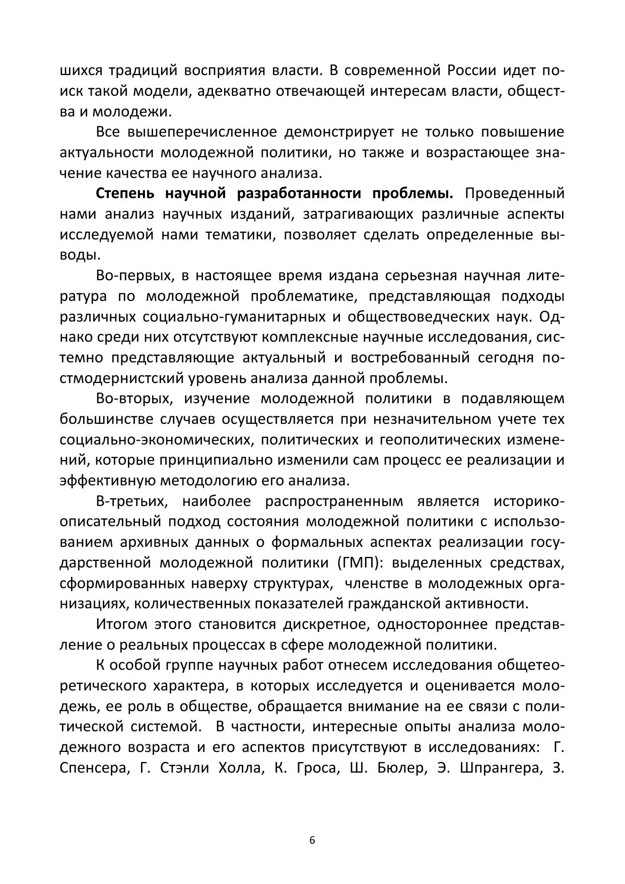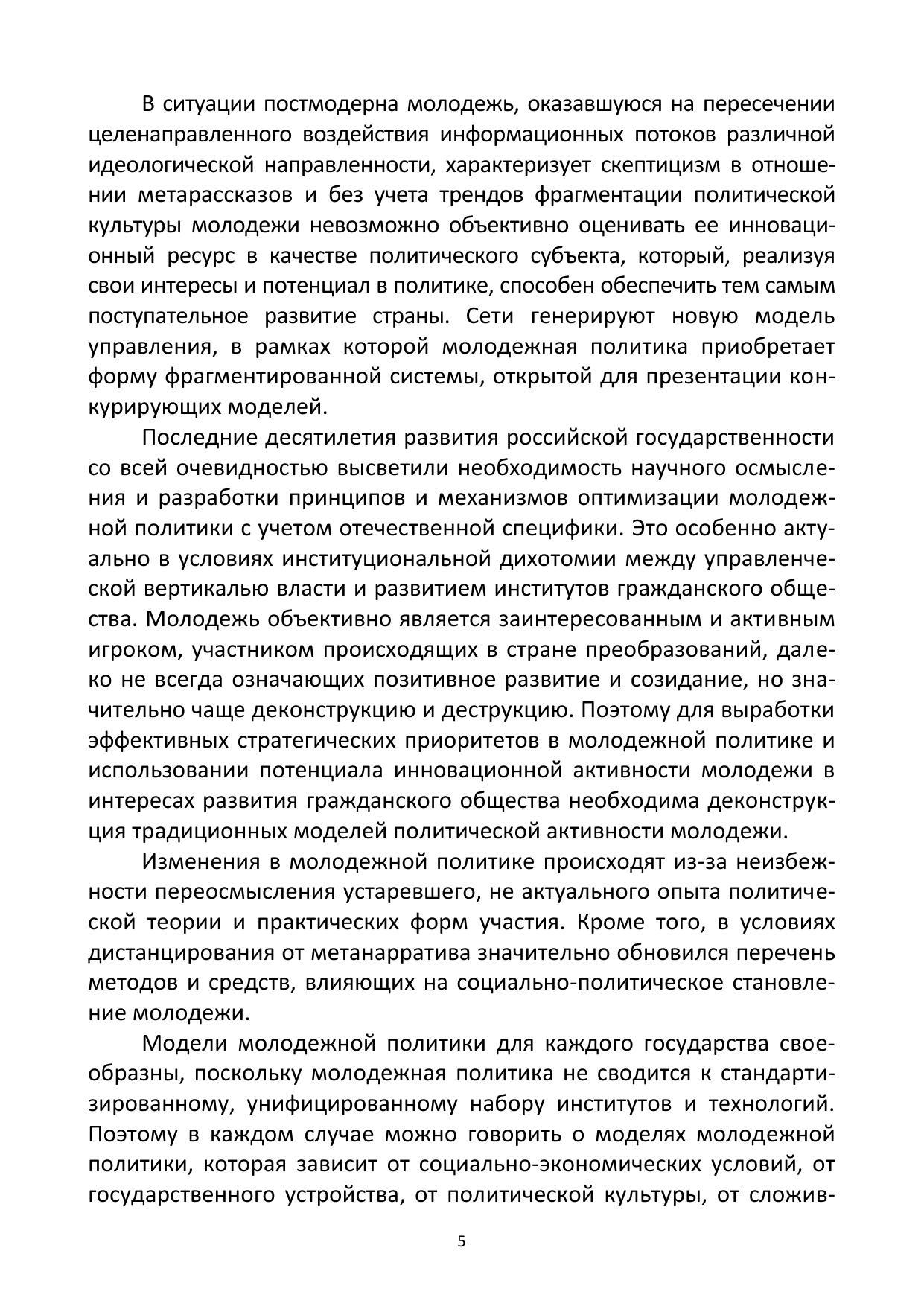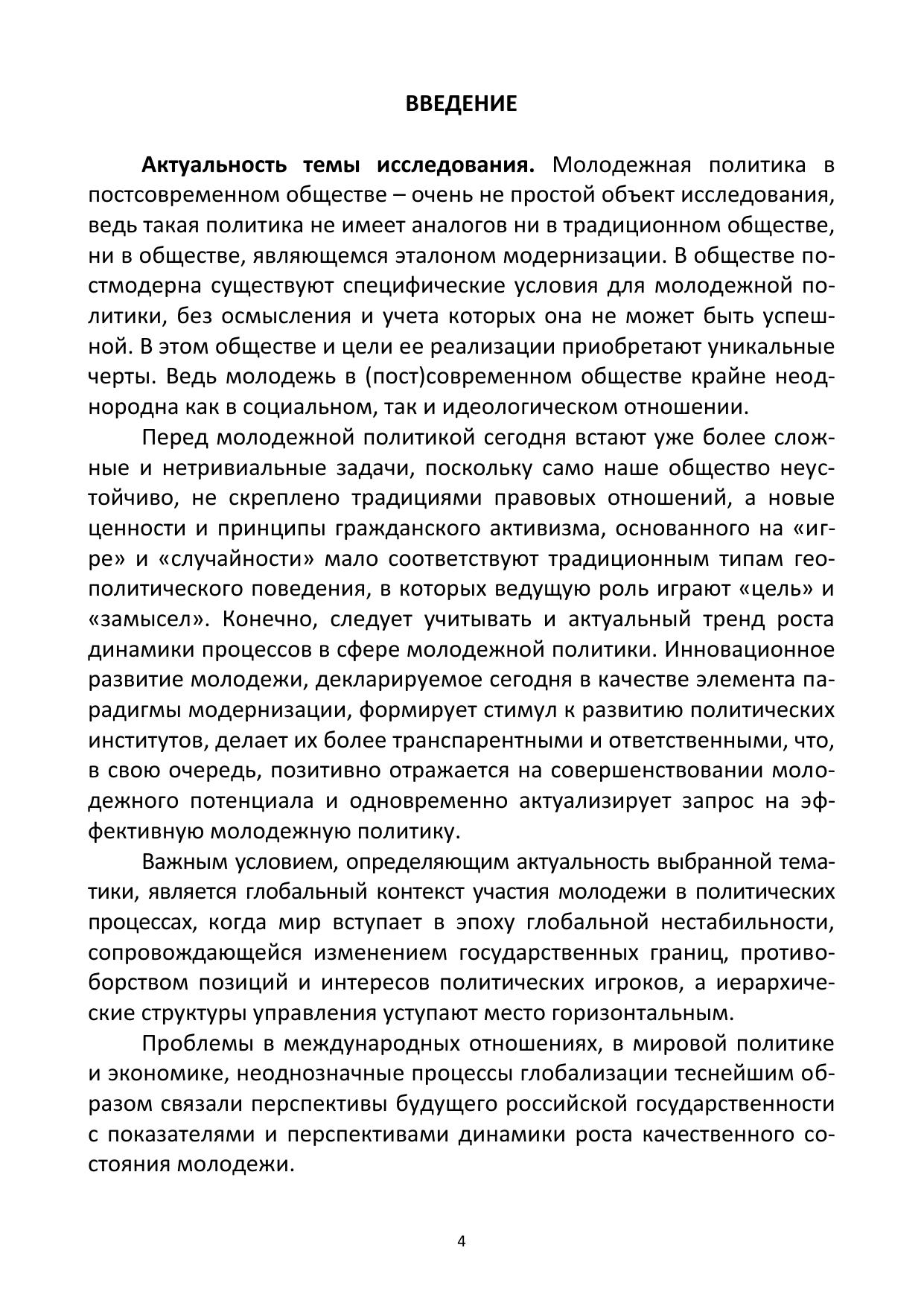 Автор видит своей задачей анализ проблематики современной молодёжной политики, её теории и практики, опираясь на методологические принципы постмодернизма. Монография построена на основе обширного теоретического и практического материала. В ней использован значительный объем современной научной литературы по радикальным молодёжным движениям и организациям, отклонениям в политической социализации молодёжи, политическому участию молодёжи, геополитике и конфликтологии.