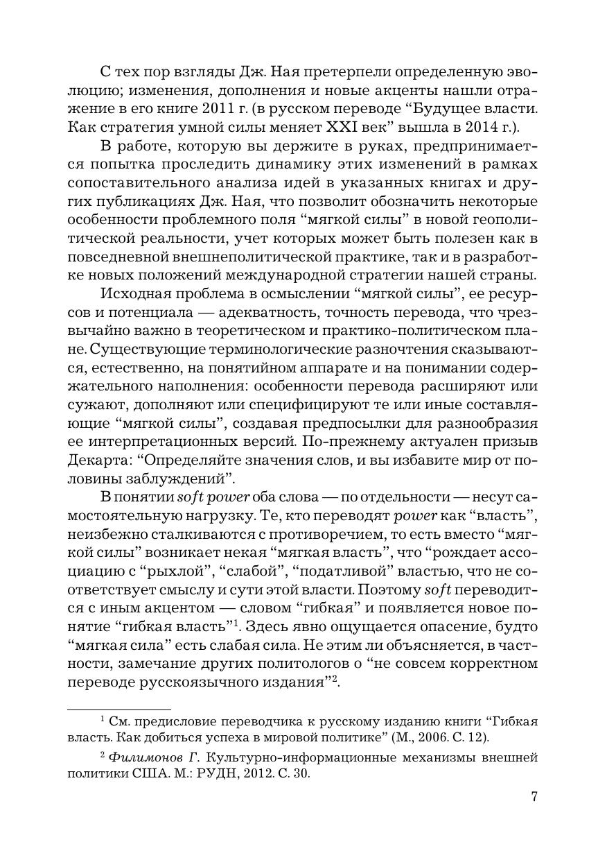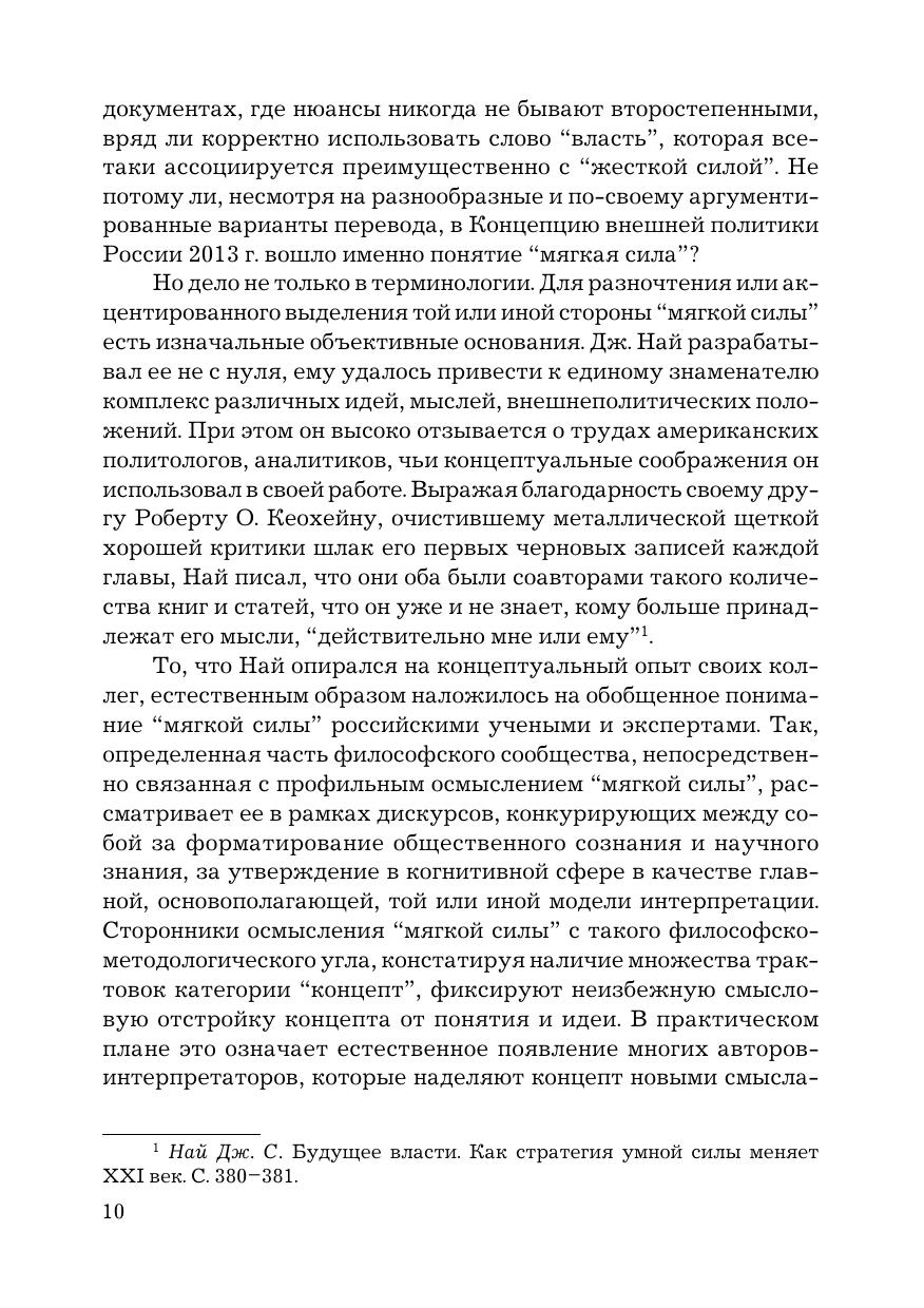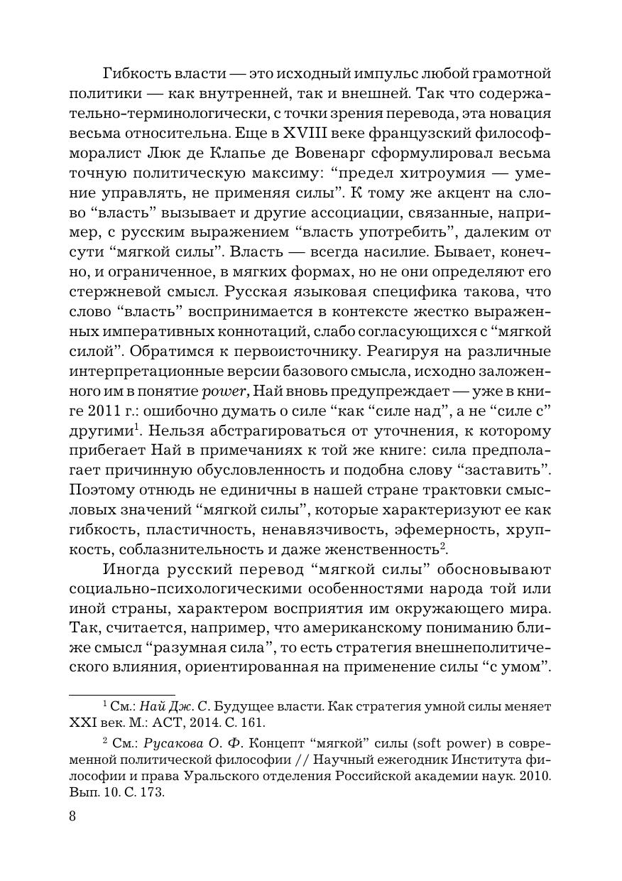 В книге раскрываются особенности проблемного поля «мягкой силы» в кардинально изменившейся геополитической реальности наших дней. В рамках концептуализации «мягкой силы» и анализа баланса между ней и «жесткой силой» исследуется феномен «умной силы» как взаимосвязанная целостность различных компонентов — культурно-гуманитарных, цивилизационных, социально-политических, экономических, военных и т. д. Отражены различные точки зрения на проблематику «мягкой силы», российский опыт ее критического анализа. Издание предназначено для преподавателей, аспирантов и магистрантов профильных вузов и факультетов, а также для широкого круга читателей, интересующихся мировой политикой и международными отношениями.