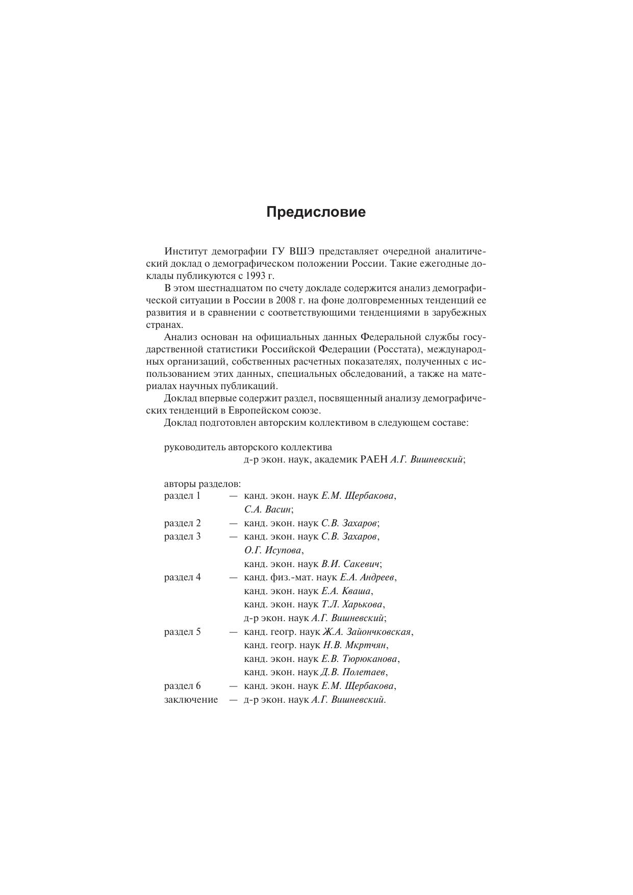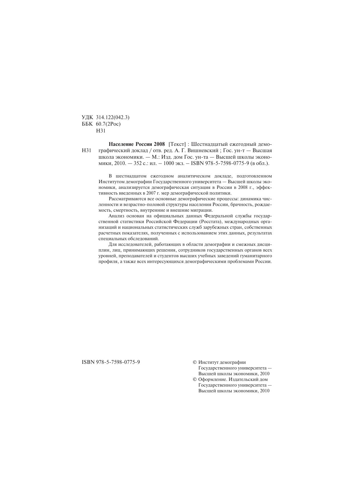 В шестнадцатом ежегодном аналитическом докладе, подготовленном Институтом демографии Государственного университета — Высшей школы экономики, анализируется демографическая ситуация в России в 2008 г., эффективность введенных в 2007 г. мер демографической политики. Рассматриваются все основные демографические процессы: динамика численности и возрастно-половой структуры населения России, брачность, рождаемость, смертность, внутренние и внешние миграции. Анализ основан на официальных данных Федеральной службы государственной статистики Российской Федерации (Росстата), международных организаций и национальных статистических служб зарубежных стран, собственных расчетных показателях, полученных с использованием этих данных, результатах специальных обследований. Для исследователей, работающих в области демографии и смежных дисциплин, лиц, принимающих решения, сотрудников государственных органов всех уровней, преподавателей и студентов высших учебных заведений гуманитарного профиля, а также всех интересующихся демографическими проблемами России.