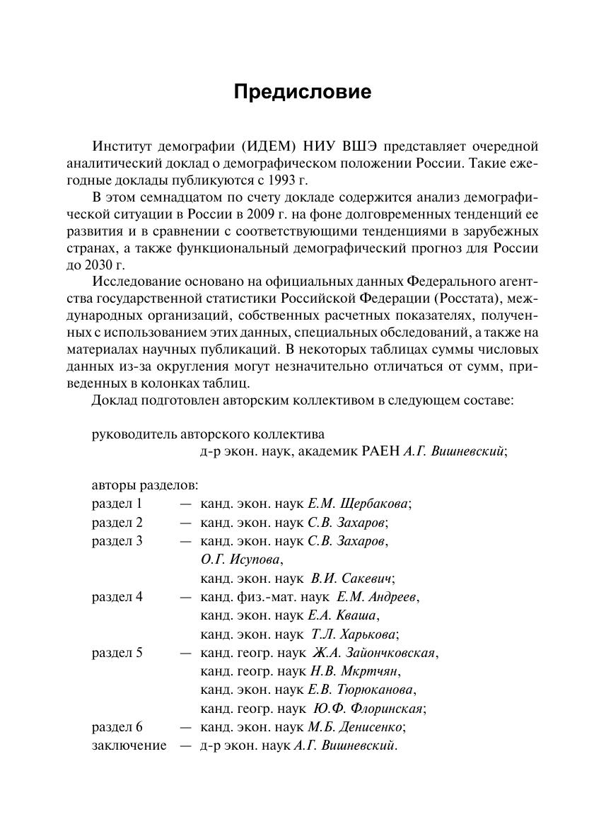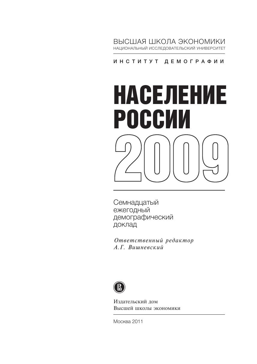 В семнадцатом ежегодном аналитическом докладе, подготовленном Институтом демографии НИУ ВШЭ, анализируется демографическая ситуация в России в 2009 г., эффективность введенных в 2007 г. мер демографической политики. Рассматриваются все основные демографические процессы: динамика численности населения России, брачность, рождаемость, смертность, внутренние и внешние миграции. В докладе содержится функциональный демографический прогноз для России до 2030 г. Анализ основан на официальных данных Федерального агентства государственной статистики Российской Федерации (Росстата), международных организаций и национальных статистических служб зарубежных стран, собственных расчетных показателях, полученных с использованием этих данных, результатах специальных обследований. Для исследователей, работающих в области демографии и смежных дисциплин, лиц, принимающих решения, сотрудников государственных органов всех уровней, преподавателей и студентов высших учебных заведений гуманитарного профиля, а также всех интересующихся демографическими проблемами России.