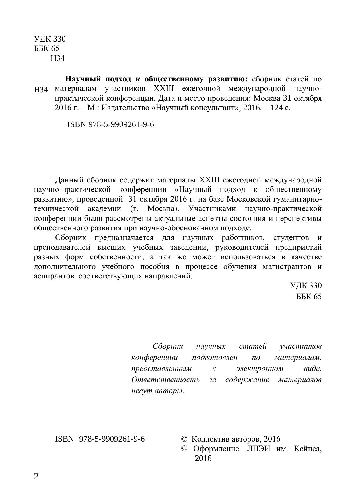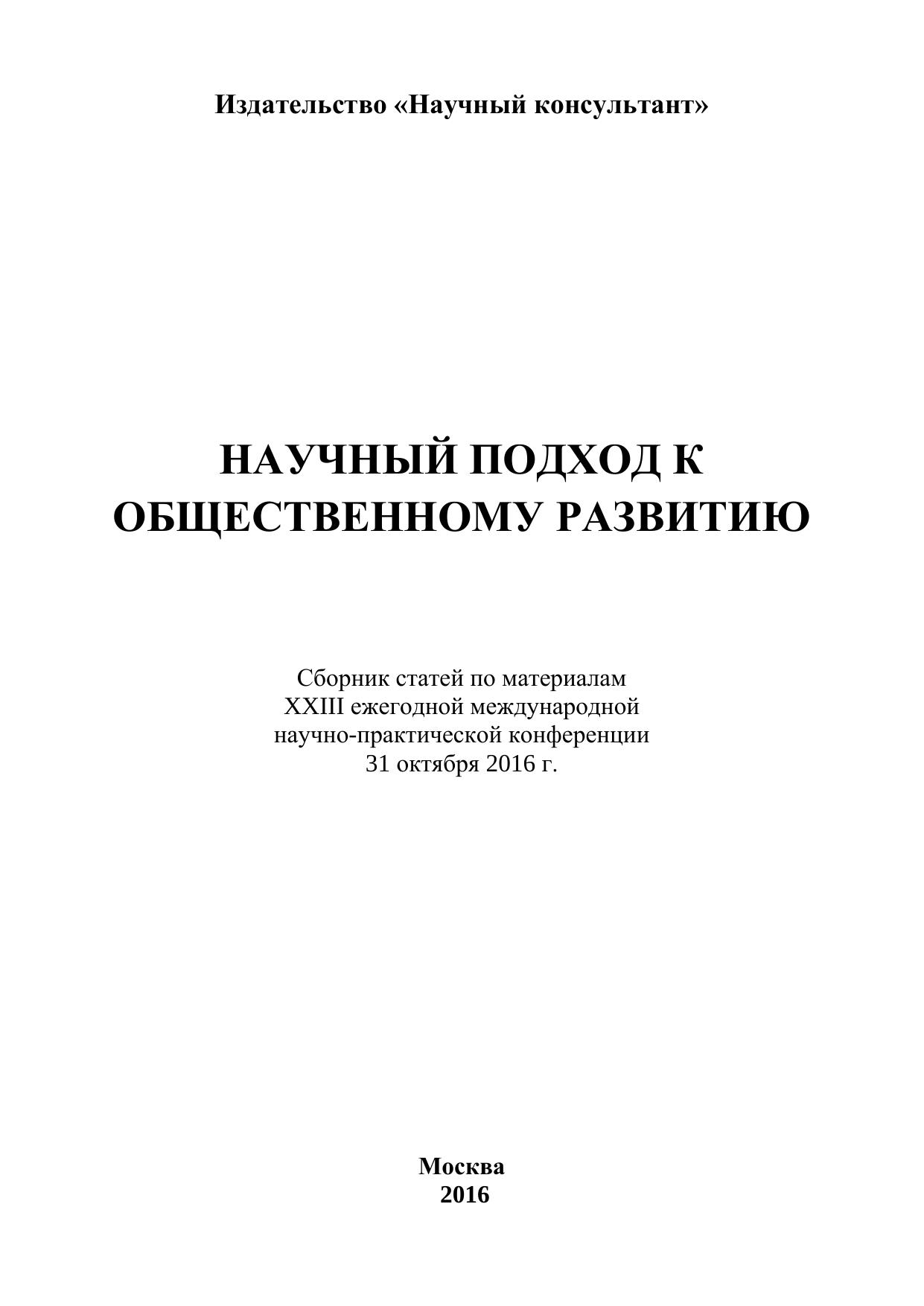 Данный сборник содержит материалы XXIII ежегодной международной научно-практической конференции «Научный подход к общественному развитию», проведенной 31 октября 2016 г. на базе Московской гуманитарно-технической академии (г. Москва). Участниками научно-практической конференции были рассмотрены актуальные аспекты состояния и перспективы общественного развития при научно-обоснованном подходе.