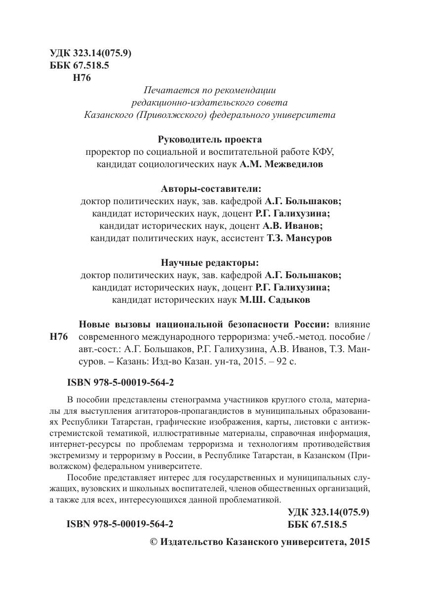 В пособии представлены стенограмма участников круглого стола, материалы для выступления агитаторов-пропагандистов в муниципальных образованиях Республики Татарстан, графические изображения, карты, листовки с антиэкстремистской тематикой, иллюстративные материалы, справочная информация, интернет-ресурсы по проблемам терроризма и технологиям противодействия экстремизму и терроризму в России, в Республике Татарстан, в Казанском (Приволжском) федеральном университете. Пособие представляет интерес для государственных и муниципальных служащих, вузовских и школьных воспитателей, членов общественных организаций, а также для всех, интересующихся данной проблематикой.
