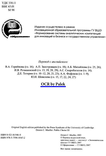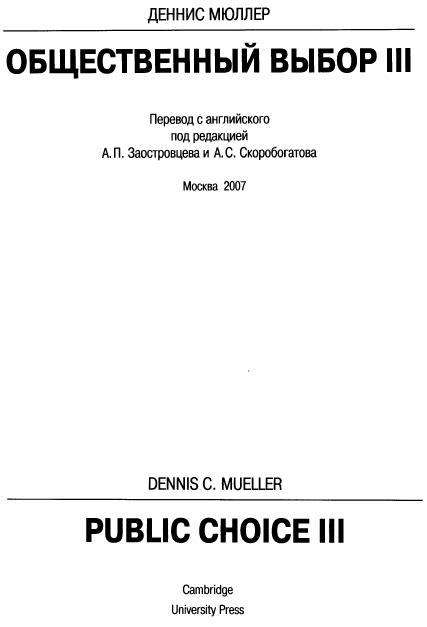 Деннис Мюллер — профессор экономики Венского университета. До этого многие годы преподавал в университете Мэриленда. Среди его наиболее известных работ— книга «Конституционная демократия». Под его редакцией увидела свет книга «Перспективы общественного выбора», в которой собраны статьи тех экономистов, которые внесли серьезный вклад в теорию общественного выбора (включая, естественно, самого Д. Мюллера). Эти статьи написаны специально для данной книги так, чтобы читатель получил возможно полное представление о всех сторонах этой теории. В то же время поистине всемирную славу Д. Мюллеру принесла публикация наиболее полных и систематизированных обзоров теории общественного выбора. Их можно даже назвать энциклопедиями данной теории. Не говоря уже о том, что они являются незаменимыми пособиями для преподавателей, которые хотят познакомить студентов с новой политической экономией, как иногда именуют теорию общественного выбора. В книге охвачены все основные проблемы теории. Они включают объяснение существования государства, правила голосования, федерализм, теорию клубов, двухпартийные и многопартийные электоральные системы, поиск ренты, бюрократию, группы интересов, диктатуру, размеры государства, участие избирателя и политические деловые циклы. Нормативные вопросы теории общественного выбора также включены в книгу. В том числе нормативный анализ правила простого большинства, функции общественного благосостояния Бергсона-Самуэльсона, теоремы Эрроу и Сена о невозможности, теория общественного договора Роулза и конституционная политическая экономия Бьюкенена и Таллока.