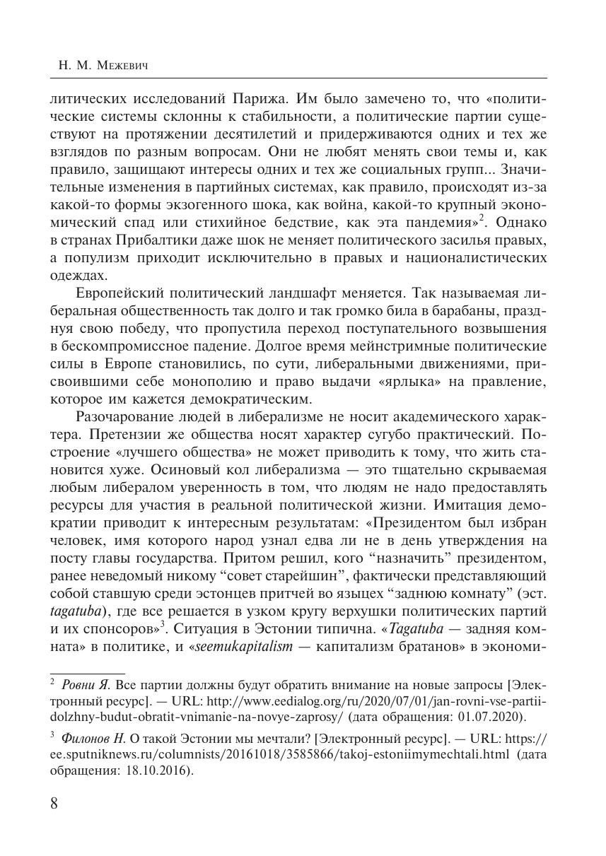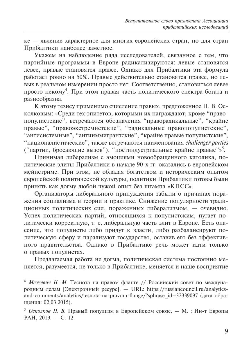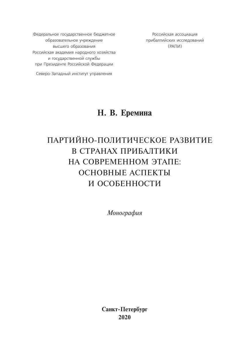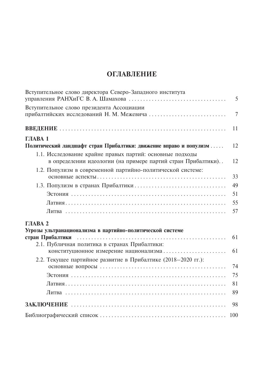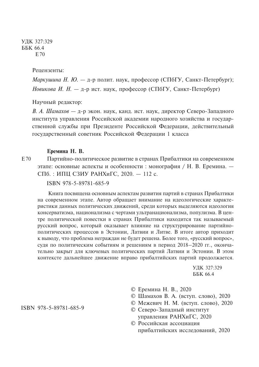 Книга посвящена основным аспектам развития партий в странах Прибалтики на современном этапе. Автор обращает внимание на идеологические характеристики данных политических движений, среди которых выделяются идеология консерватизма, национализма с чертами ультранационализма, популизма. В центре политической повестки в странах Прибалтики находится так называемый русский вопрос, который оказывает влияние на структурирование партийнополитических процессов в Эстонии, Латвии и Литве. В итоге автор приходит к выводу, что проблема неграждан не будет решена. Более того, «русский вопрос», судя по политическим событиям и решениям в период 2018–2020 гг., окончательно закрыт для ключевых политических партий Латвии и Эстонии. В этом контексте дальнейшее движение вправо прибалтийских партий продолжается.