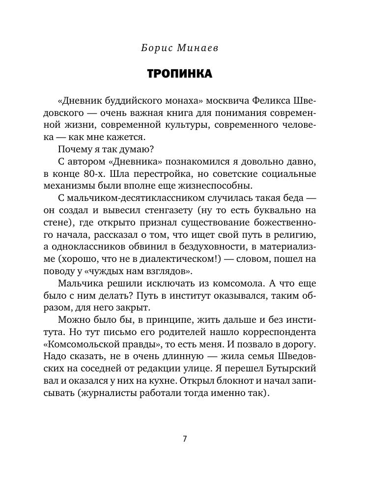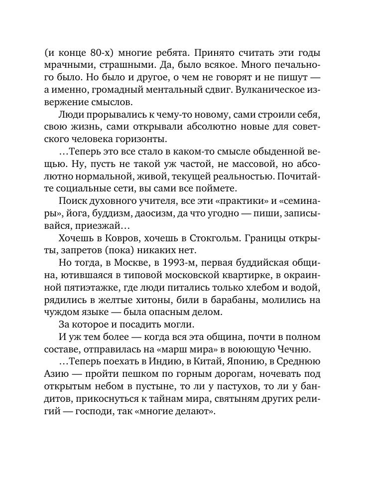 «Я не спешил становиться верующим, а воспринимал буддизм скорее как исследователь-психолог. Позже я узнал, что сам Будда советовал именно так относиться ко всем его словам: «Ничего не берите на веру, все проверяйте на собственном опыте…». Как бы то ни было, 8 января 1994 года я побрил голову и стал монахом ордена Ниппондзан Мёходзи.Через полгода пришло время ехать в Японию. Сэнсэй решил, что в Японию мы поедем через Китай». Потом были Индия и Непал, потом опять Китай и Япония. Пять лет странствий в желтом одеянии и с барабаном в руках. И пять томов дневников — они перед вами.