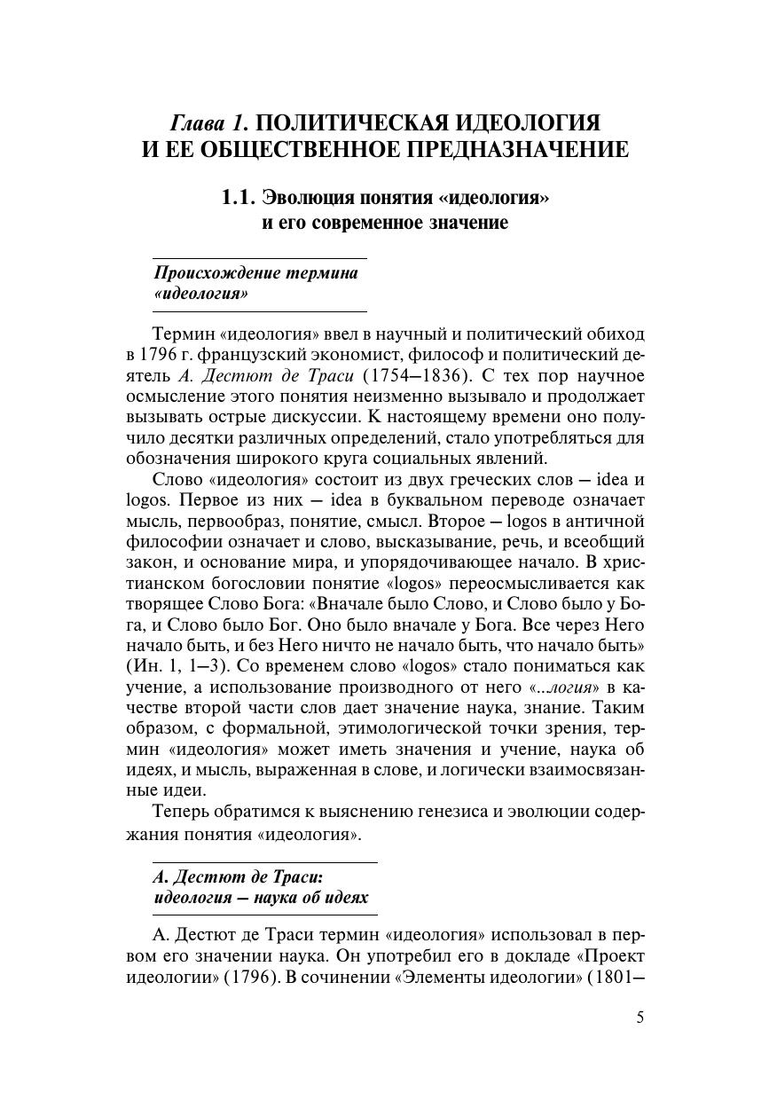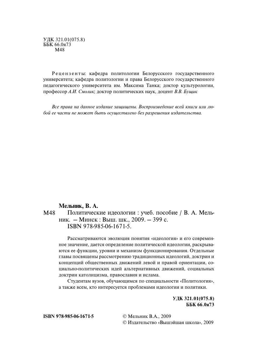 Рассматриваются эволюция понятия "идеология" и его современное значение, дается определение политической идеологии, раскрываются ее функции и уровни функционирования. Отдельные разделы посвящены рассмотрению традиционных идеологий, доктрин и концепций общественных движений левой и правой ориентации, социально-политических идей альтернативных движений, социальных доктрин католицизма, православия и ислама. Для студентов вузов, всех, кто интересуется проблемами идеологии и политологии.