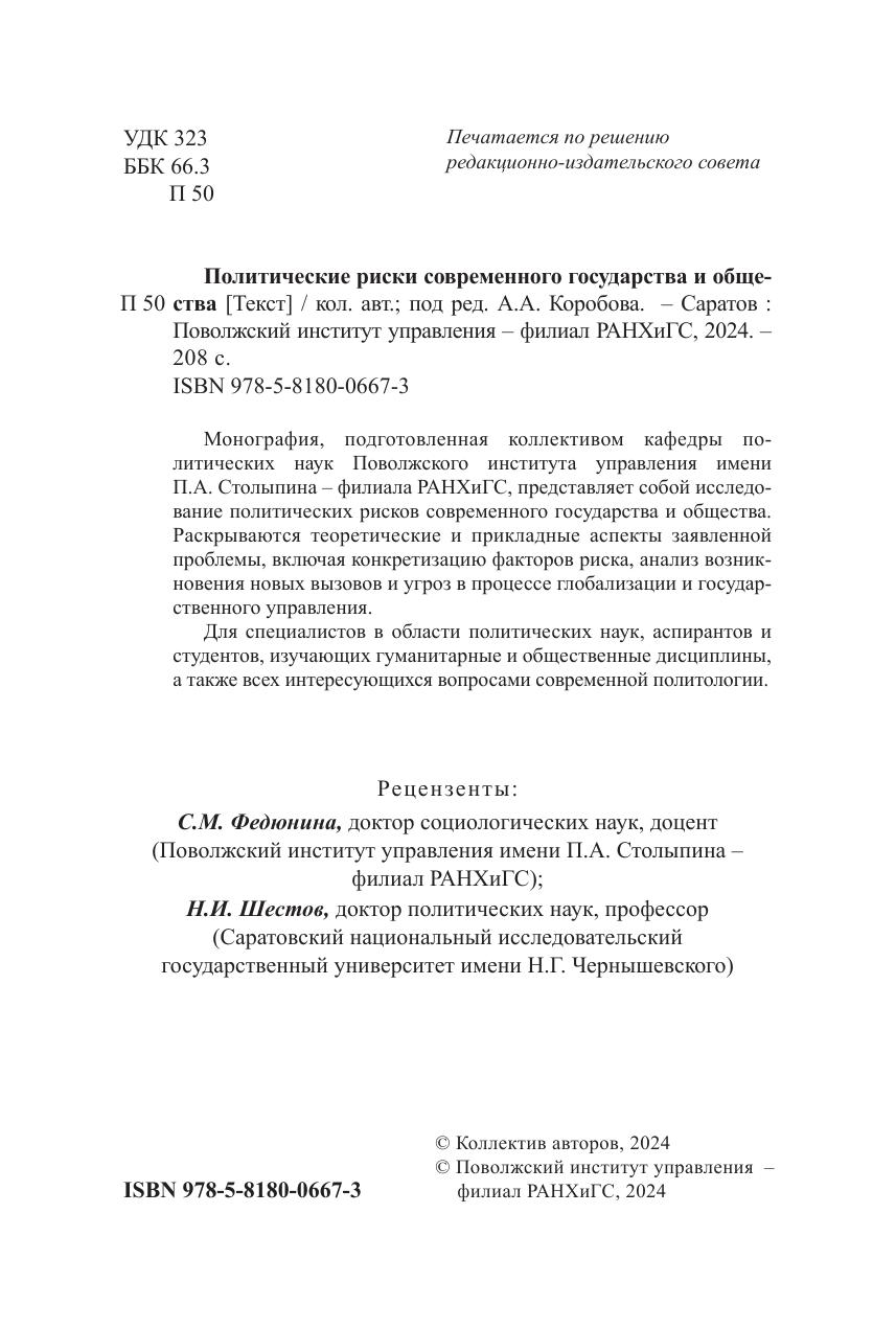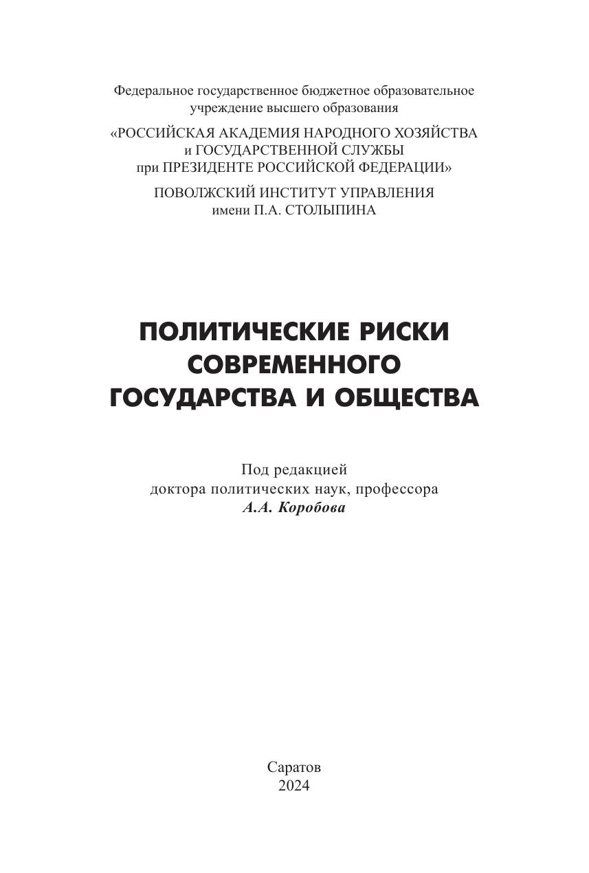 Монография, подготовленная коллективом кафедры политических наук Поволжского института управления имени П.А. Столыпина – филиала РАНХиГС, представляет собой исследование политических рисков современного государства и общества. Раскрываются теоретические и прикладные аспекты заявленной проблемы, включая конкретизацию факторов риска, анализ возникновения новых вызовов и угроз в процессе глобализации и государственного управления. Для специалистов в области политических наук, аспирантов и студентов, изучающих гуманитарные и общественные дисциплины, а также всех интересующихся вопросами современной политологии.
