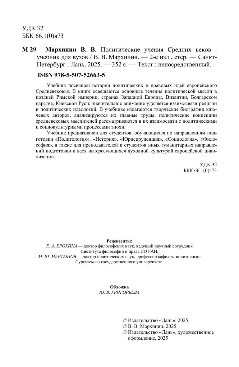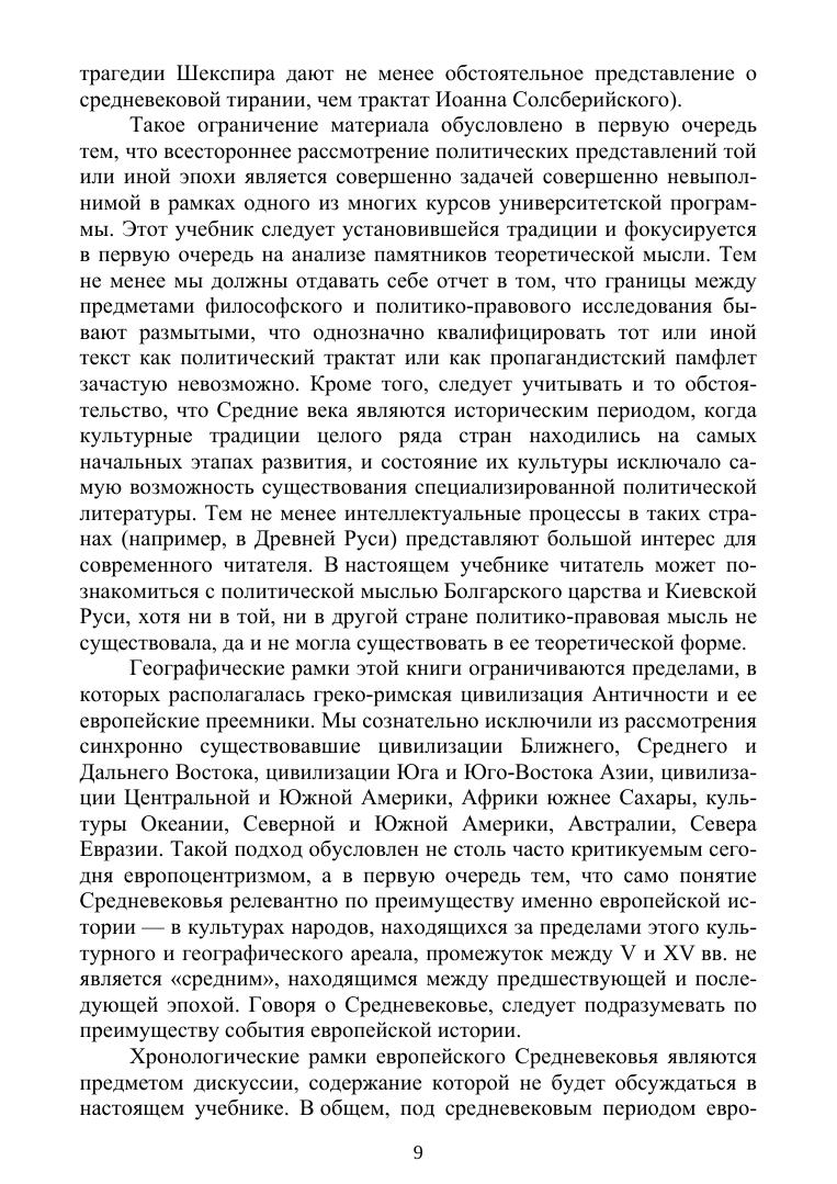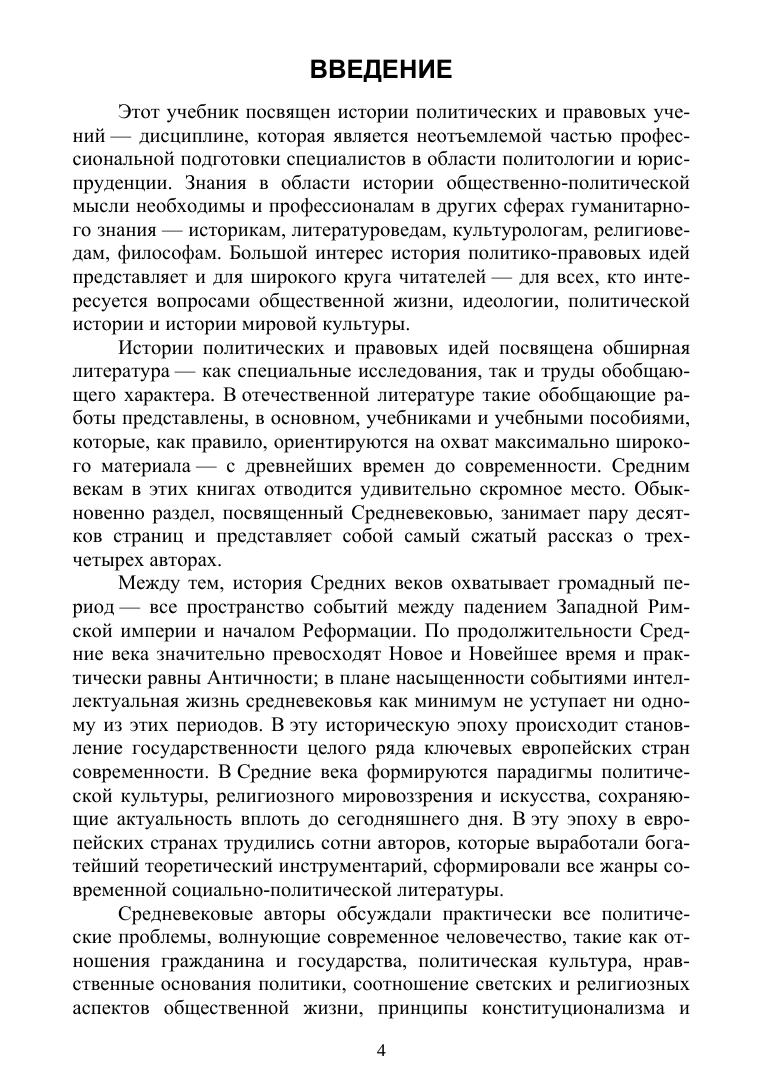 Учебник посвящен истории политических и правовых идей европейского Средневековья. В книге освещаются основные течения политической мысли в поздней Римской империи, странах Западной Европы, Византии, Болгарском царстве, Киевской Руси, значительное внимание уделяется взаимосвязи религии и политических идеологий. В учебнике излагаются творческие биографии ключевых авторов, анализируются их главные труды, политические концепции средневековых мыслителей рассматриваются в их взаимосвязи с политическими и социокультурными процессами эпохи. Учебник предназначен для студентов, обучающихся по направлениям подготовки «Политология», «История», «Юриспруденция», «Социология», «Философия», а также для преподавателей и студентов иных гуманитарных направлений подготовки и всех интересующихся духовной культурой европейской цивилизации.