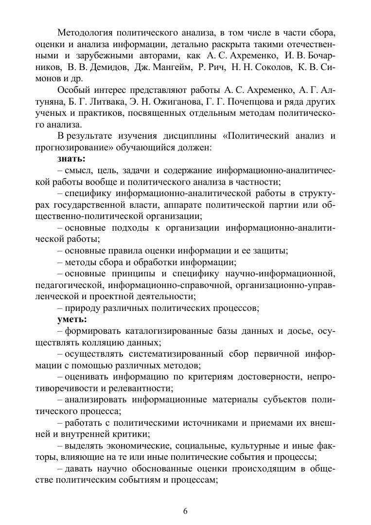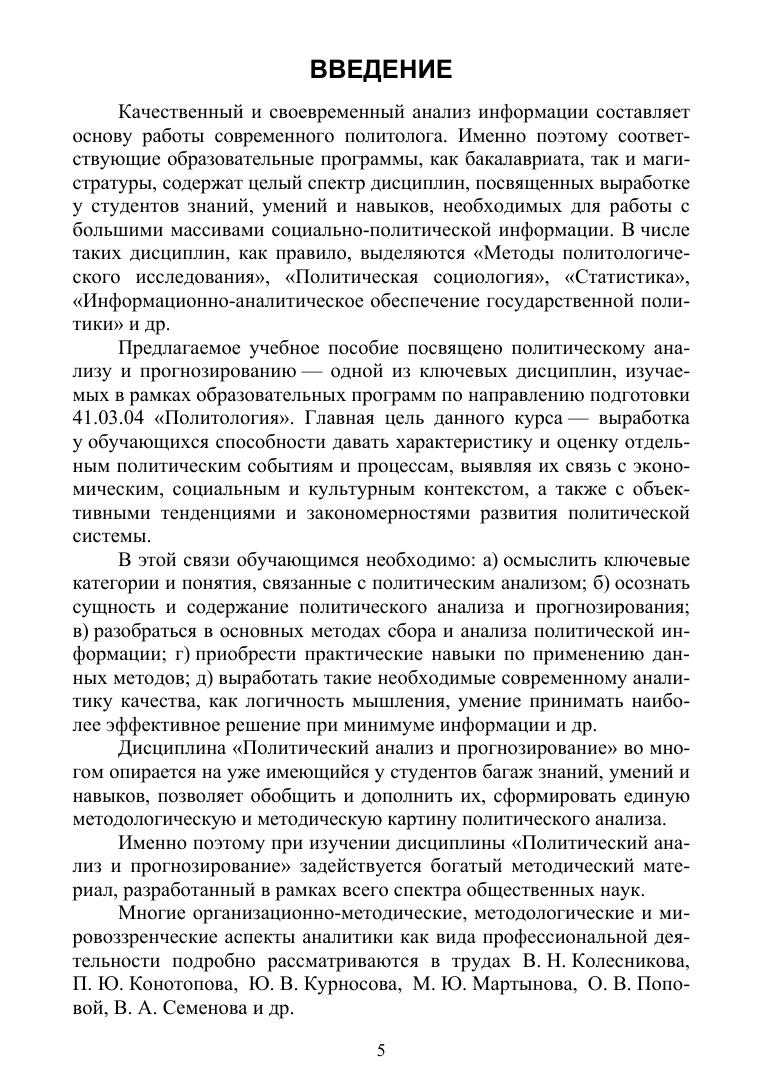 Учебное пособие посвящено политическому анализу и прогнозирова-нию — одной из ключевых дисциплин, изучаемых в рамках образователь-ных программ по направлению подготовки «Политология». Главная цель данного курса — выработка у обучающихся способности выявлять сущ-ностные черты и давать оценку отдельным политическим событиям, опре-деляя их связь с экономическим, социальным и культурным контекстом, а также с объективными закономерностями и тенденциями развития полити-ческой системы. Учебное пособие предназначено для студентов, обучающихся по направлению подготовки «Политология»: бакалавров, магистрантов и ас-пирантов. Также представляет интерес для студентов иных социально ори-ентированных направлений подготовки: социологов, культурологов, исто-риков, экономистов. Кроме того, будет полезно всем, кто интересуется по-литической жизнью и стремится самостоятельно разбираться в текущих со-циально-политических событиях.