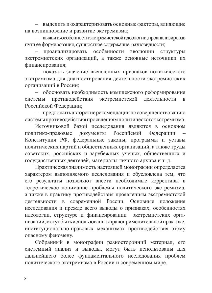 Монография посвящена актуальной теме – теоретическому осмыслению проблемы политического экстремизма в современной России. В исследовании рассматриваются вопросы, связанные с выявлением сущностных признаков, основных факторов, видов политического экстремизма. На основе привлечения разностороннего материала проанализирована идеология, эволюция структуры, каналы финансирования экстремистских организаций. Предпринята попытка обосновать необходимость комплексного реформирования системы противодействия экстремистской деятельности в Российской Федерации. Работа предназначена для политологов, социологов, юристов, сотрудников правоохранительных органов, преподавателей, аспирантов, студентов и всех тех, кто обеспокоен масштабами и опасностью политического экстремизма в России и современном мире.