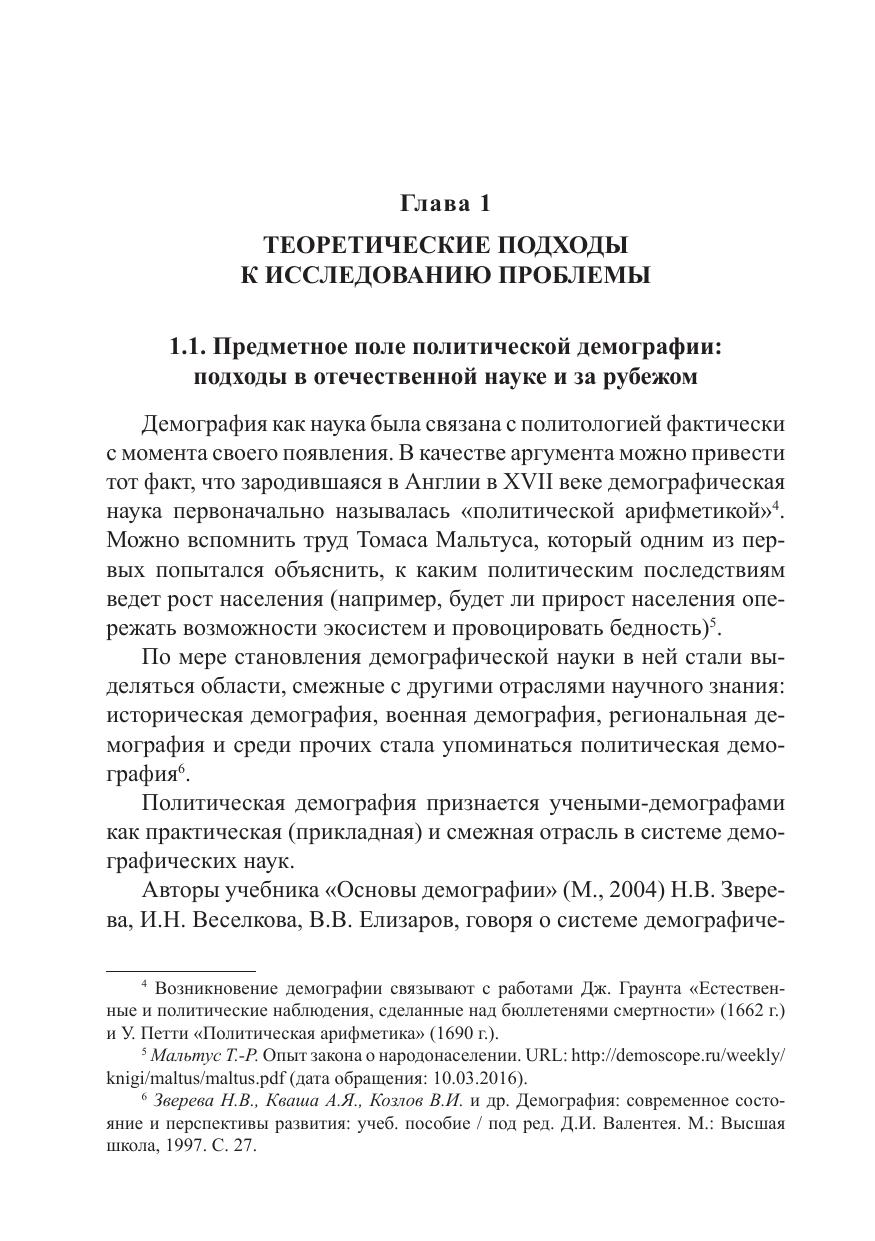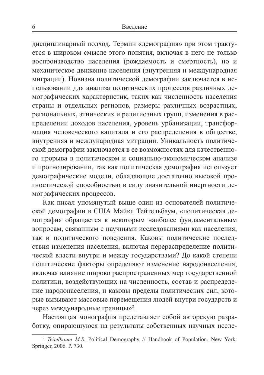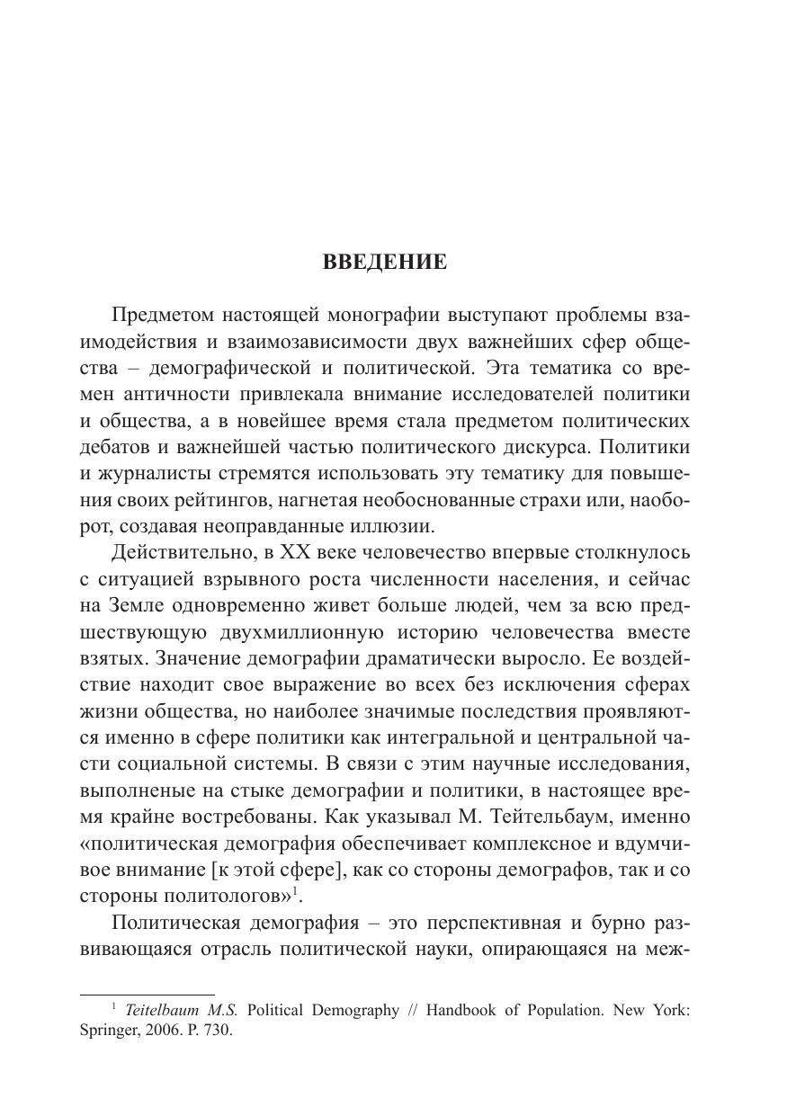 Предметом исследования монографии выступают проблемы взаимодействия и взаимозависимости двух важнейших сфер общества – демографической и политической. Демографические процессы оказывают существенное влияние на стабильность политического режима, направления социальной политики, геополитический потенциал государства, электоральные процессы и т. д., поскольку они способны за достаточно короткое время существенно изменить состав и структуру населения страны или отдельного региона. Монография будет полезна политологам и демографам, заинтересованным в изучении проблем политической демографии.