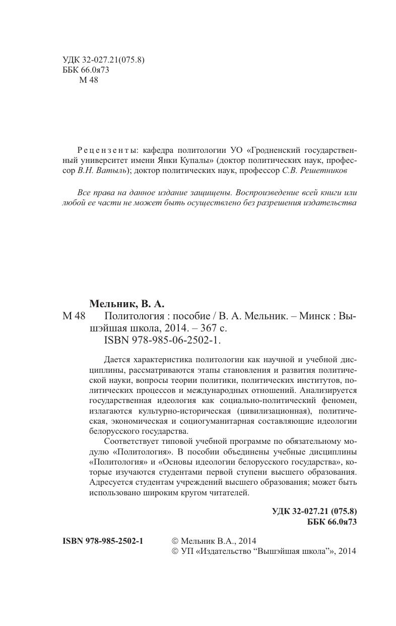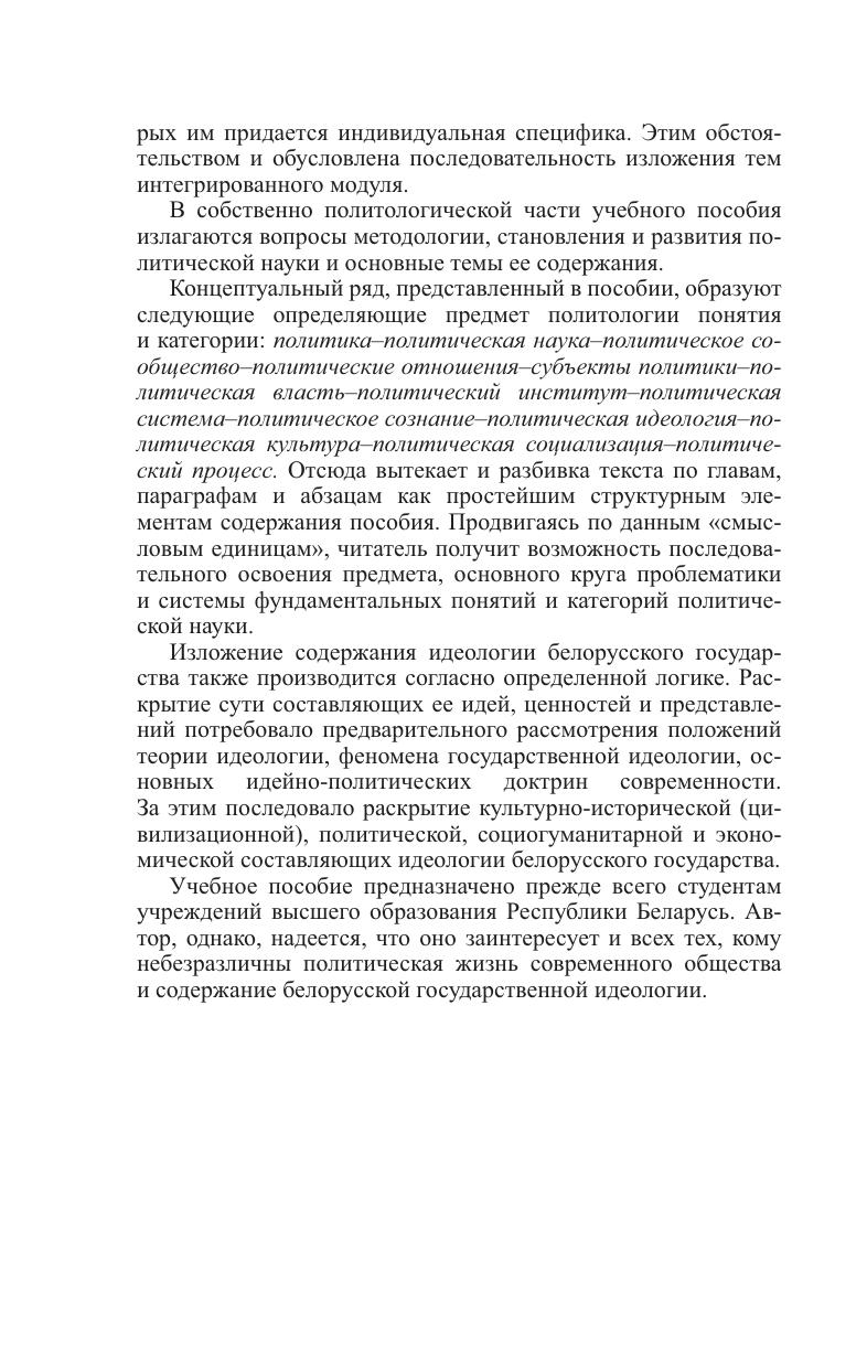 Соответствует типовой учебной программе по обязательному модулю «Политология». В пособии объединены учебные дисциплины «Политология» и «Основы идеологии белорусского государства», которые изучаются студентами первой ступени высшего образования. Адресуется студентам учреждений высшего образования; может быть использовано широким кругом читателей.