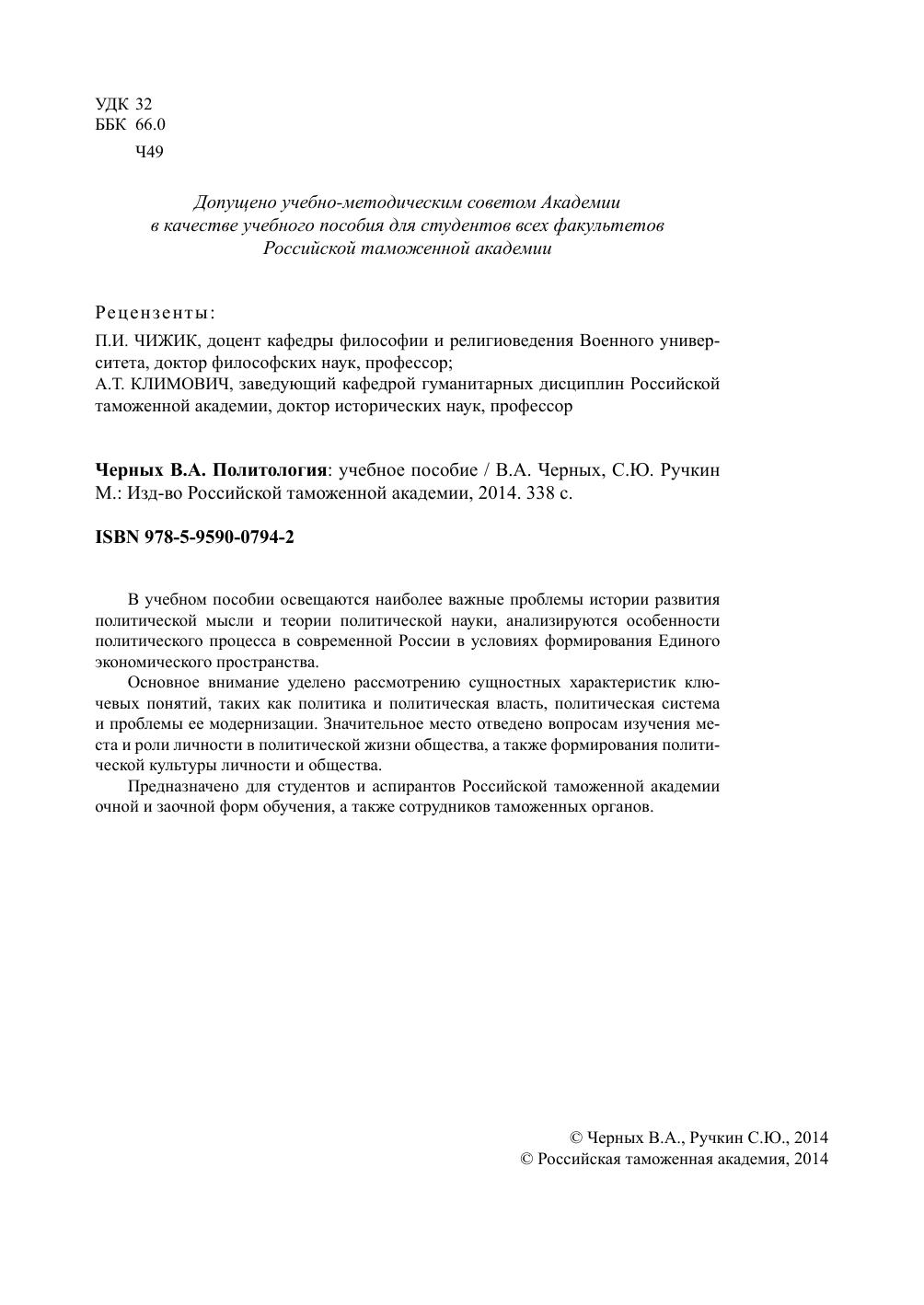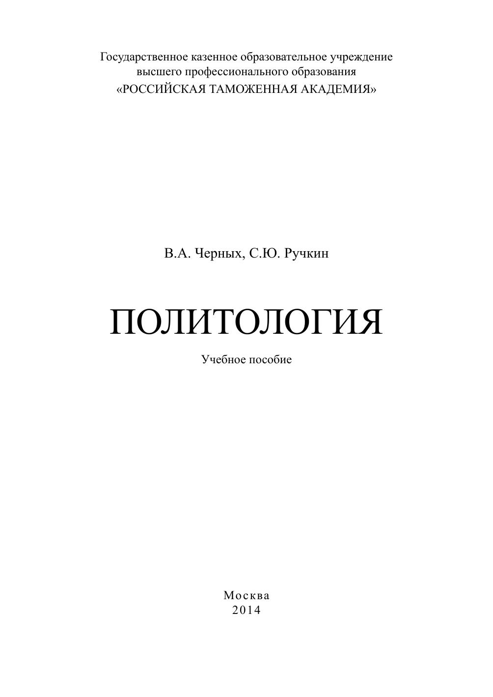 экономического пространства. Основное внимание уделено рассмотрению сущностных характеристик ключевых понятий, таких как политика и политическая власть, политическая система и проблемы ее модернизации. Значительное место отведено вопросам изучения места и роли личности в политической жизни общества, а также формирования политической культуры личности и общества. Предназначено для студентов и аспирантов Российской таможенной академии очной и заочной форм обучения, а также сотрудников таможенных органов.