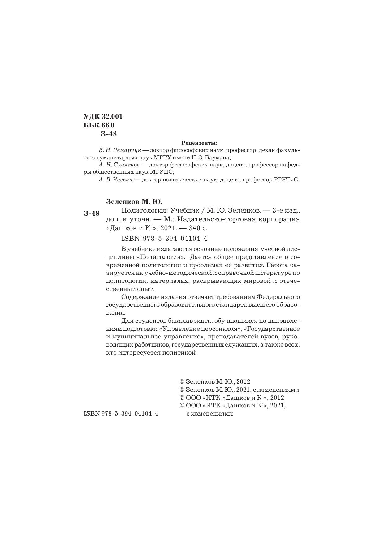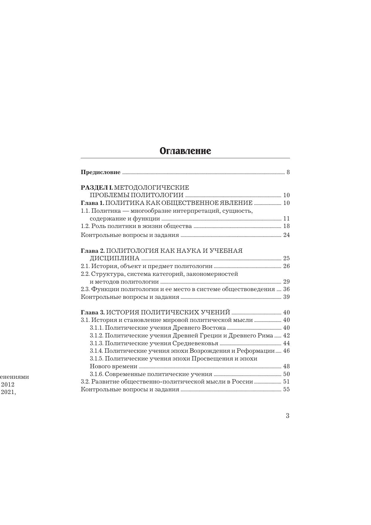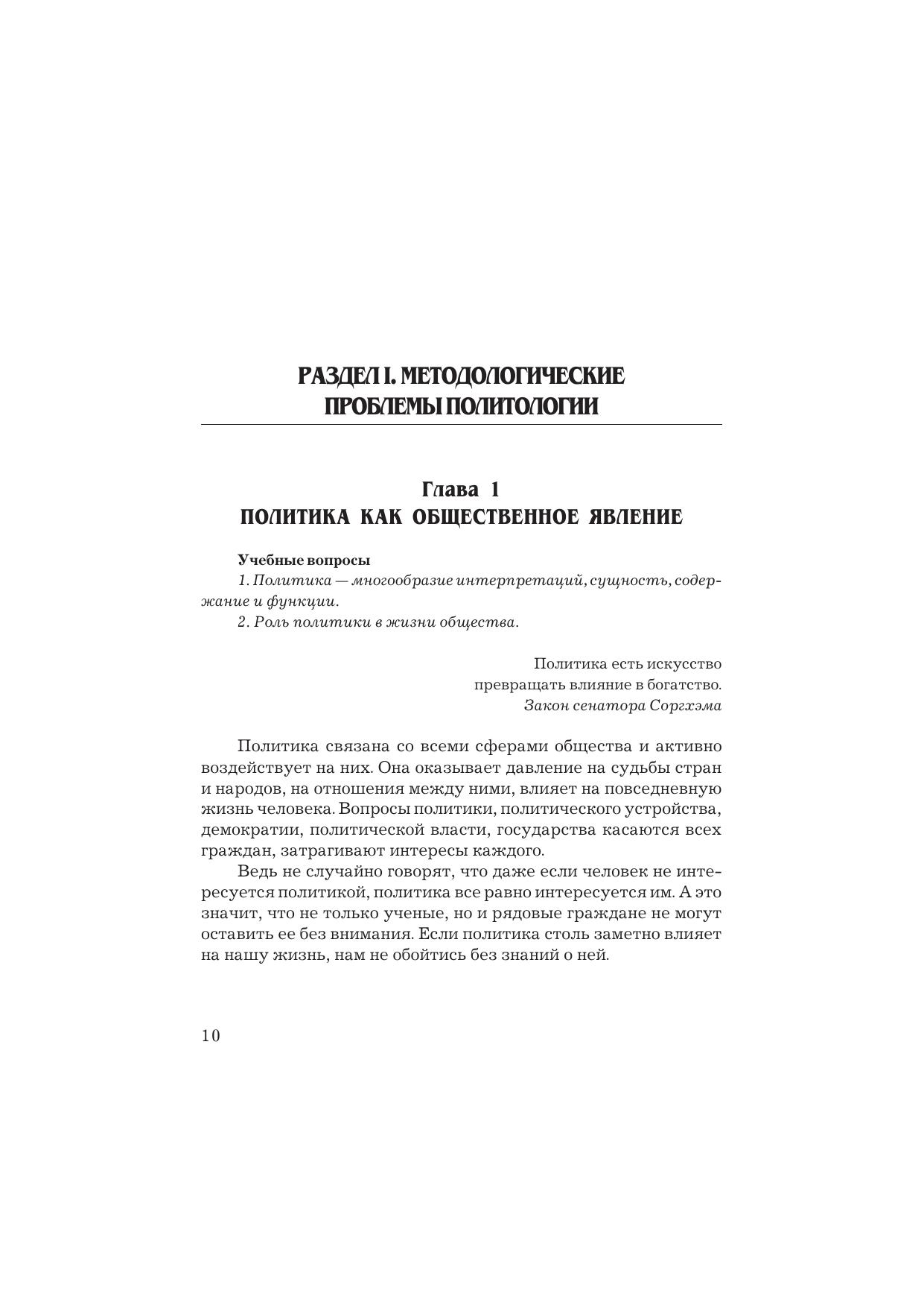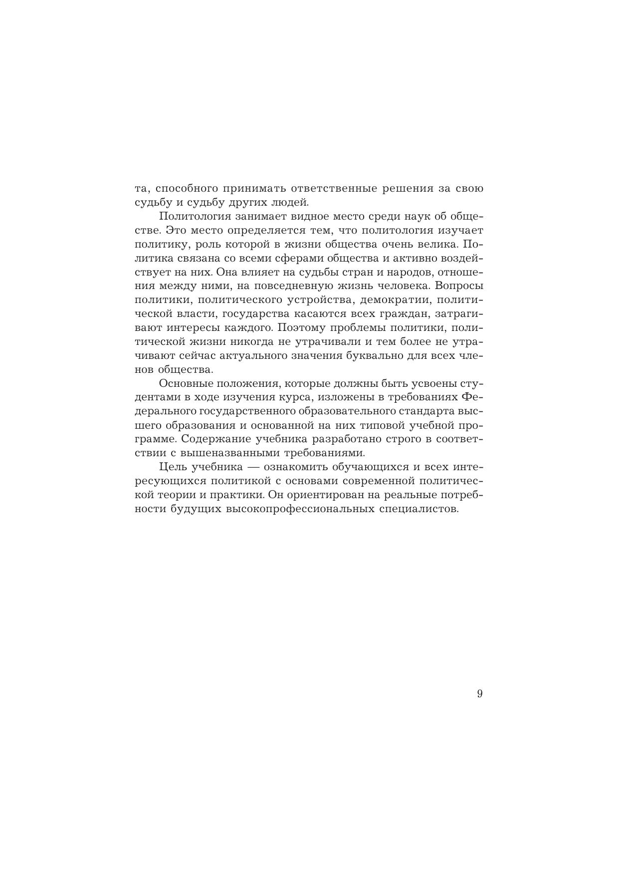 В учебнике излагаются основные положения курса “Политология”. Содержание отвечает типовой программе Федерального государственного образовательного стандарта третьего поколения учебной дисциплины “Политология” и раскрывает сущность и содержание основных компетенций и дидактических единиц. В учебнике дается общее представление о современной политологии и проблемах ее развития. Освещаются важнейшие темы, имеющие интерес для обучаемых по всем специальностям высшей профессиональной школы. Работа базируется на учебно&методической и справочной литературе по политологии, материалах, раскрывающих мировой и отечественный опыт, реалиях нынешнего этапа общественно-политического развития. Для студентов бакалавриата и специалитета, обучающихся по направлениям подготовки “Управление персоналом”, “Государственное и муниципальное управление”, преподавателей вузов, руководящих работников, государственных служащих, а также всех, кто интересуется политикой.