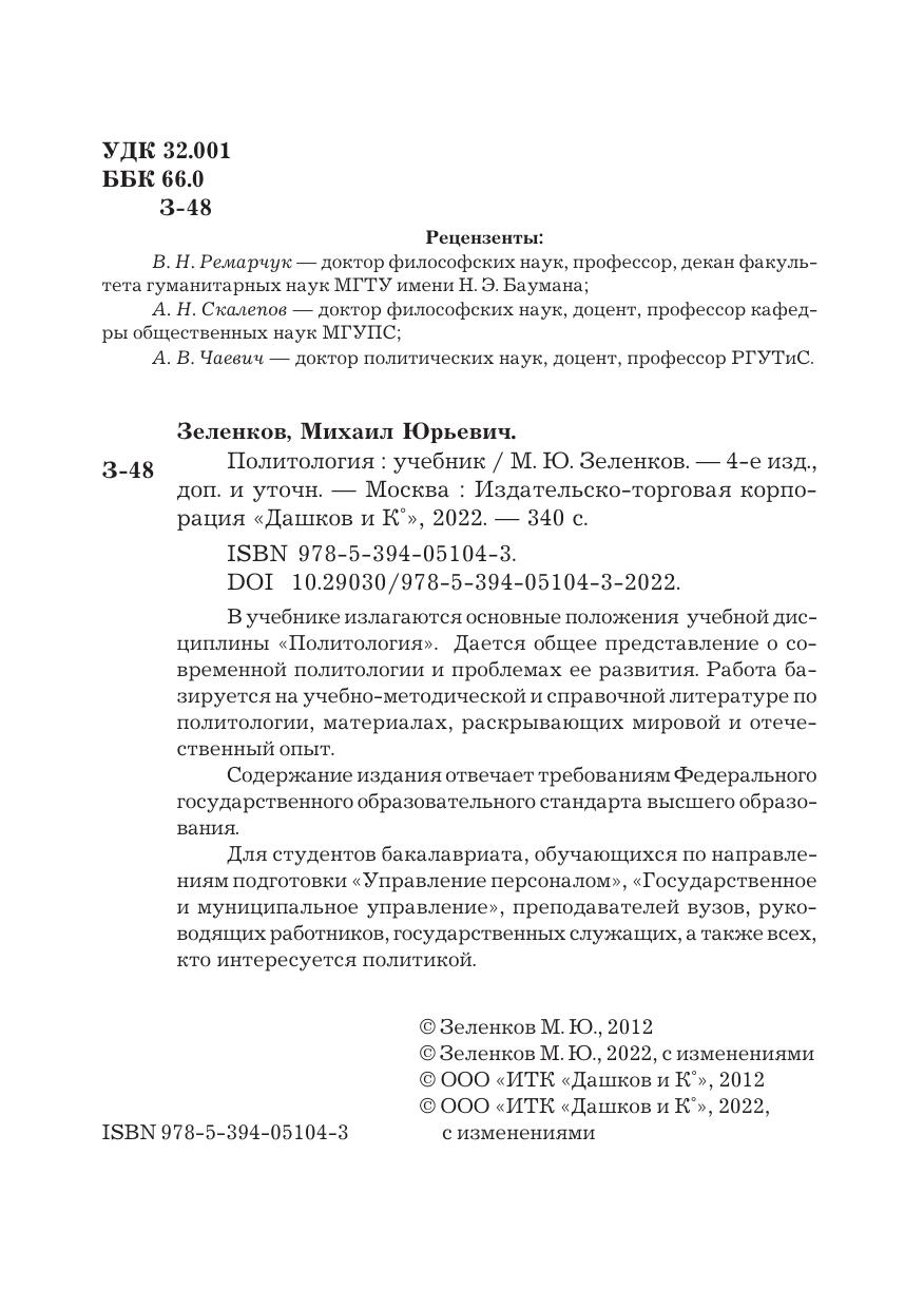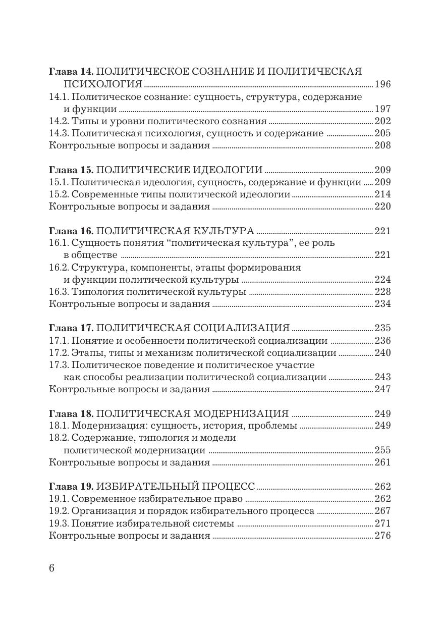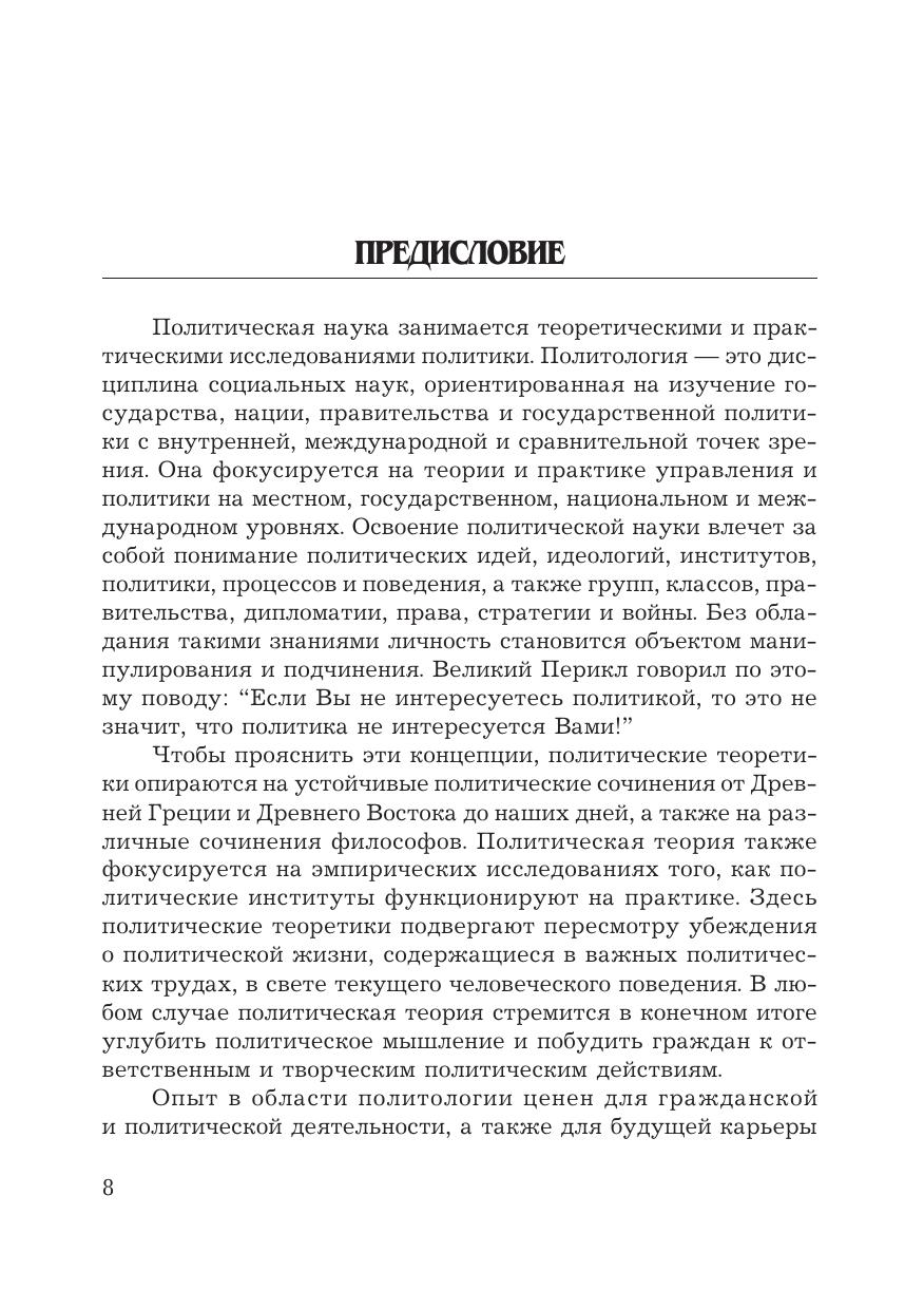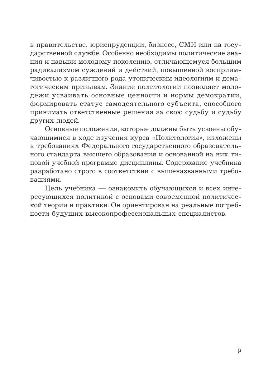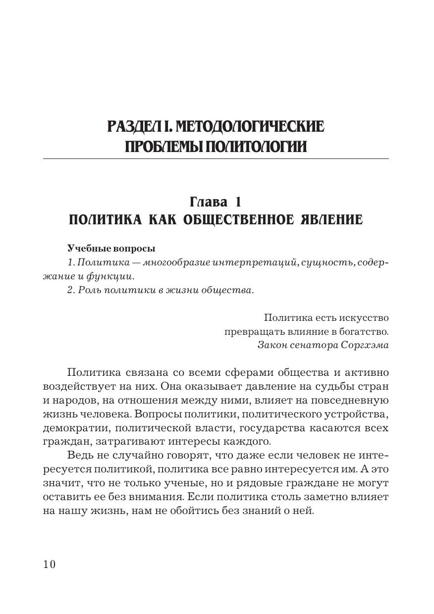 В учебнике излагаются основные положения курса “Политология”. Содержание отвечает типовой программе Федерального государственного образовательного стандарта третьего поколения учебной дисциплины “Политология” и раскрывает сущность и содержание основных компетенций и дидактических единиц. В учебнике дается общее представление о современной политологии и проблемах ее развития. Освещаются важнейшие темы, имеющие интерес для обучаемых по всем специальностям высшей профессиональной школы. Работа базируется на учебно&методической и справочной литературе по политологии, материалах, раскрывающих мировой и отечественный опыт, реалиях нынешнего этапа общественно-политического развития. Для студентов бакалавриата и специалитета, обучающихся по направлениям подготовки “Управление персоналом”, “Государственное и муниципальное управление”, преподавателей вузов, руководящих работников, государственных служащих, а также всех, кто интересуется политикой.