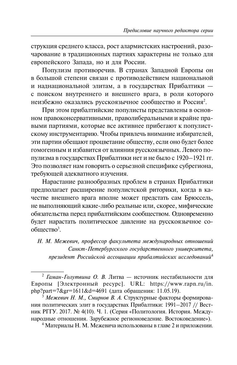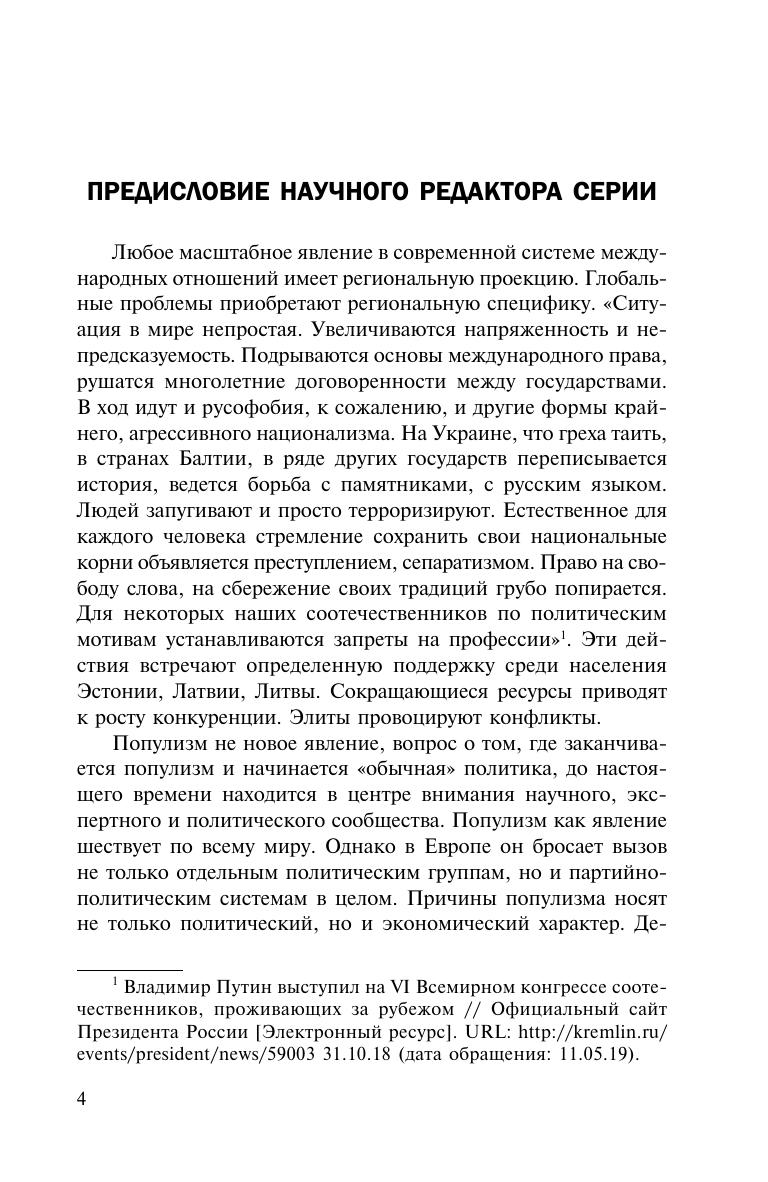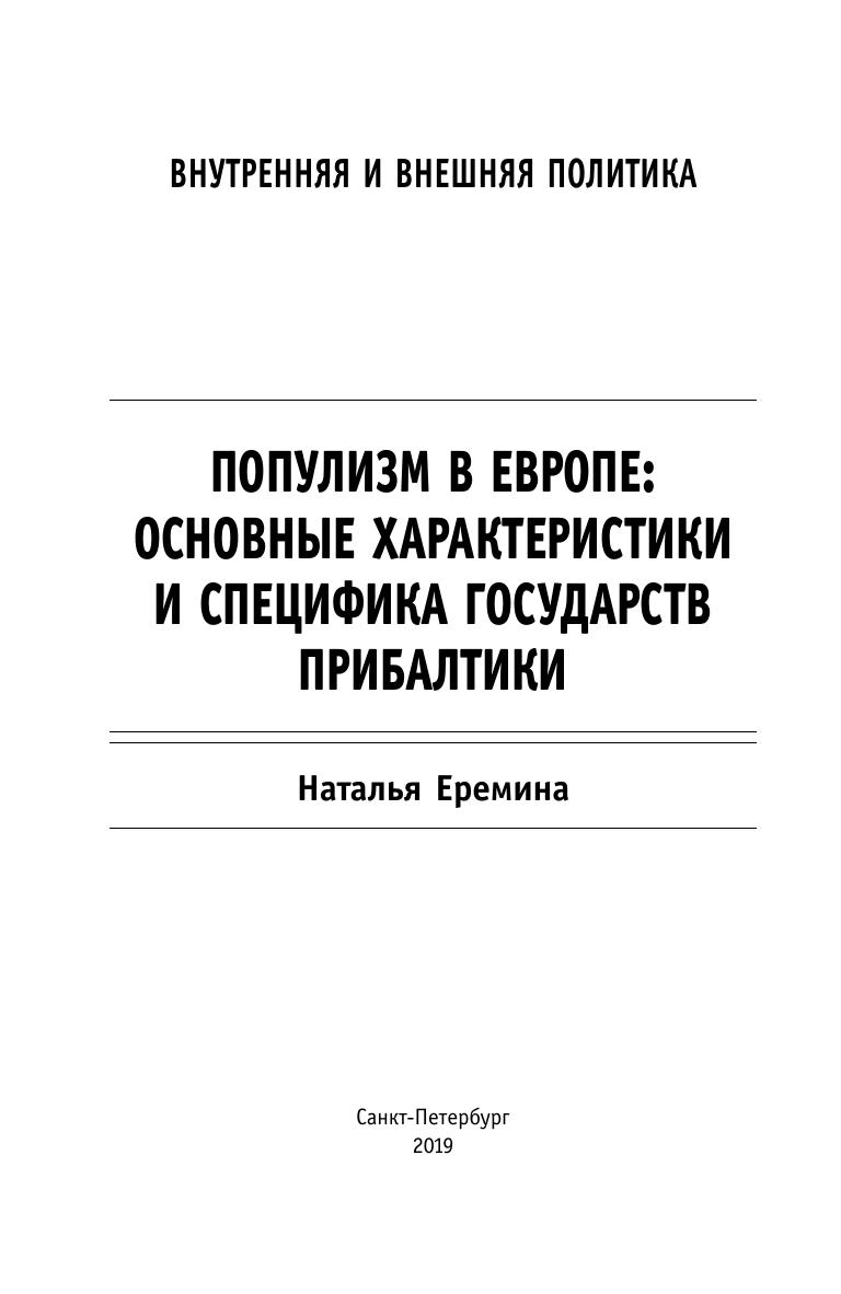 В докладе представлены различные форматы популизма — явления, связанного с политтехнологиями, предвыборными кампаниями и политической деятельностью в целом, ставшего значимым в идеологии и практике различных партий, особенно крайне правых. Понимание причин роста популизма как устойчивого политического тренда, а также его форм важно в контексте прогнозирования развития политической ситуации в различных странах Европы. Рассмотрены причины возникновения популизма, его влияние на электоральные успехи партий. Исследованы особенности популизма в государствах Прибалтики, где принцип русофобии проник почти во все партийные идеологии. Издание предназначено для студентов и преподавателей политологического направления, а также для представителей внешнеполитических ведомств и всех, кто интересуется политическими процессами в Европе.