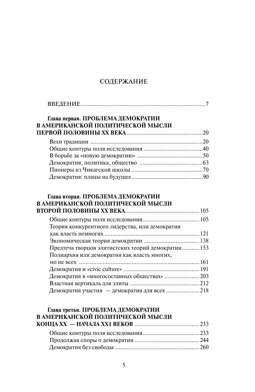 В работе прослеживается эволюция взглядов американских политологов и философов на демократию на протяжении минувшего столетия, рассматриваются идеи и концепции таких крупных демократологов, как Гэбриел Алмонд, Сидни Верба, Роберт Даль, Энтони Даунс, Гаролд Лассуэлл, Сеймур Липсет, Чарлз Мерриам, Йозеф Шумпетер, и других.