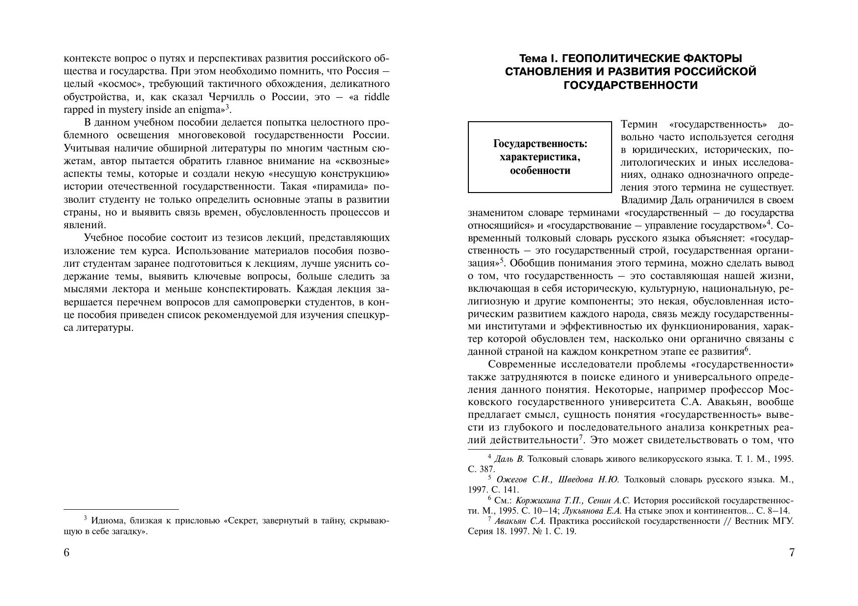 В пособии предоставлен материал, раскрывающий эволюцию российской государственности за более чем тысячелетнюю историю, природу самобытности исторического пути России и место ее в контексте мировой цивилизации. Ведется поиск ответов на дискуссионные вопросы. Для студентов, аспирантов и преподавателей юридических и иных общественно-политических факультетов вузов.