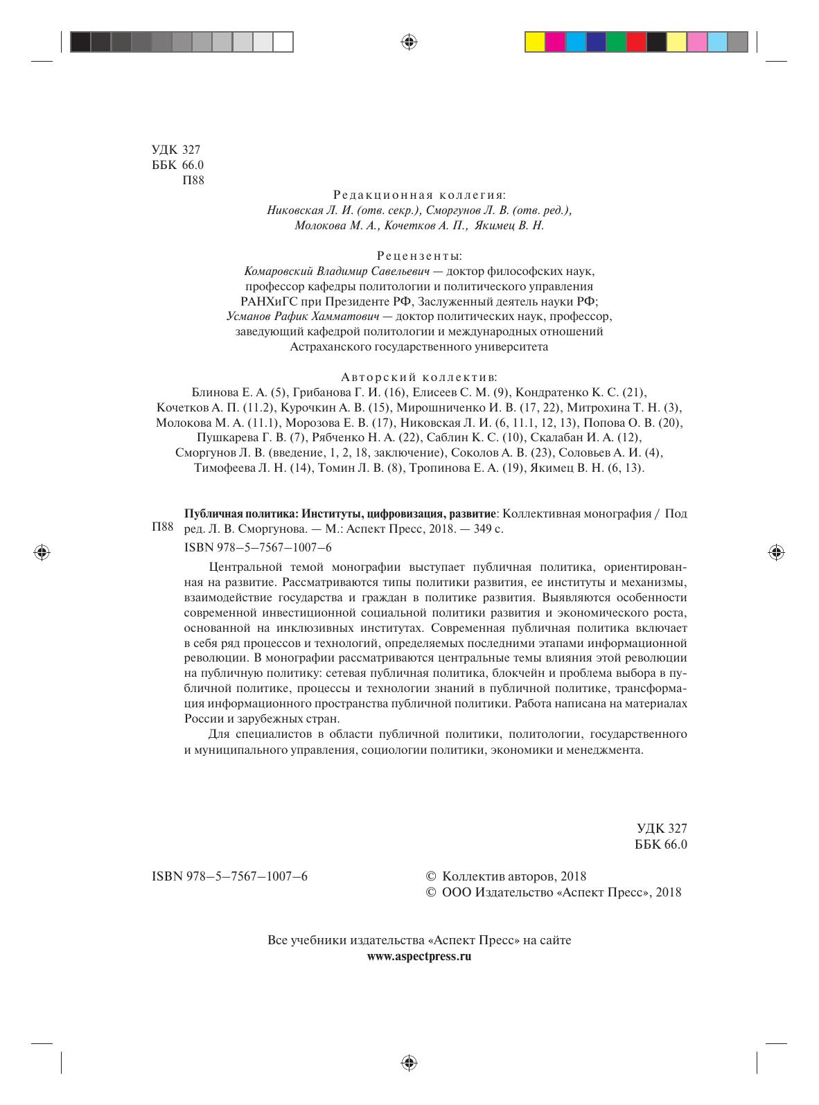 Центральной темой монографии выступает публичная политика, ориентированная на развитие. Рассматриваются типы политики развития, ее институты и механизмы, взаимодействие государства и граждан в политике развития. Выявляются особенности современной инвестиционной социальной политики развития и экономического роста, основанной на инклюзивных институтах. Современная публичная политика включает в себя ряд процессов и технологий, определяемых последними этапами информационной революции. В монографии рассматриваются центральные темы влияния этой революции на публичную политику: сетевая публичная политика, блокчейн и проблема выбора в публичной политике, процессы и технологии знаний в публичной политике, трансформация информационного пространства публичной политики. Работа написана на материалах России и зарубежных стран. Для специалистов в области публичной политики, политологии, государственного и муниципального управления, социологии политики, экономики и менеджмента.